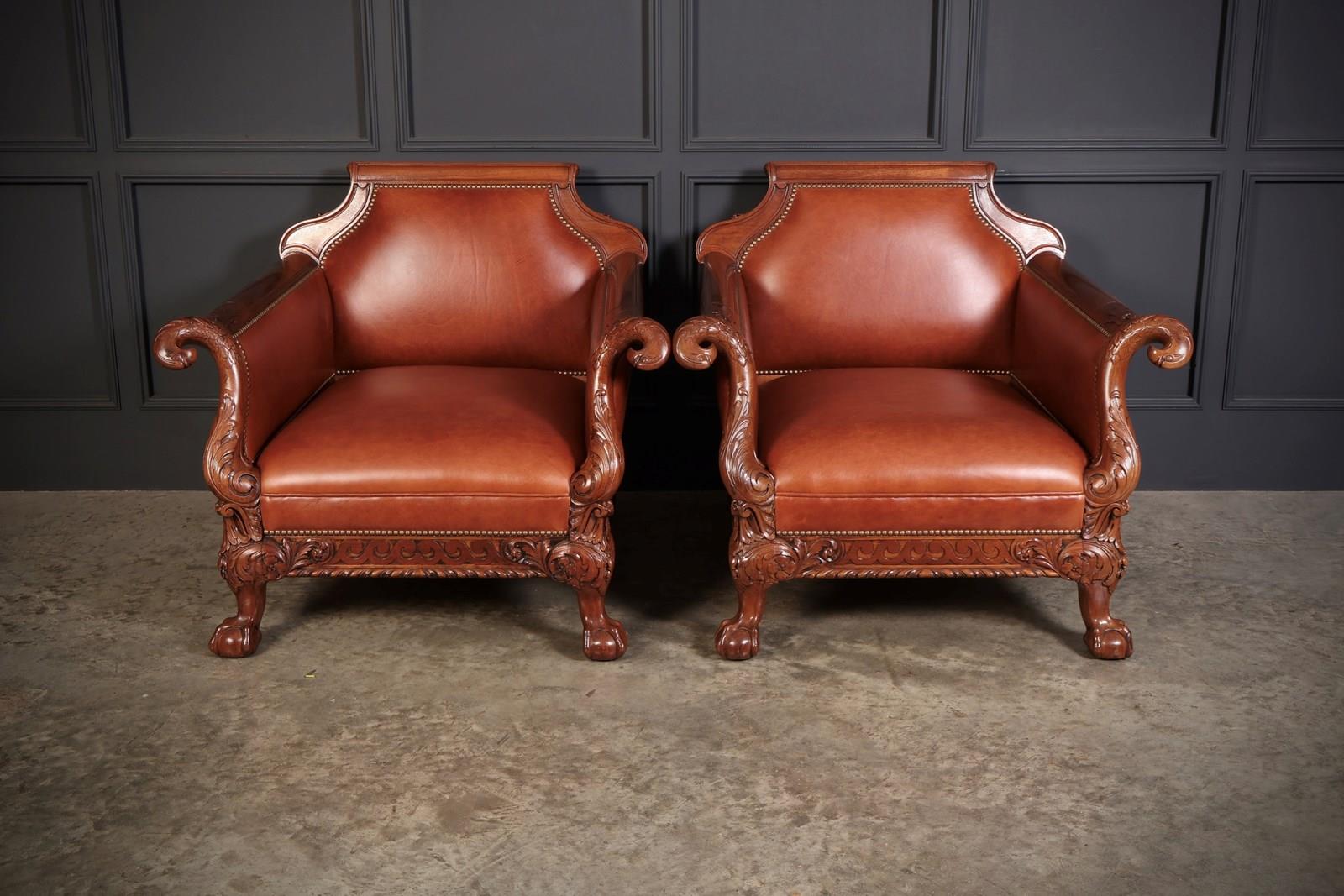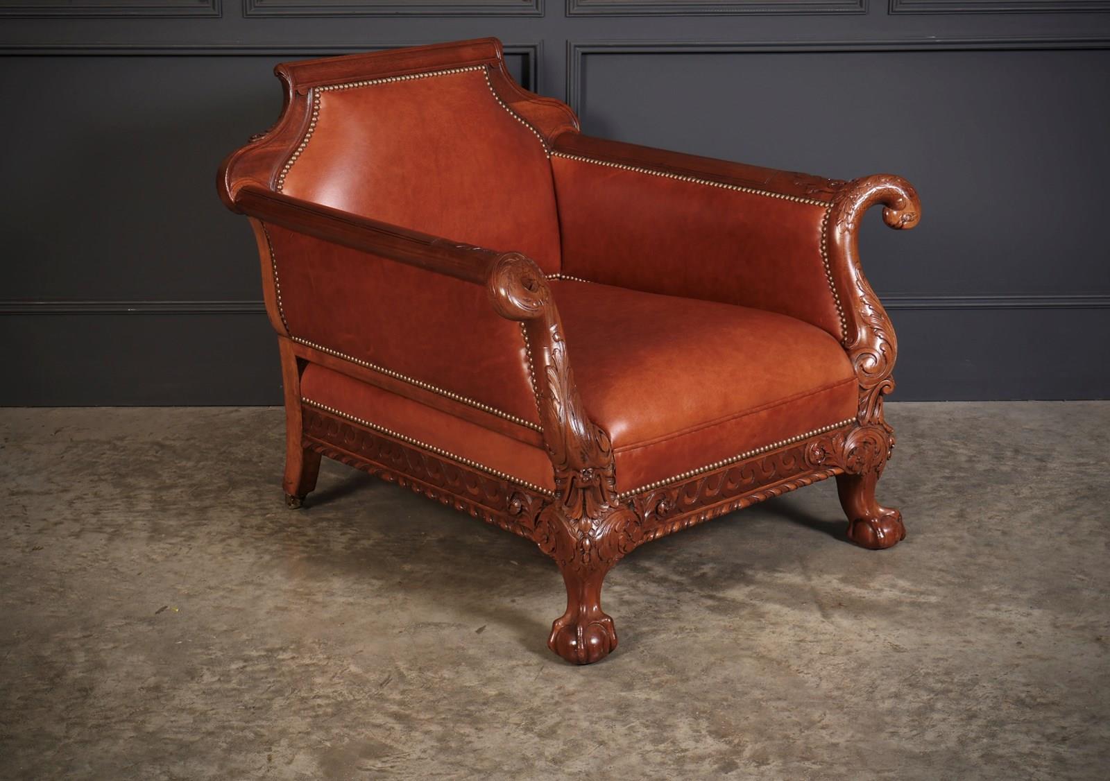A superb English mahogany three-piece suite, circa 1900, comprising two generous armchairs and a matching large sofa.