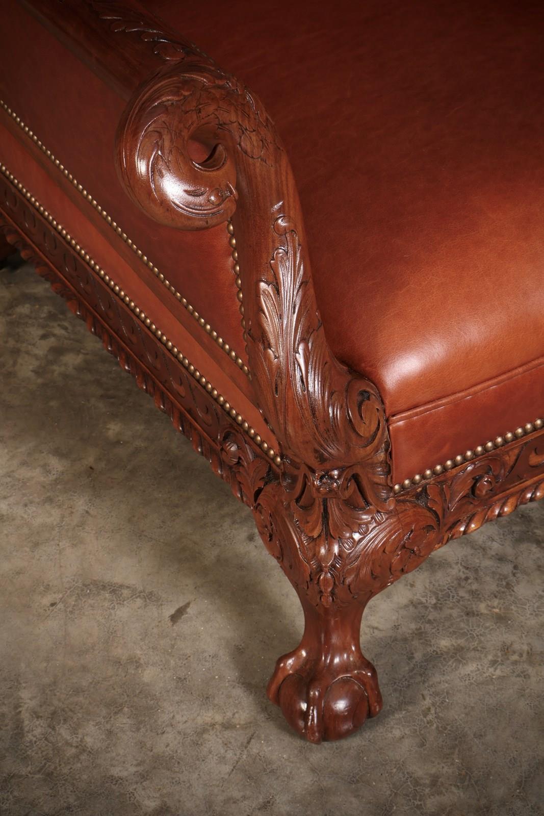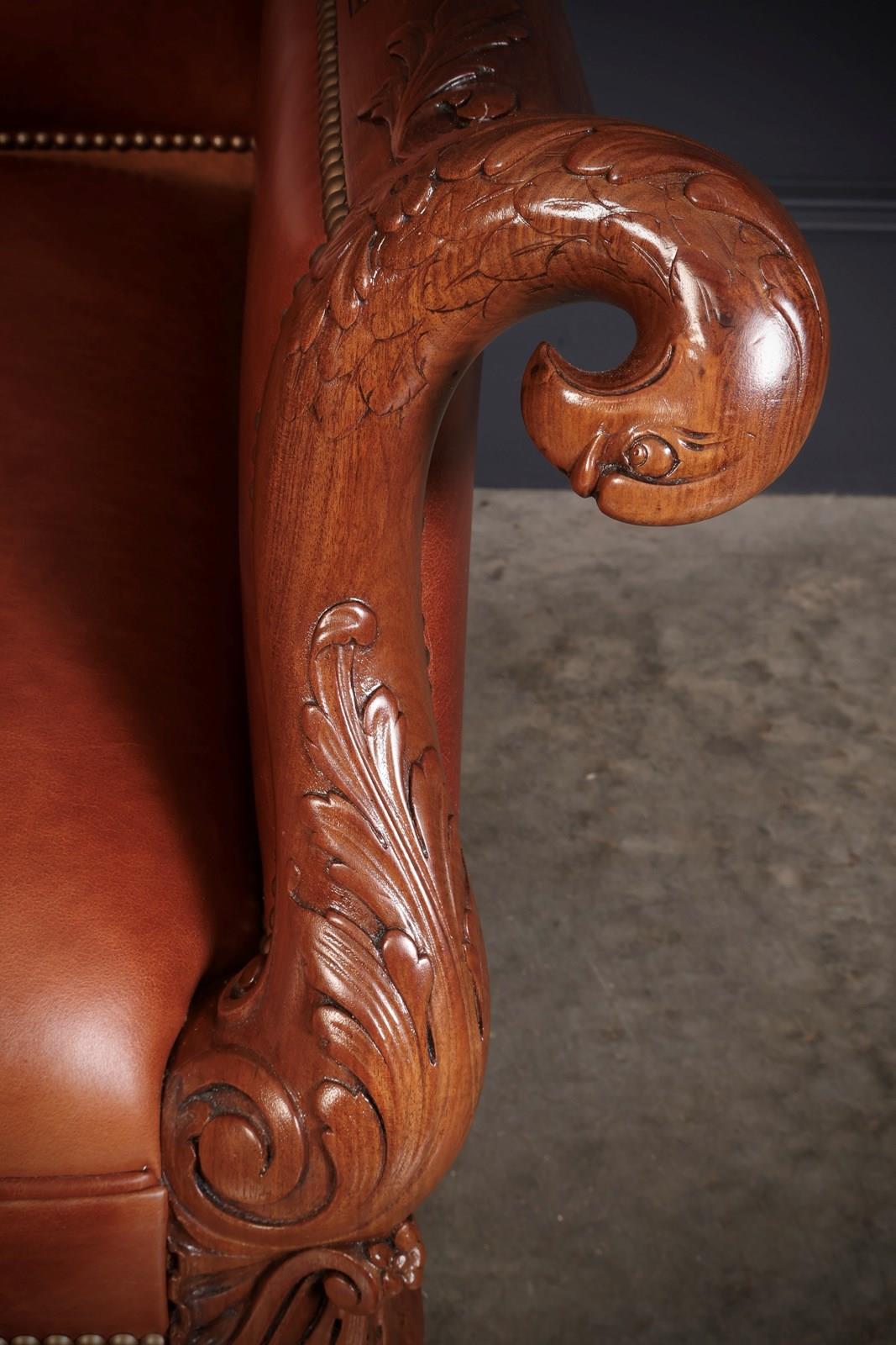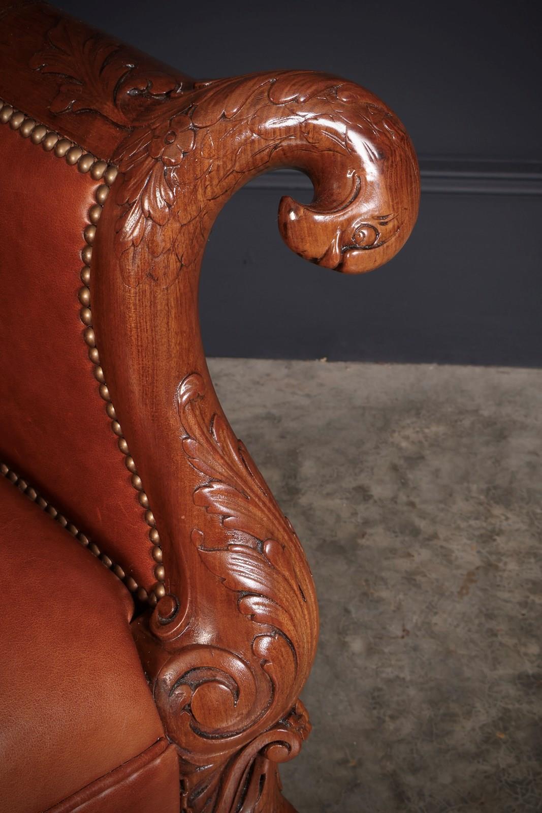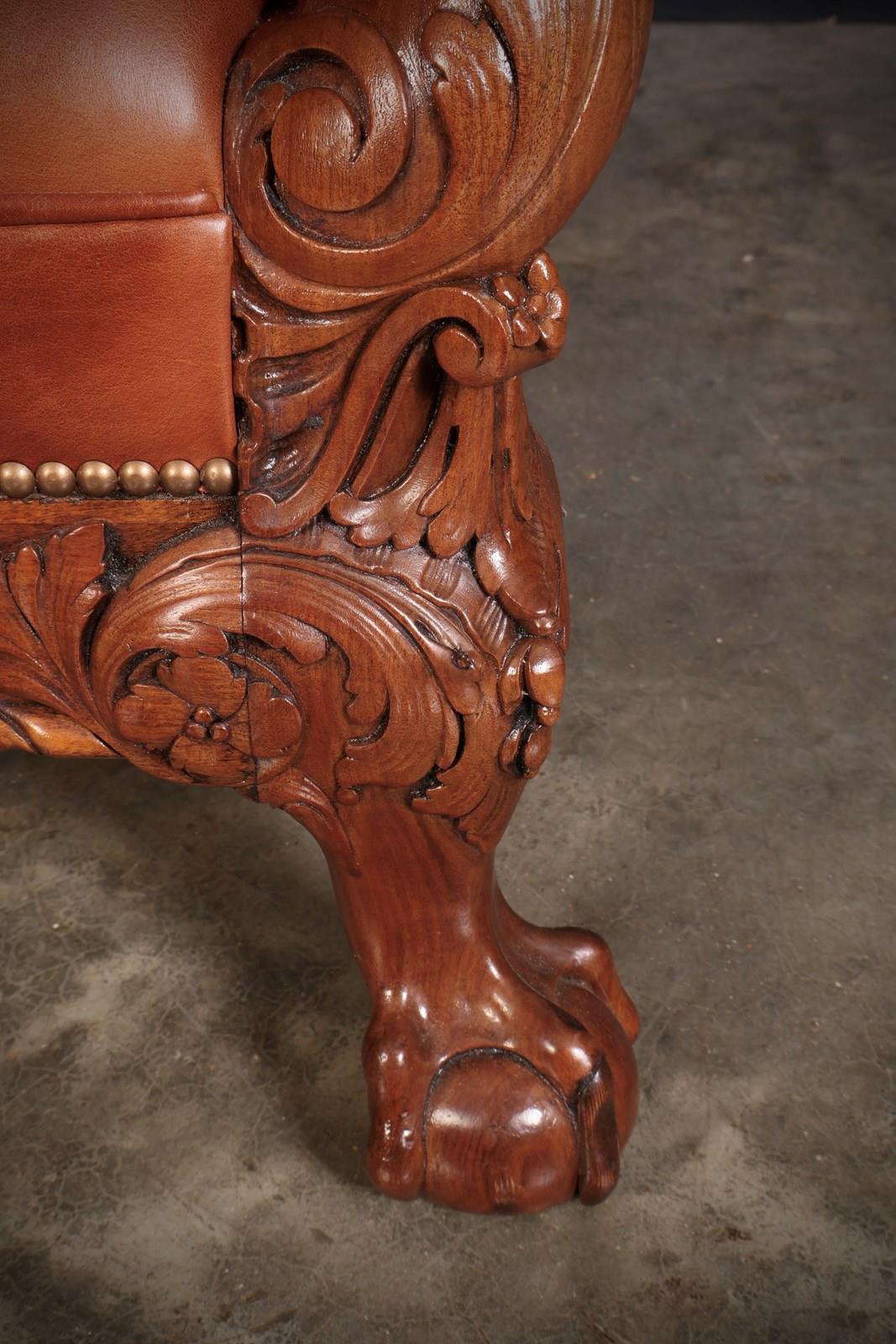 The solid mahogany frames feature an elegantly carved frieze and remarkable scroll arms adorned with finely detailed bird carvings. Each piece stands on cabriole legs with classic ball-and-claw feet, with casters fitted to the rear legs for ease of movement.