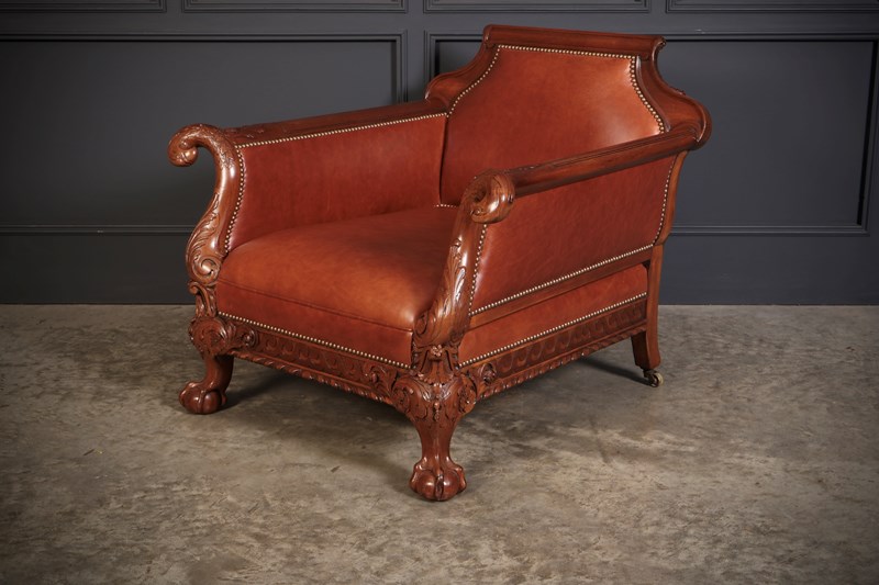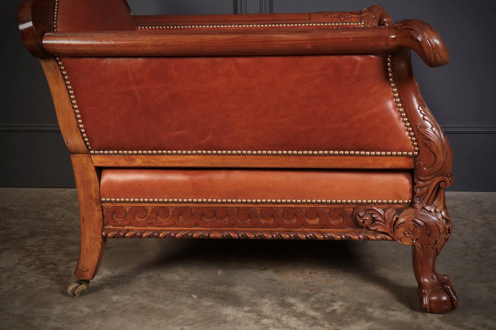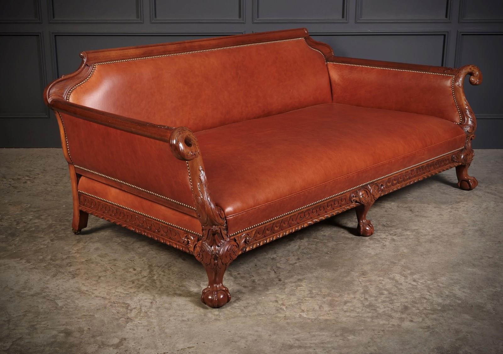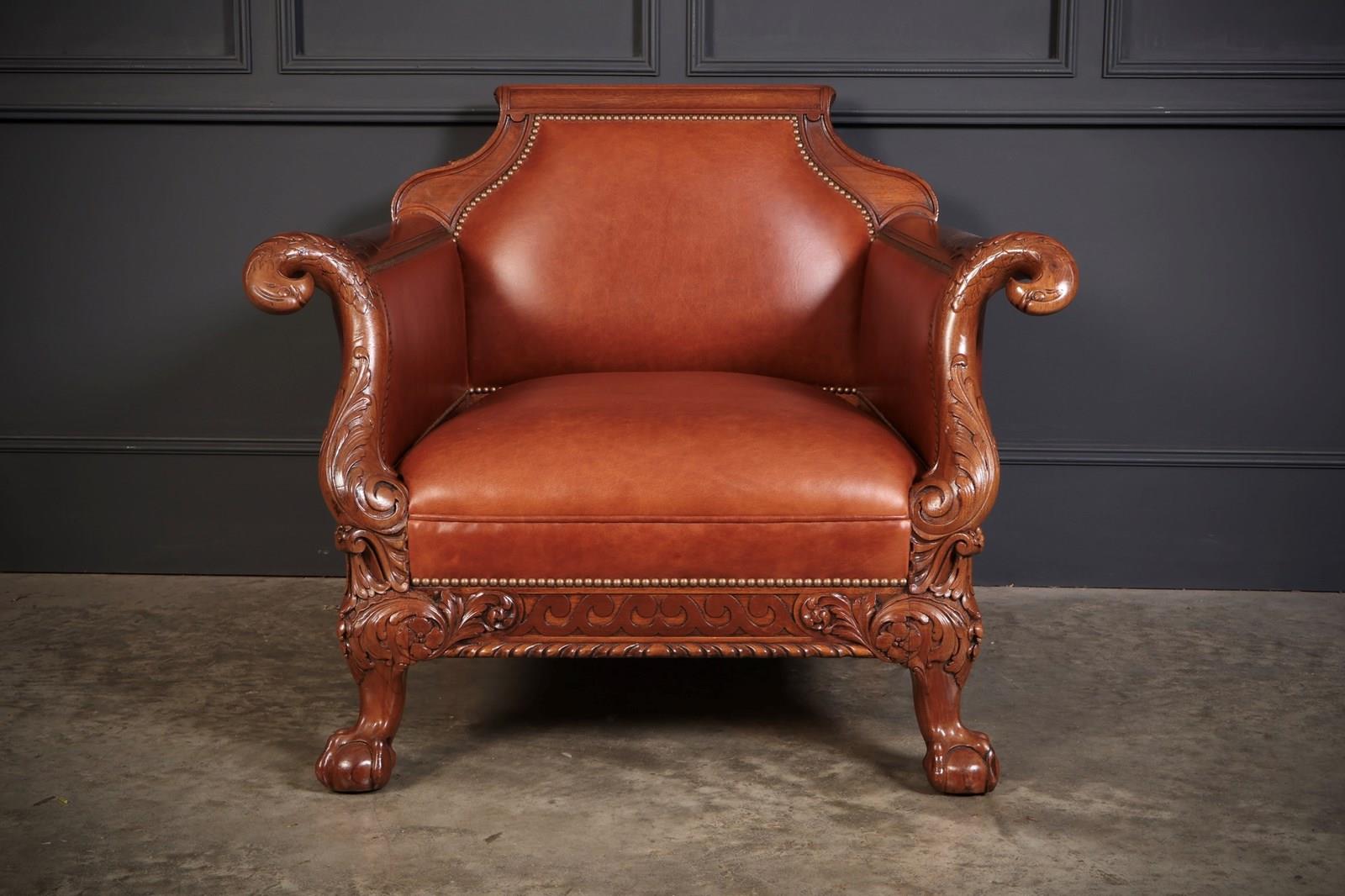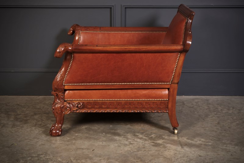 The solid mahogany frames feature an elegantly carved frieze and remarkable scroll arms adorned with finely detailed bird carvings. Each piece stands on cabriole legs with classic ball-and-claw feet, with casters fitted to the rear legs for ease of movement.