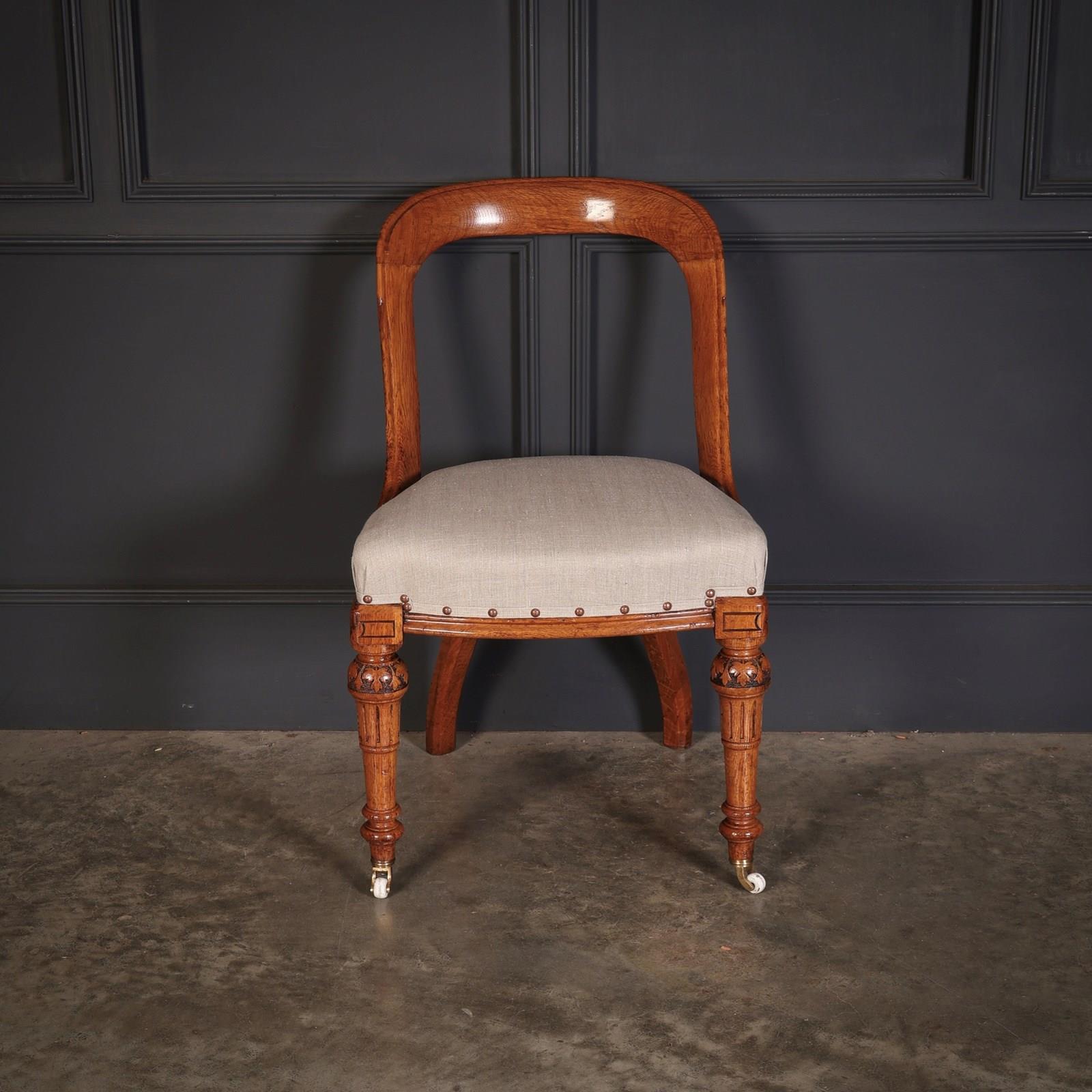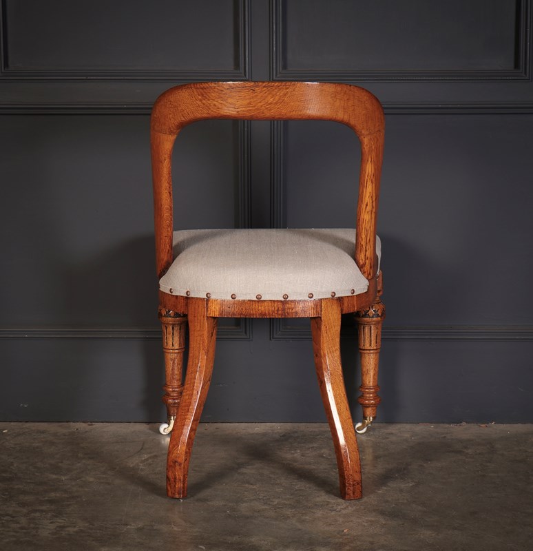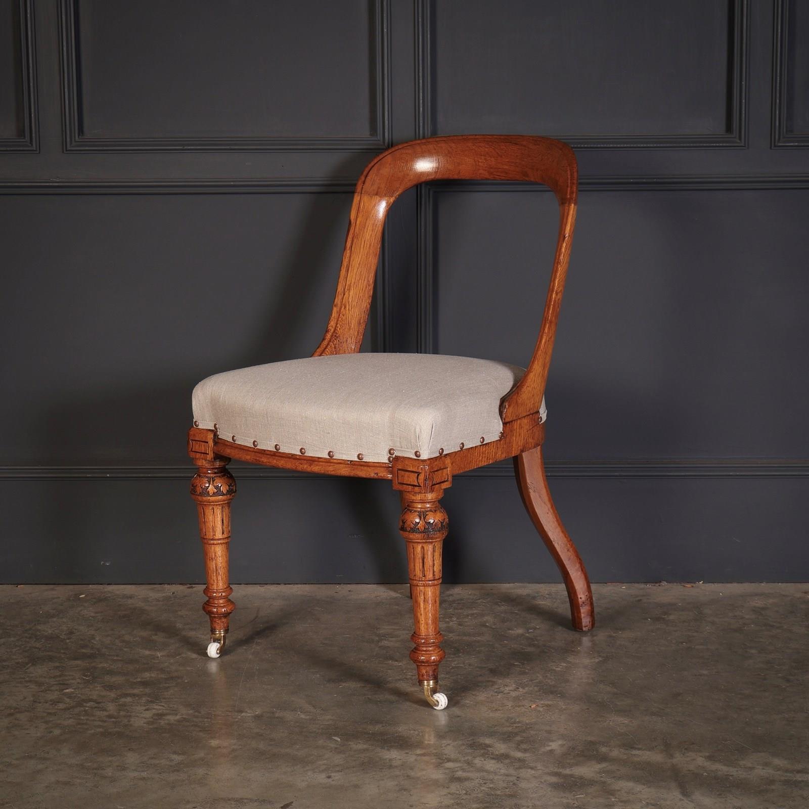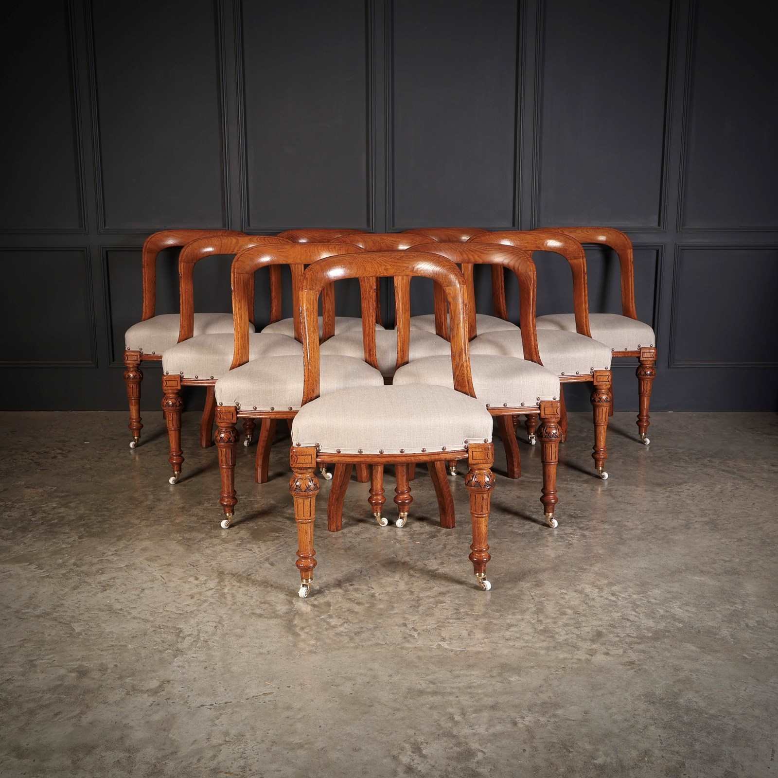 A superb set of ten Victorian dining chairs, crafted in richly figured pollard oak of excellent colour and grain.