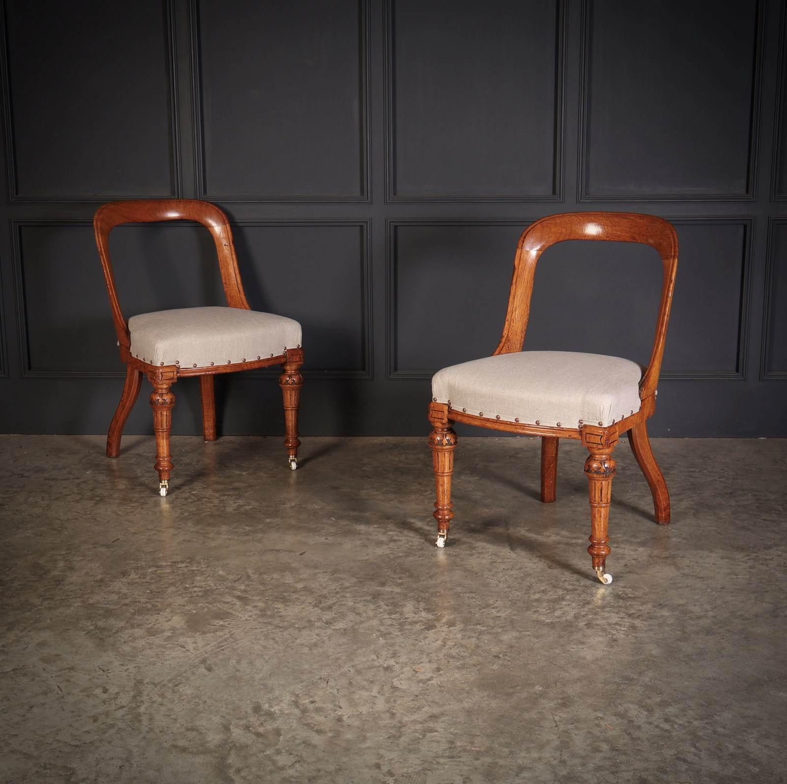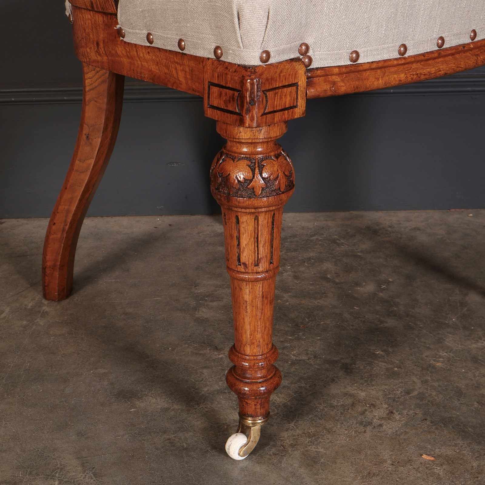 The seats have been newly upholstered in a smart neutral/grey linen, secured with traditional studwork for a crisp finish.