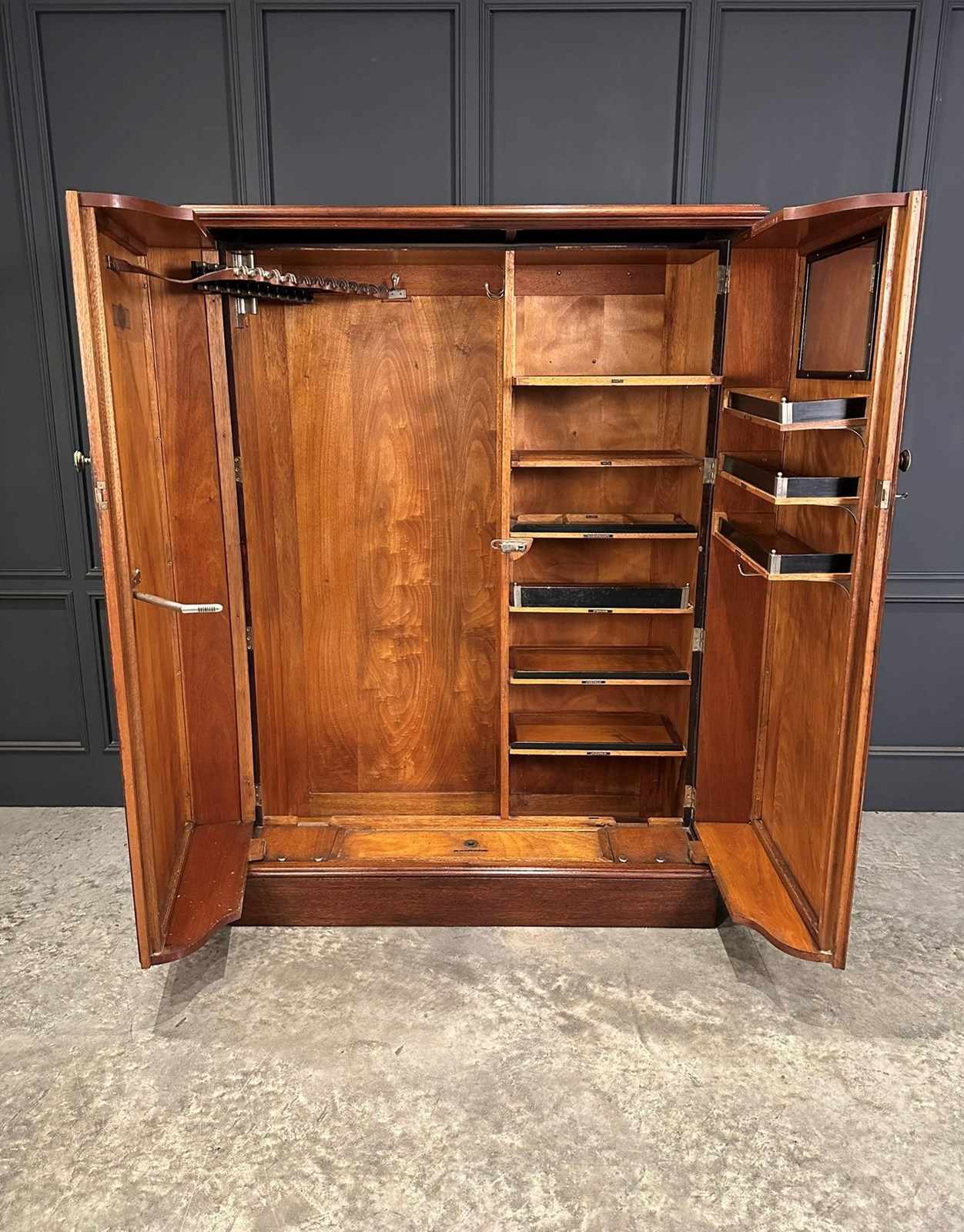 The interior is thoughtfully arranged, featuring a hanging section, alongside a series of graduated shelves and pull-out compartments, with additional storage fitted to the doors and a mirror. Retaining its original hardware and fittings, this wardrobe offers impressive storage in a compact footprint.