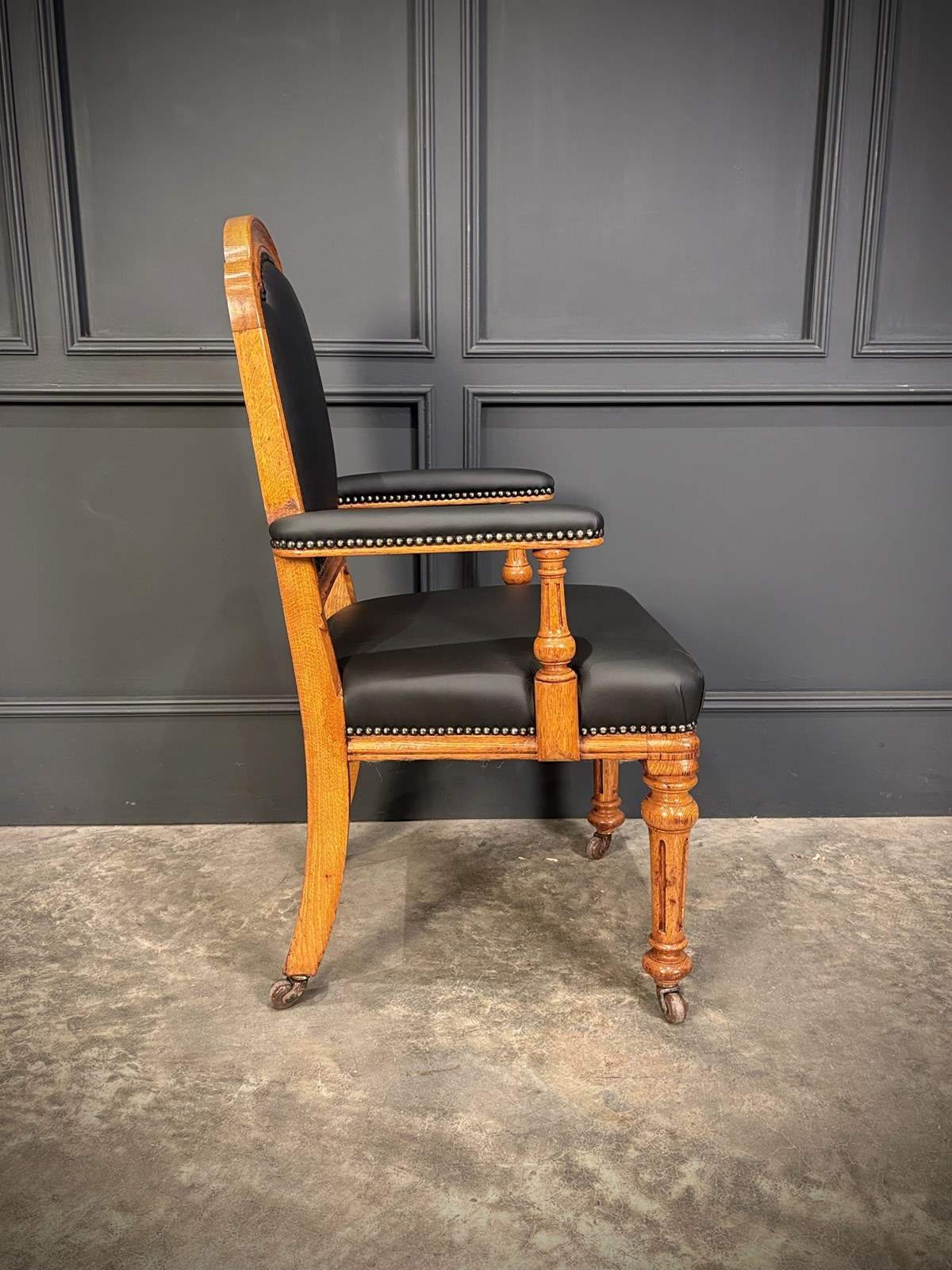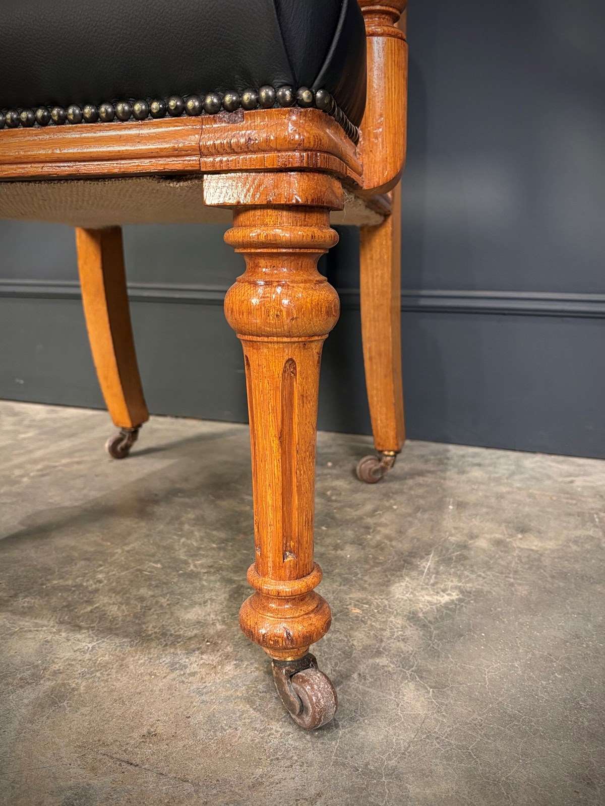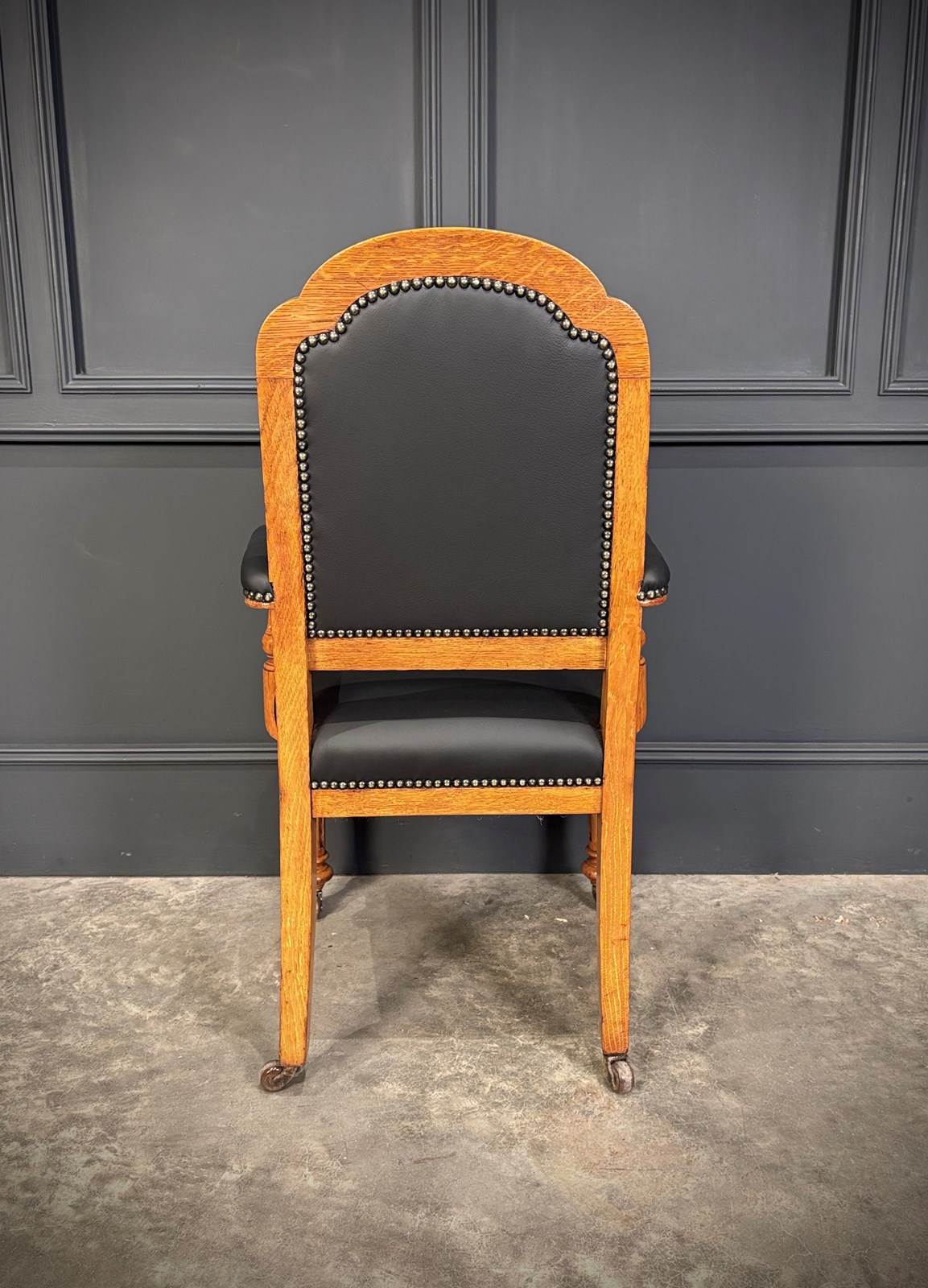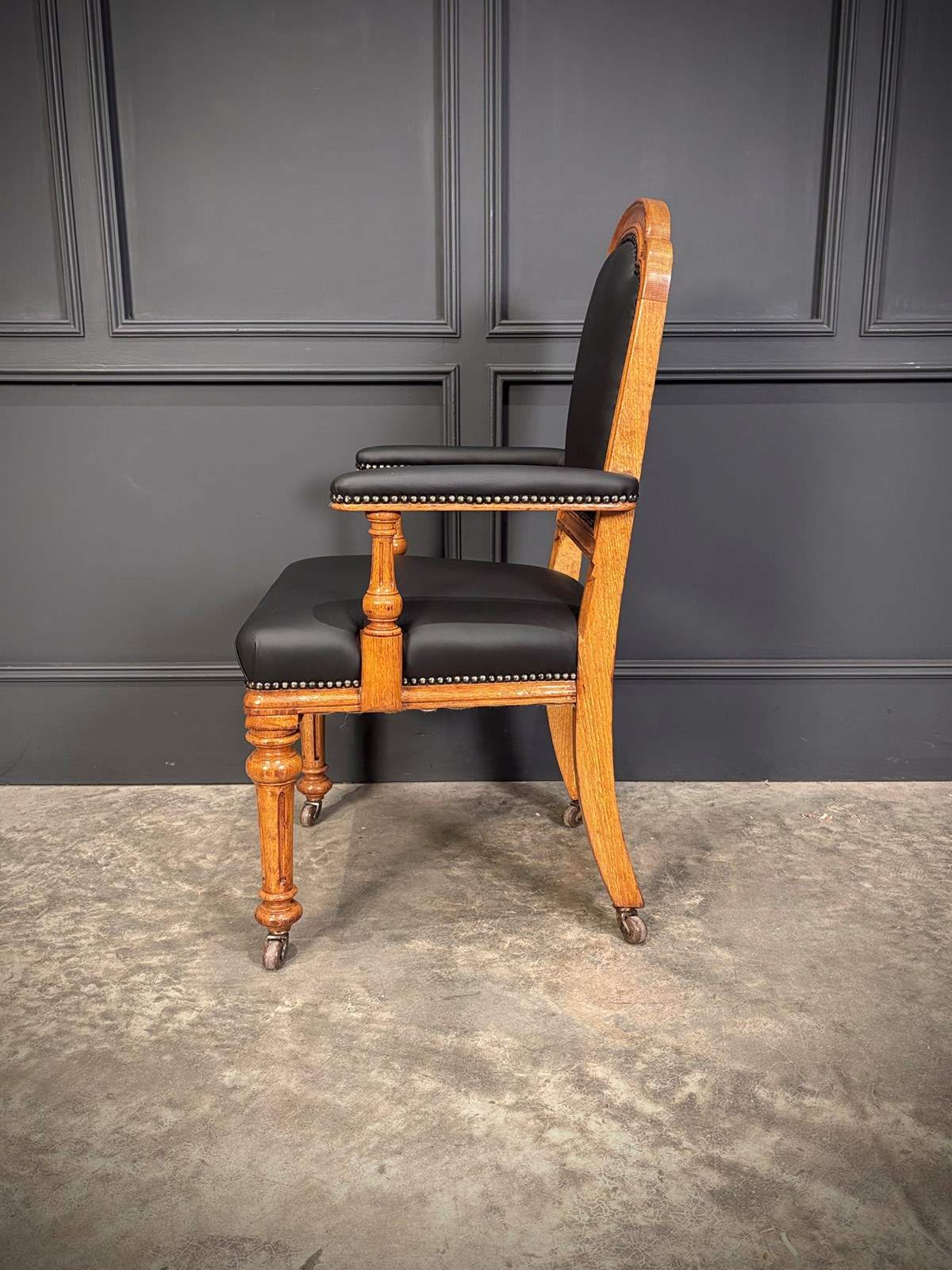 The solid oak frame has matured to a beautiful mellow honey tone and is complemented by newly upholstered, rich black leather of excellent quality, providing both comfort and durability while enhancing the chair’s elegant lines.