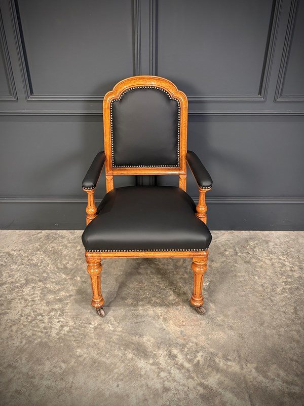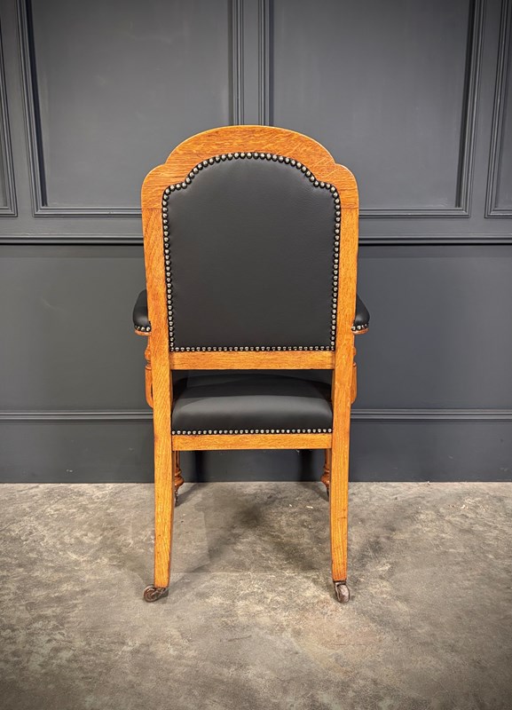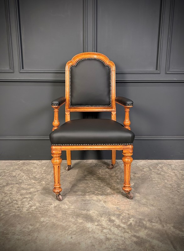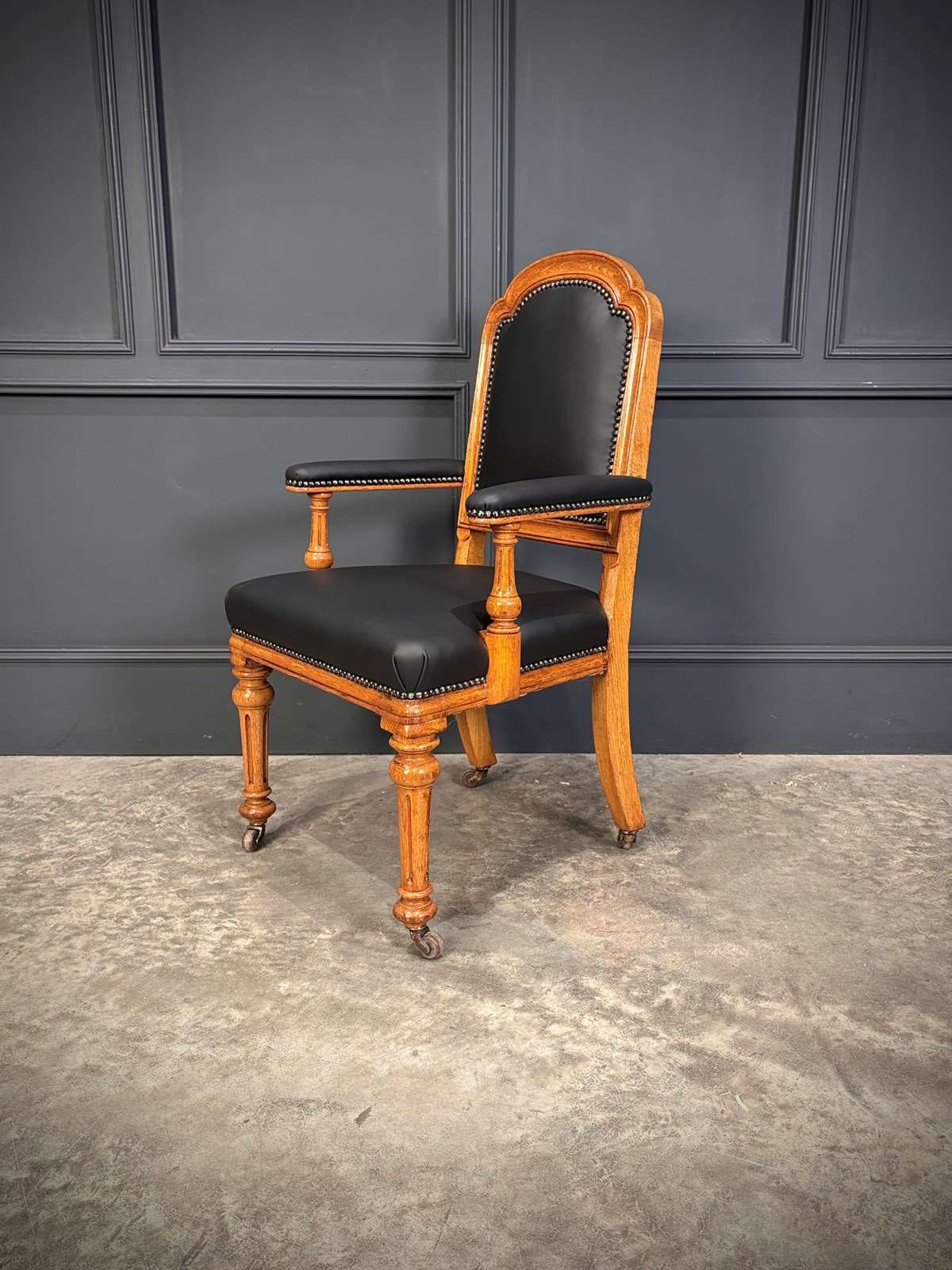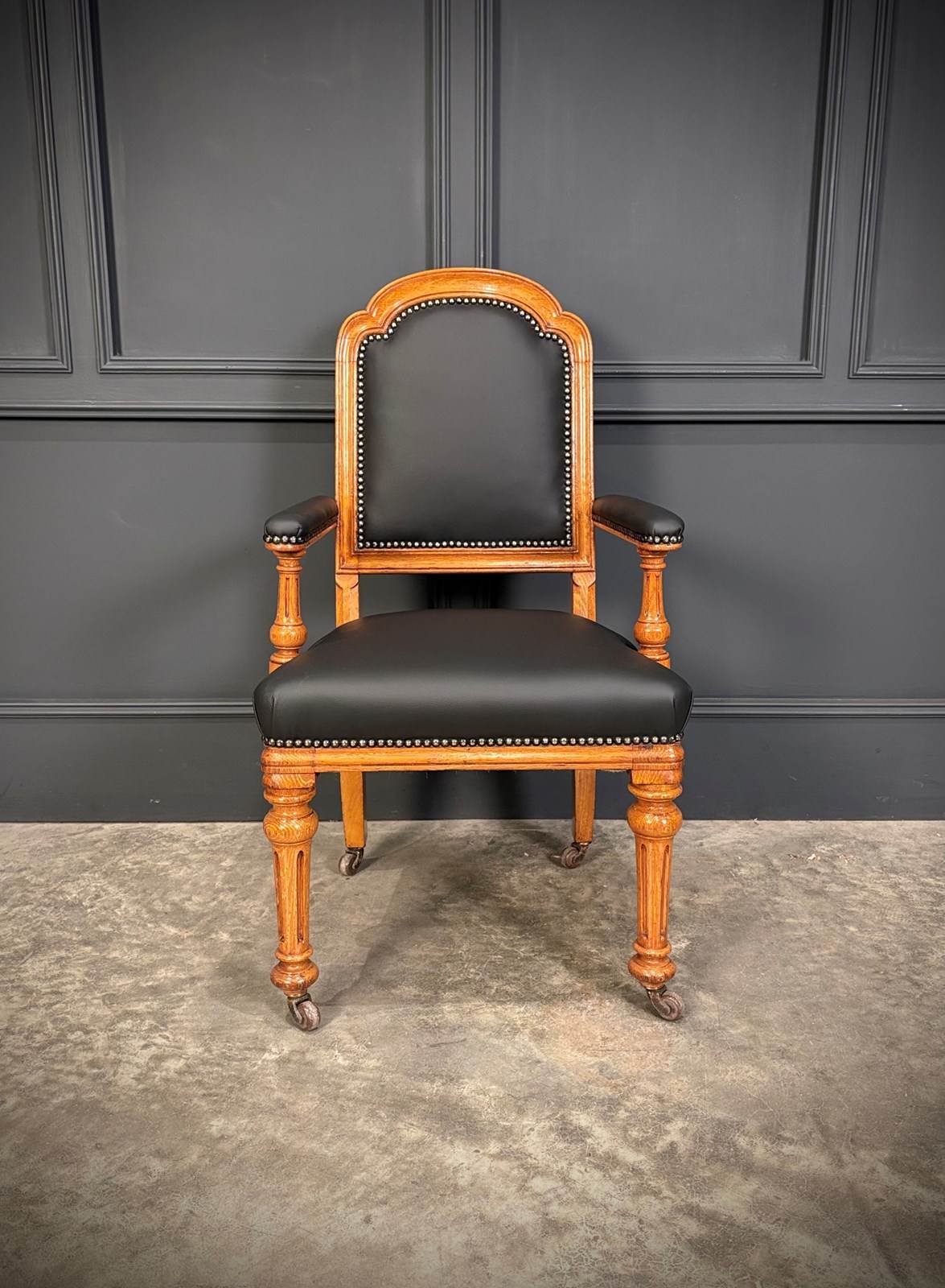 The solid oak frame has matured to a beautiful mellow honey tone and is complemented by newly upholstered, rich black leather of excellent quality, providing both comfort and durability while enhancing the chair’s elegant lines.