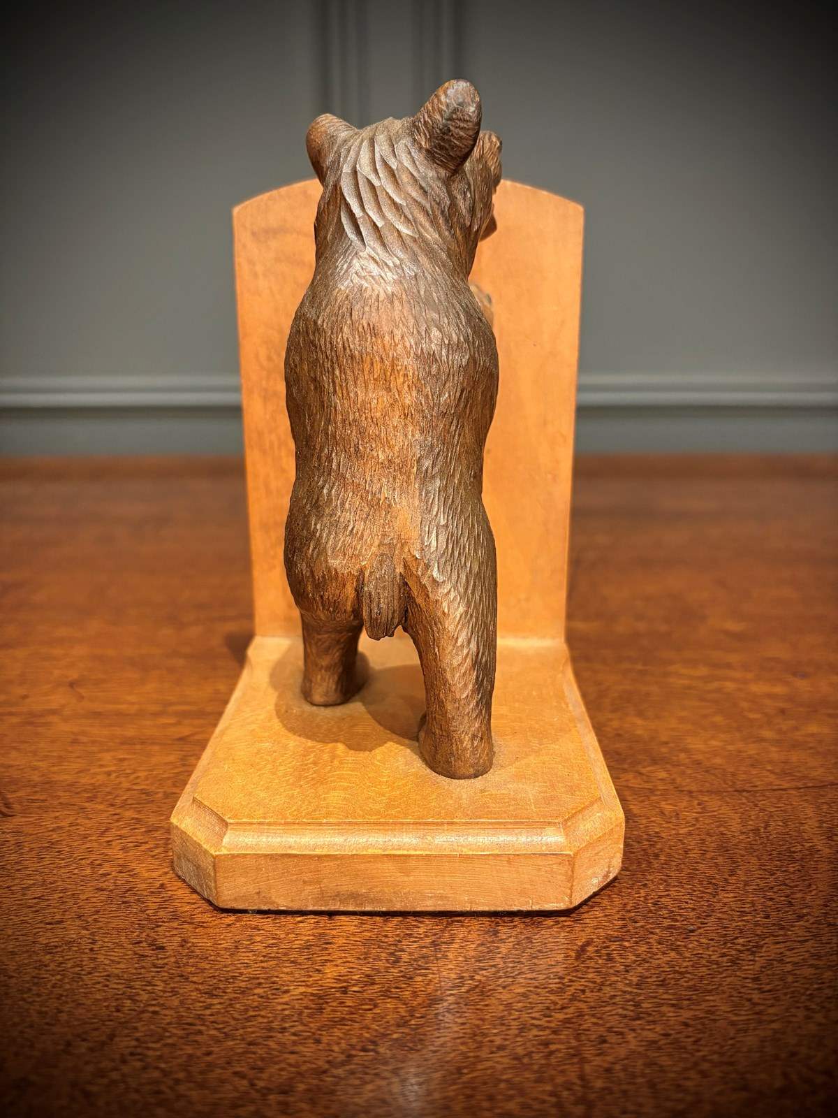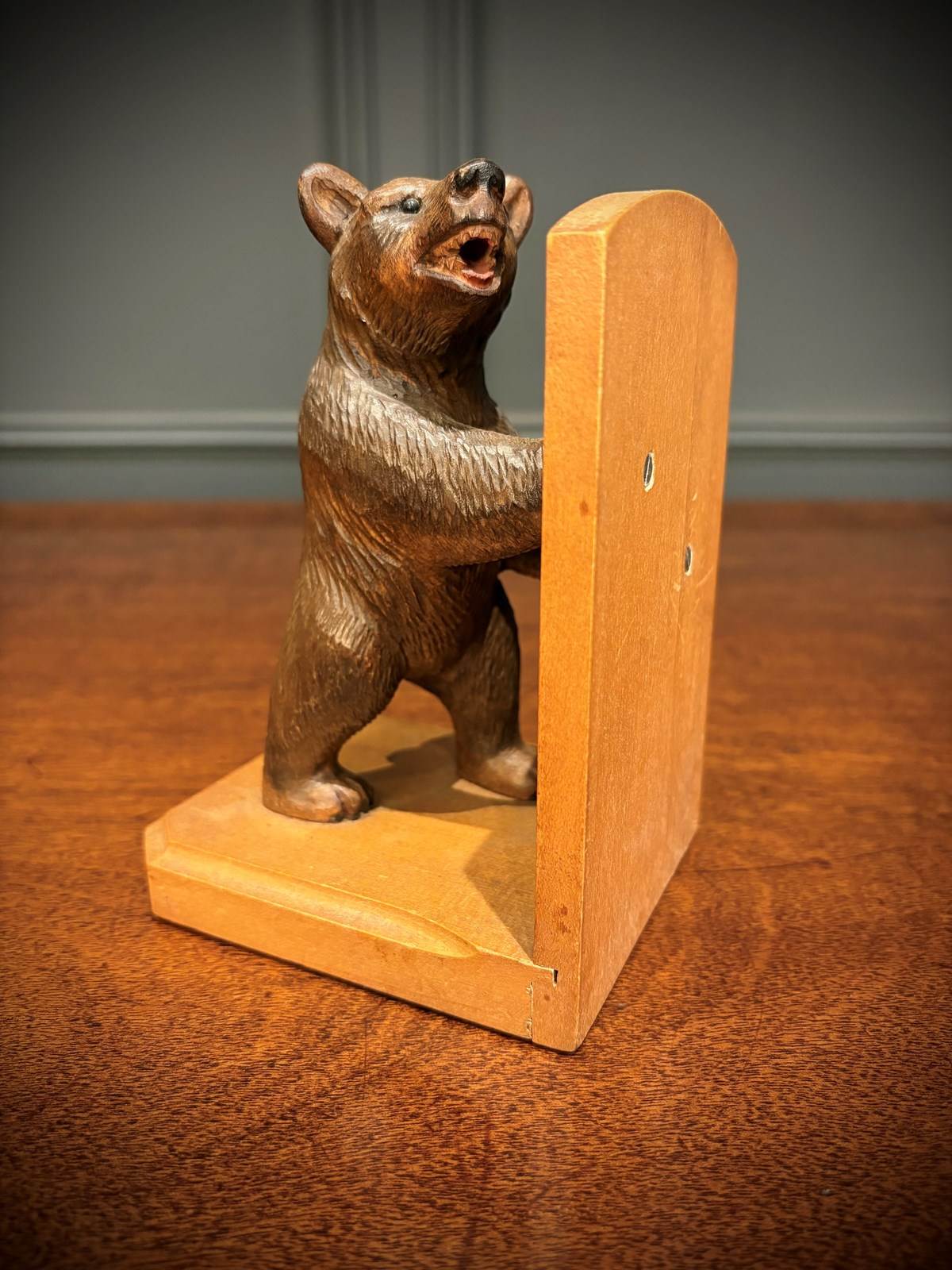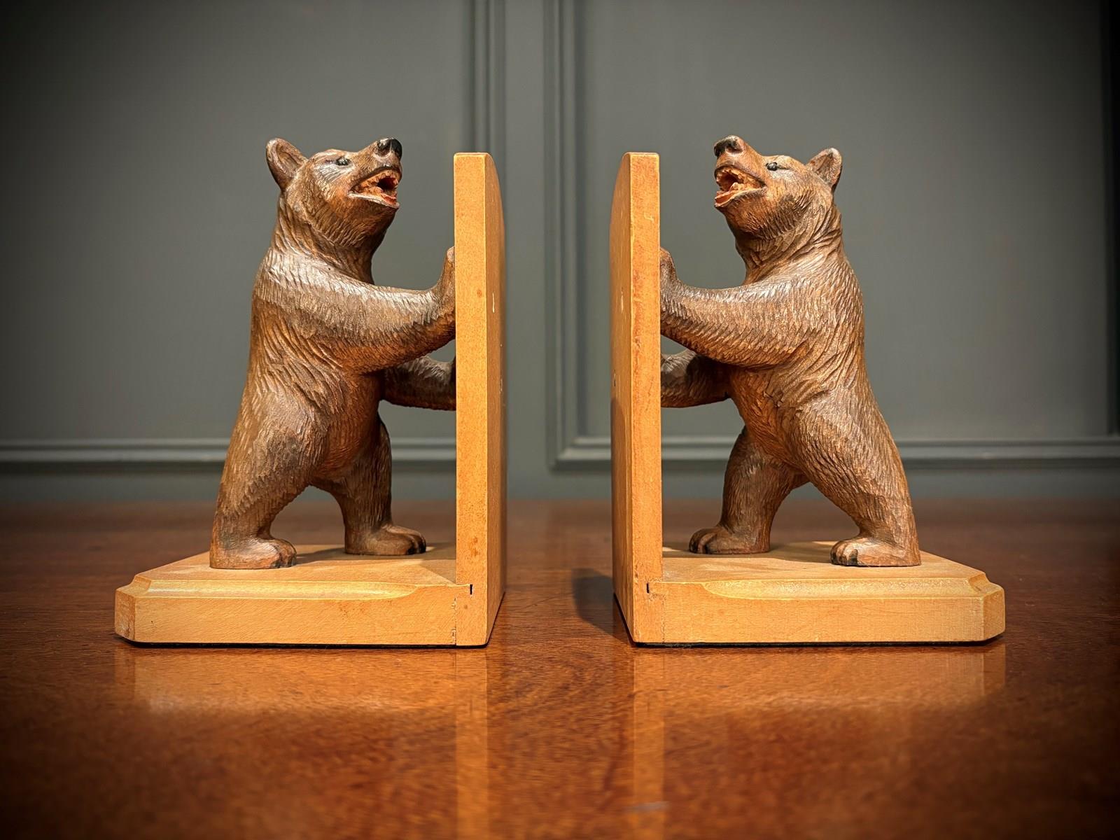 This delightful pair of Black Forest bookends features two finely carved bears standing upright, each bracing against a wooden panel.