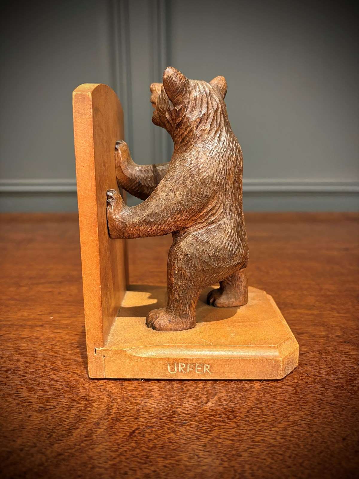Each base and backing panel is made of solid wood, providing sturdy support for books. One of the panels is engraved with the name “Urfer,” suggesting the work of a skilled carver.