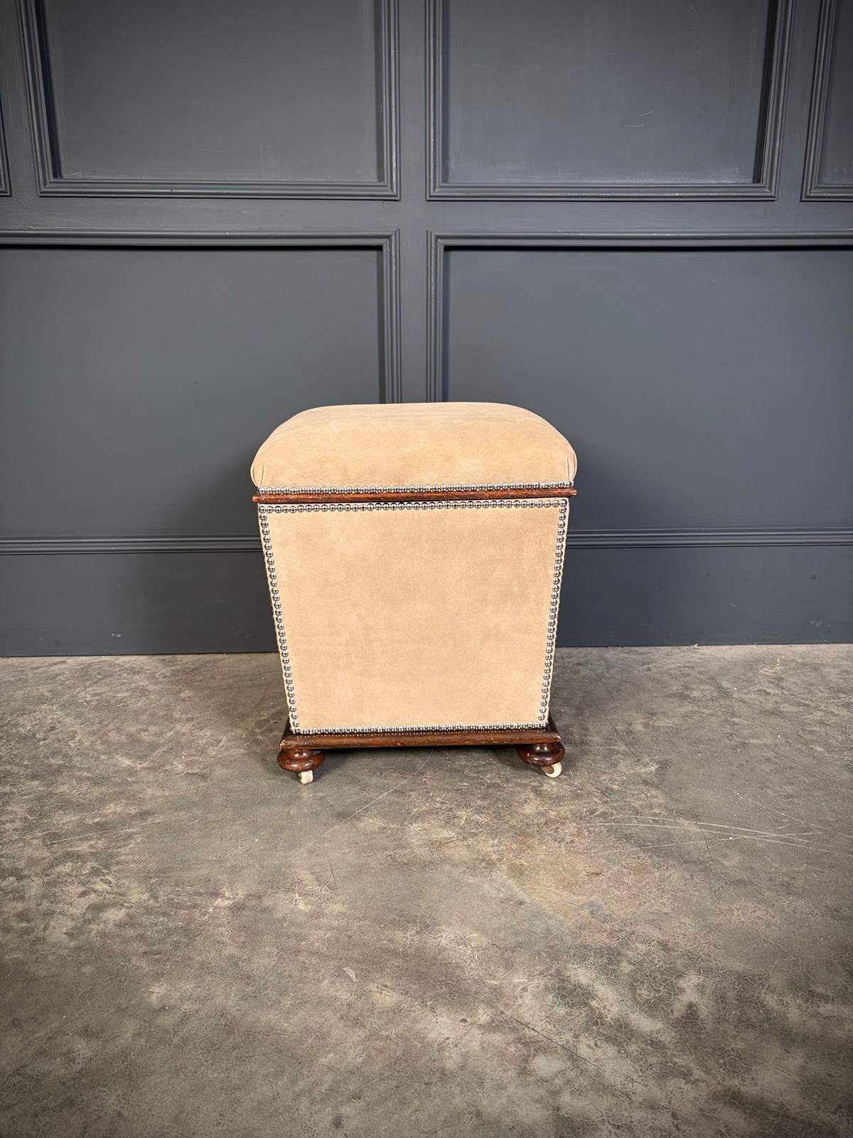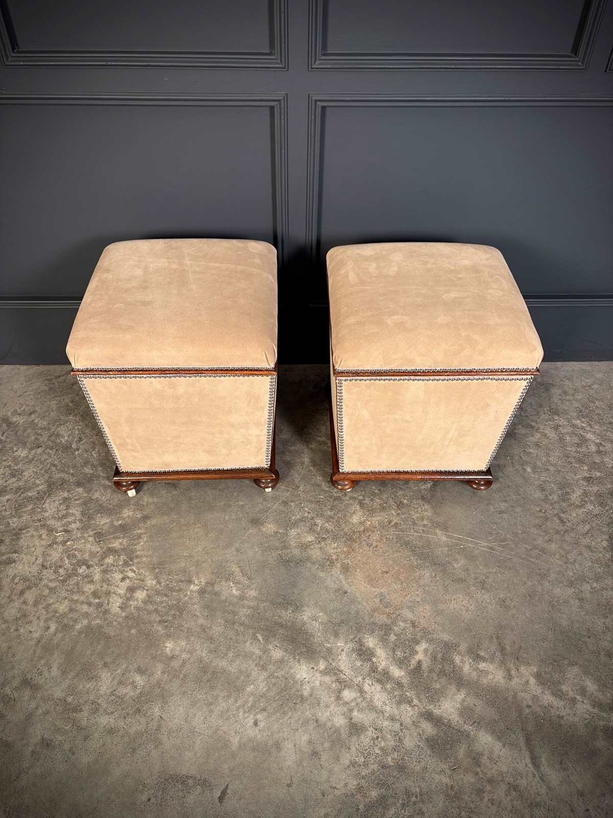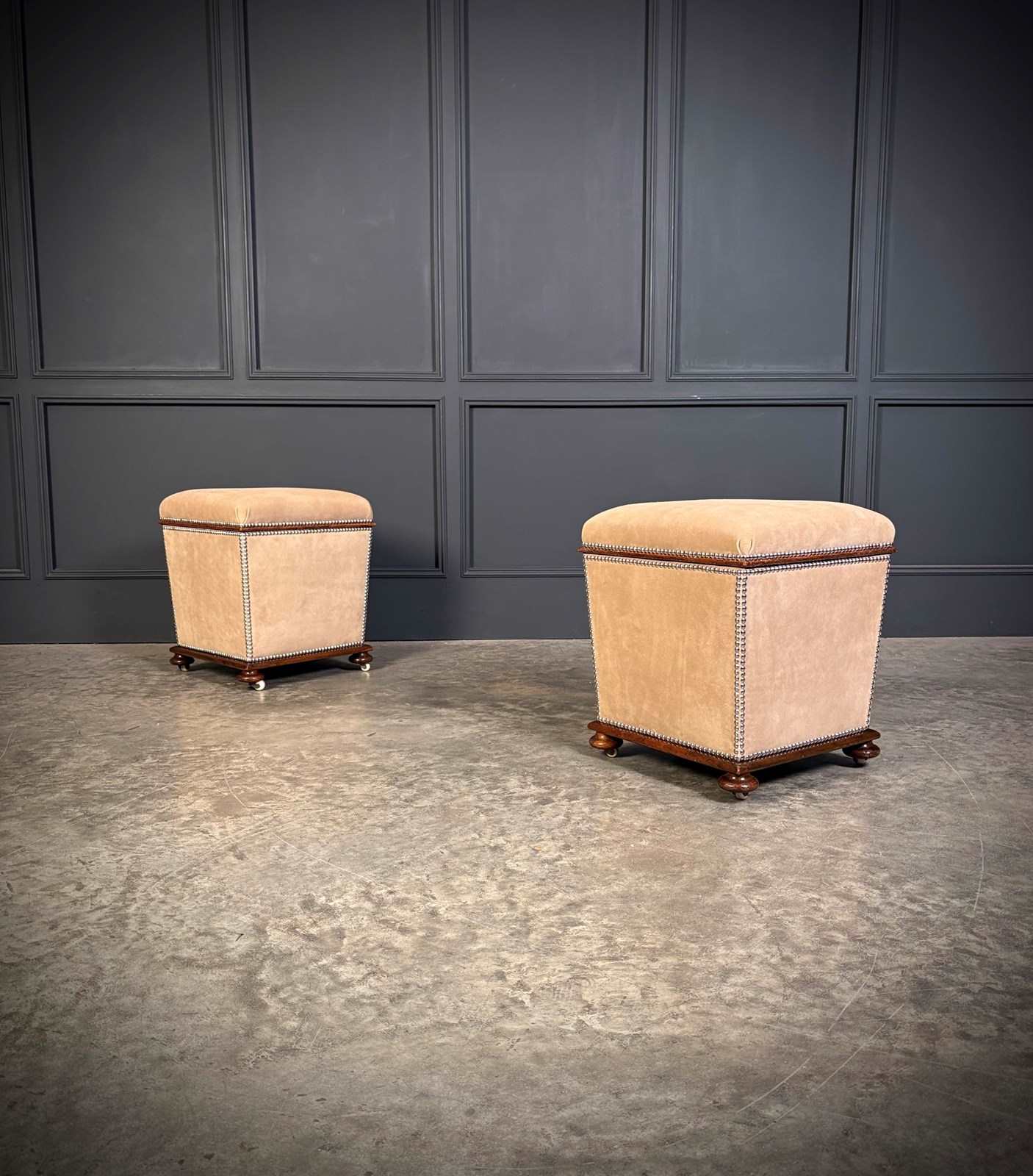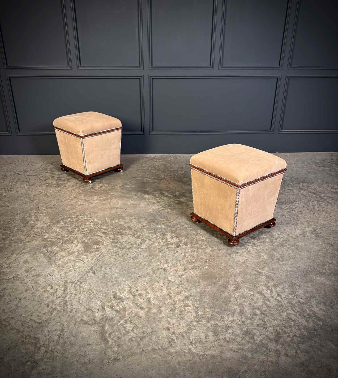 A fine pair of Regency ottoman stools, newly upholstered in a soft beige calf suede.