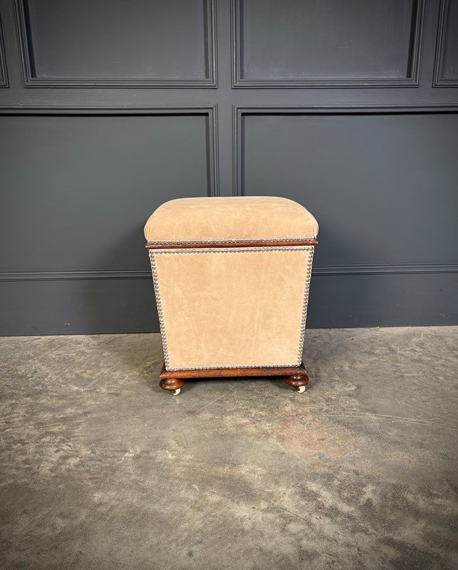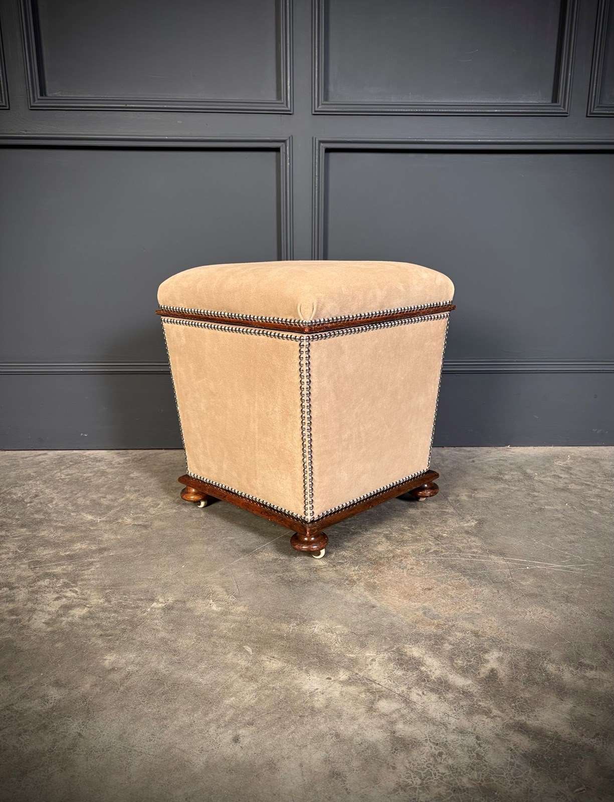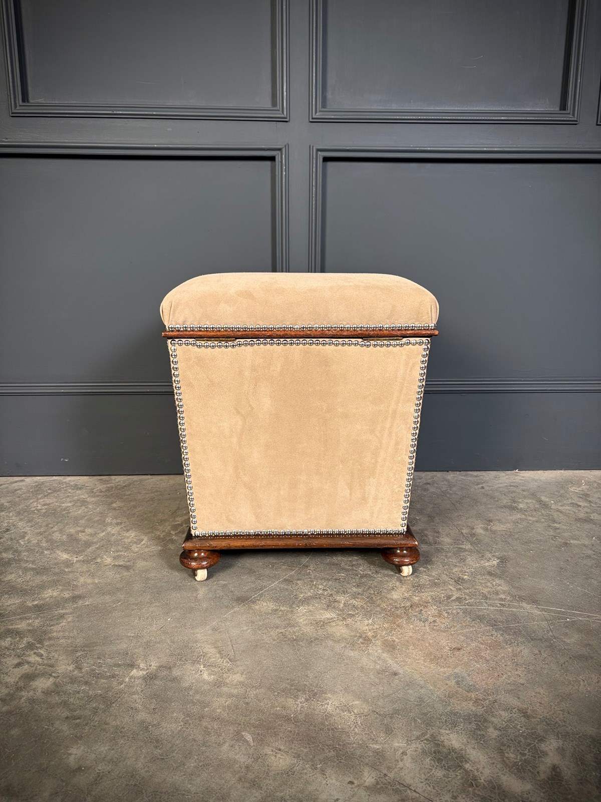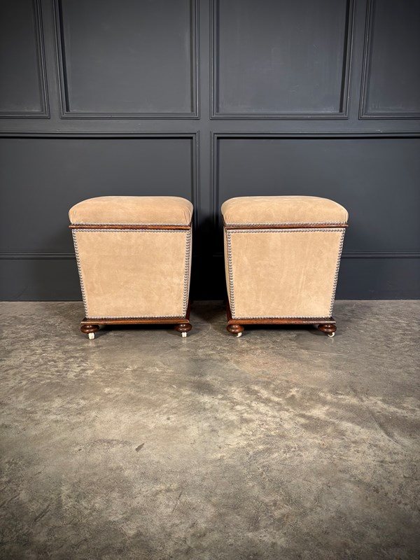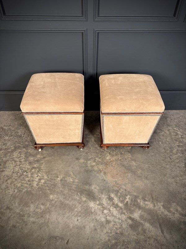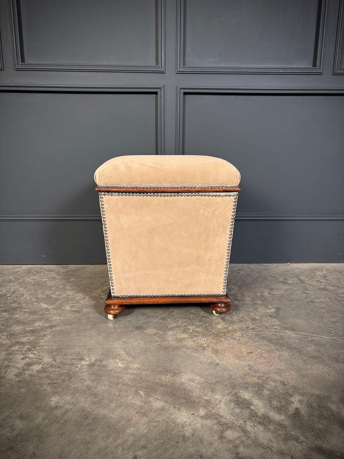 A fine pair of Regency ottoman stools, newly upholstered in a soft beige calf suede.