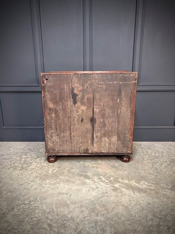 The exterior is fitted with two short and two graduated long drawers, all with brass handles and escutcheons, and stands on bun feet.