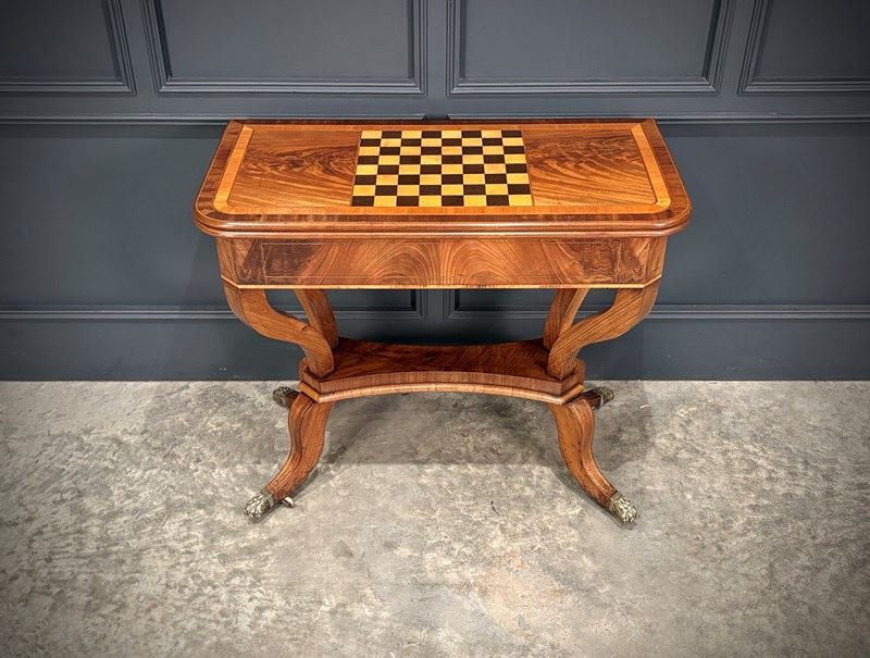A fine Regency period mahogany games table of elegant proportions, raised on a shaped pedestal base with swept legs terminating in attractive brass paw castors.
