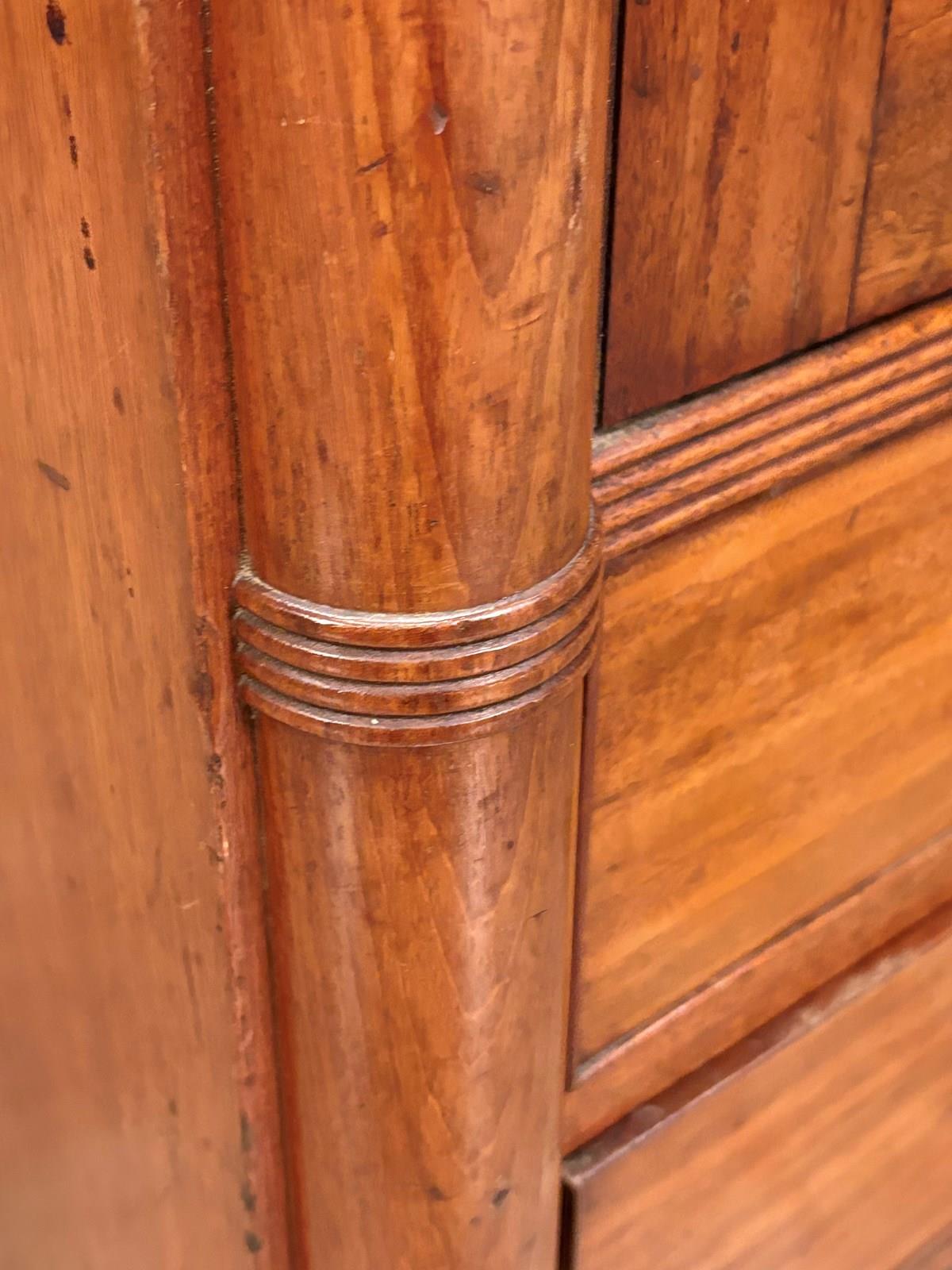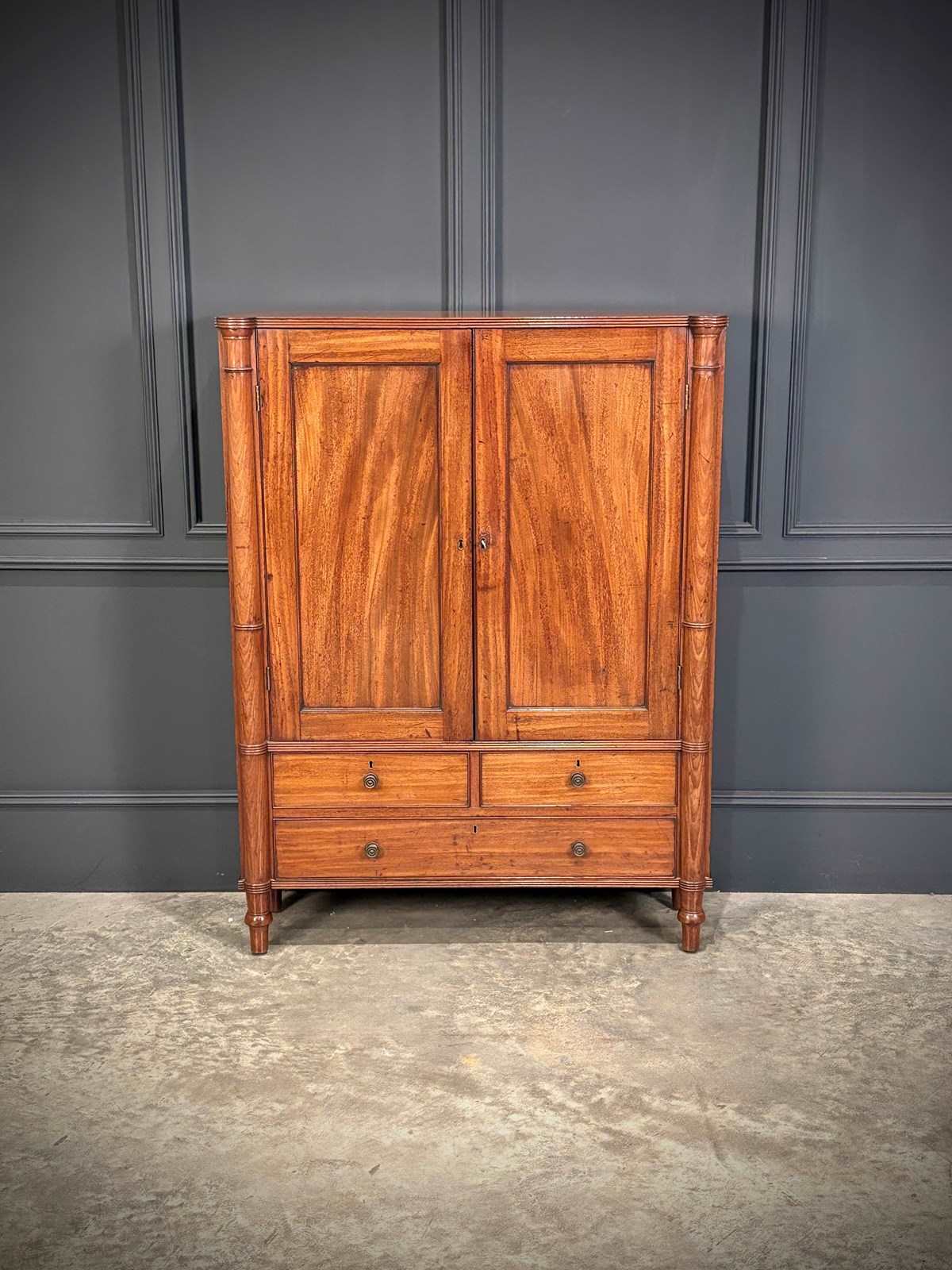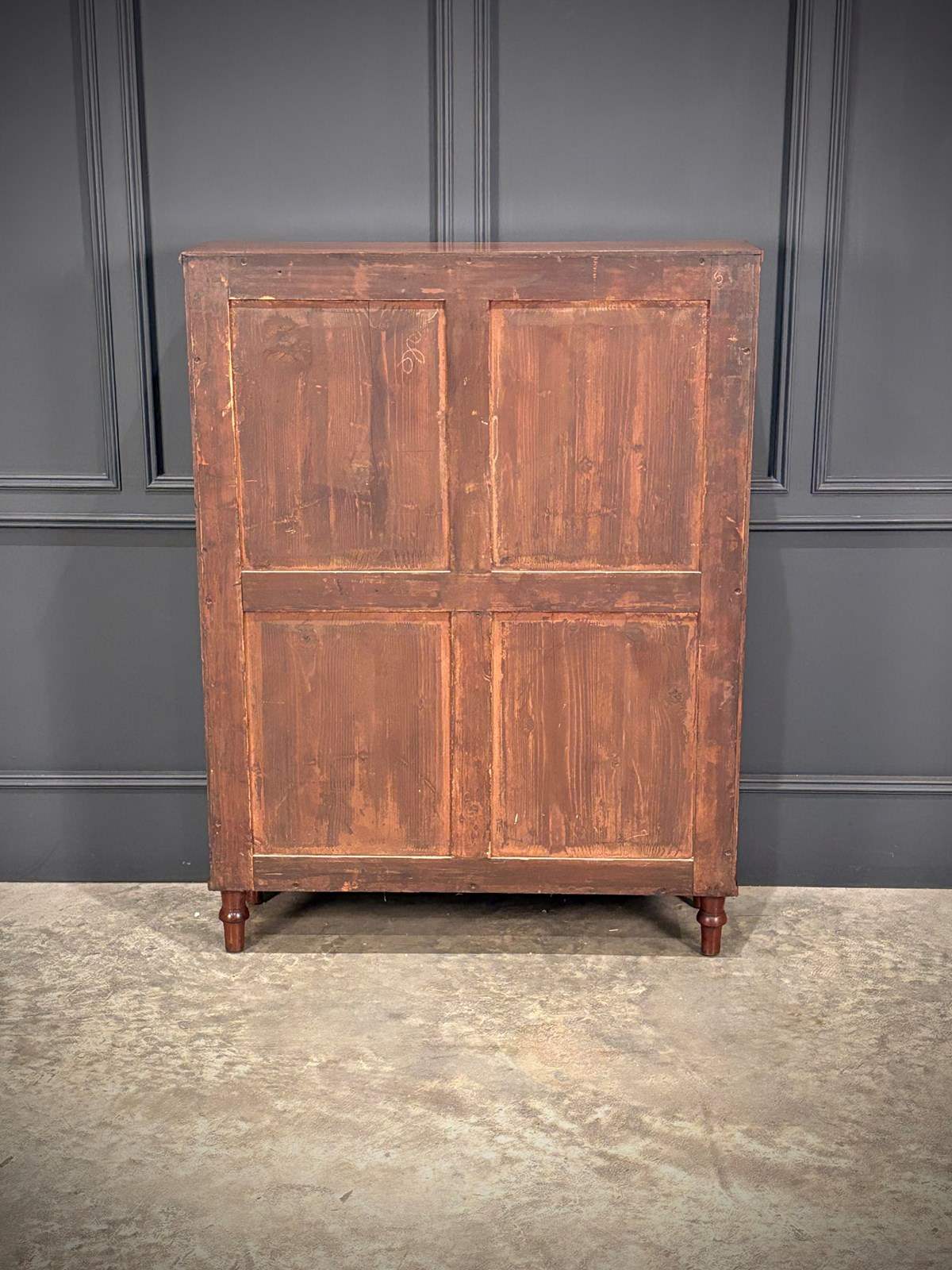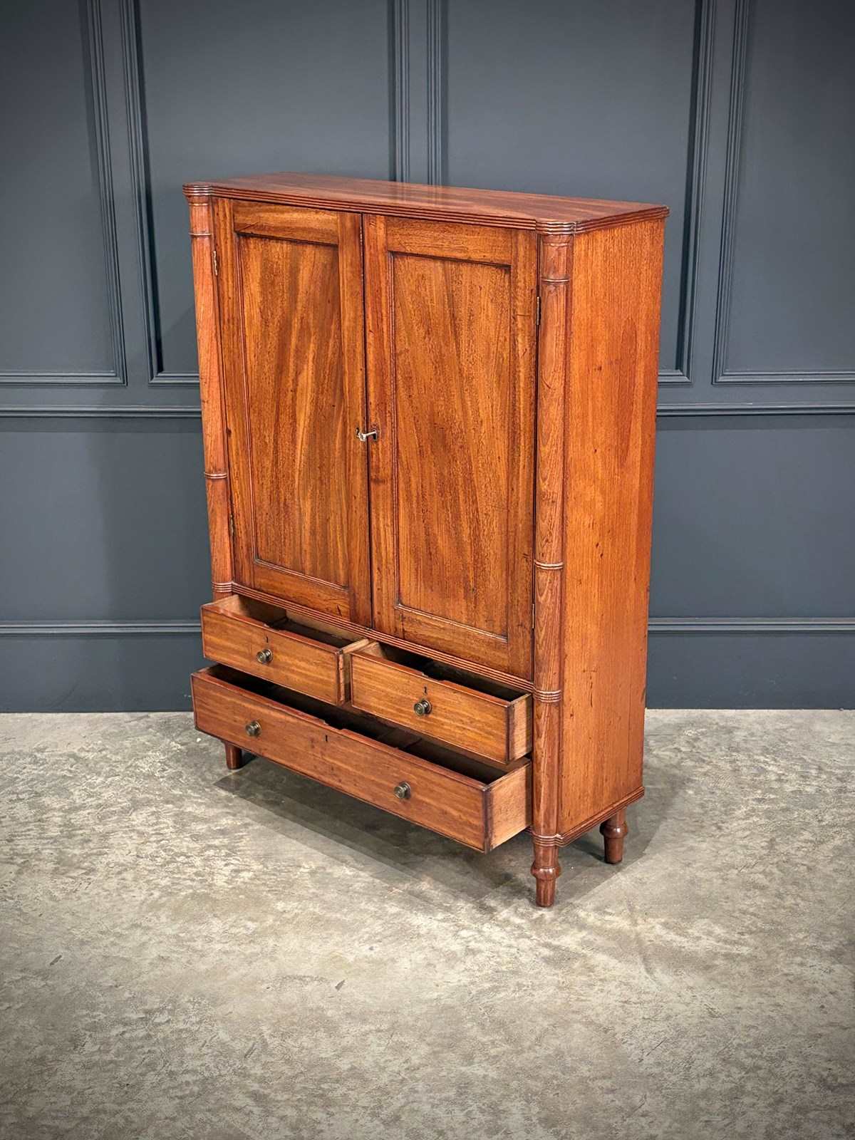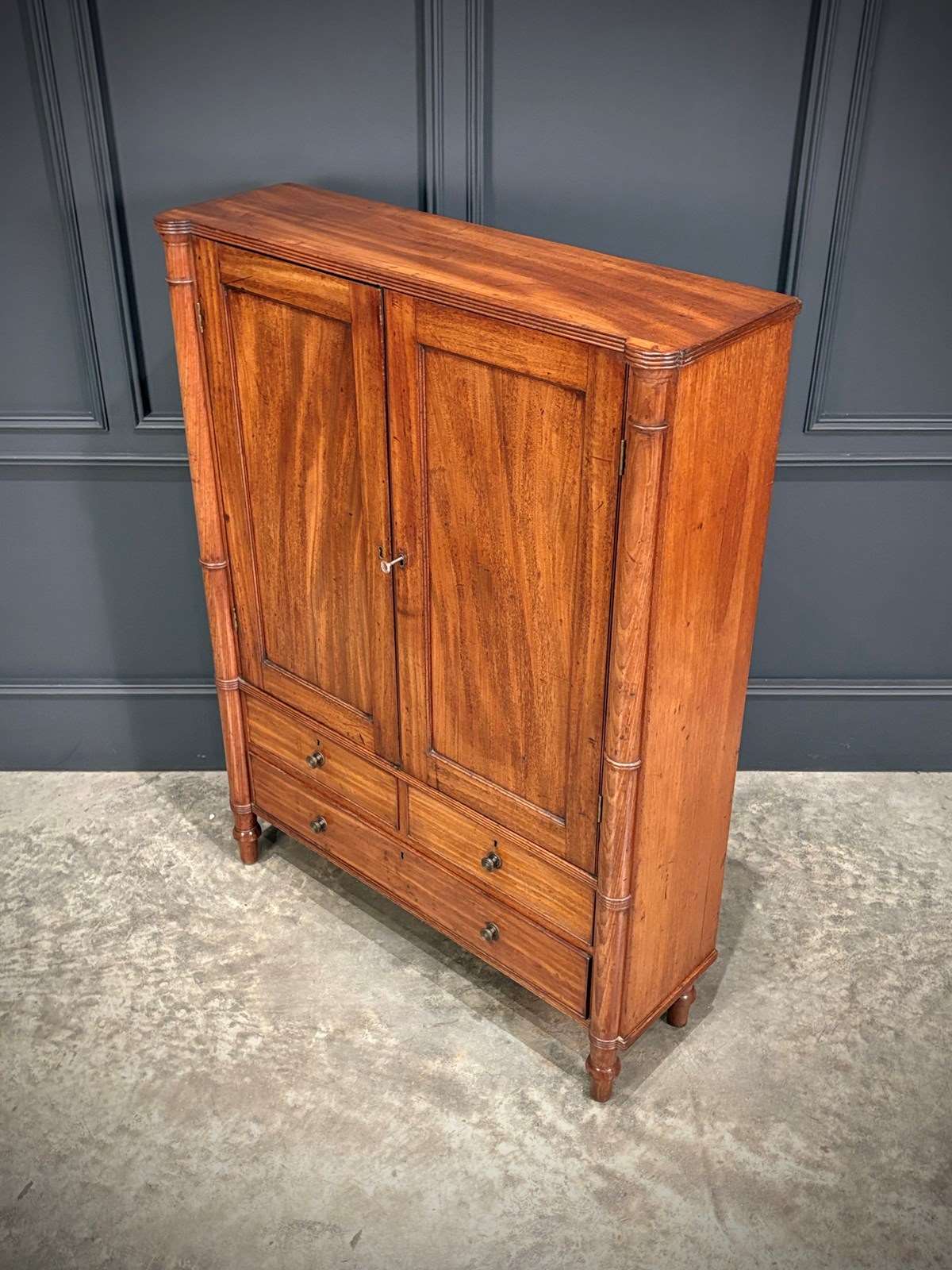 The piece is enhanced by finely executed ring-turned details to the front pilasters, which terminate in neat turned feet.