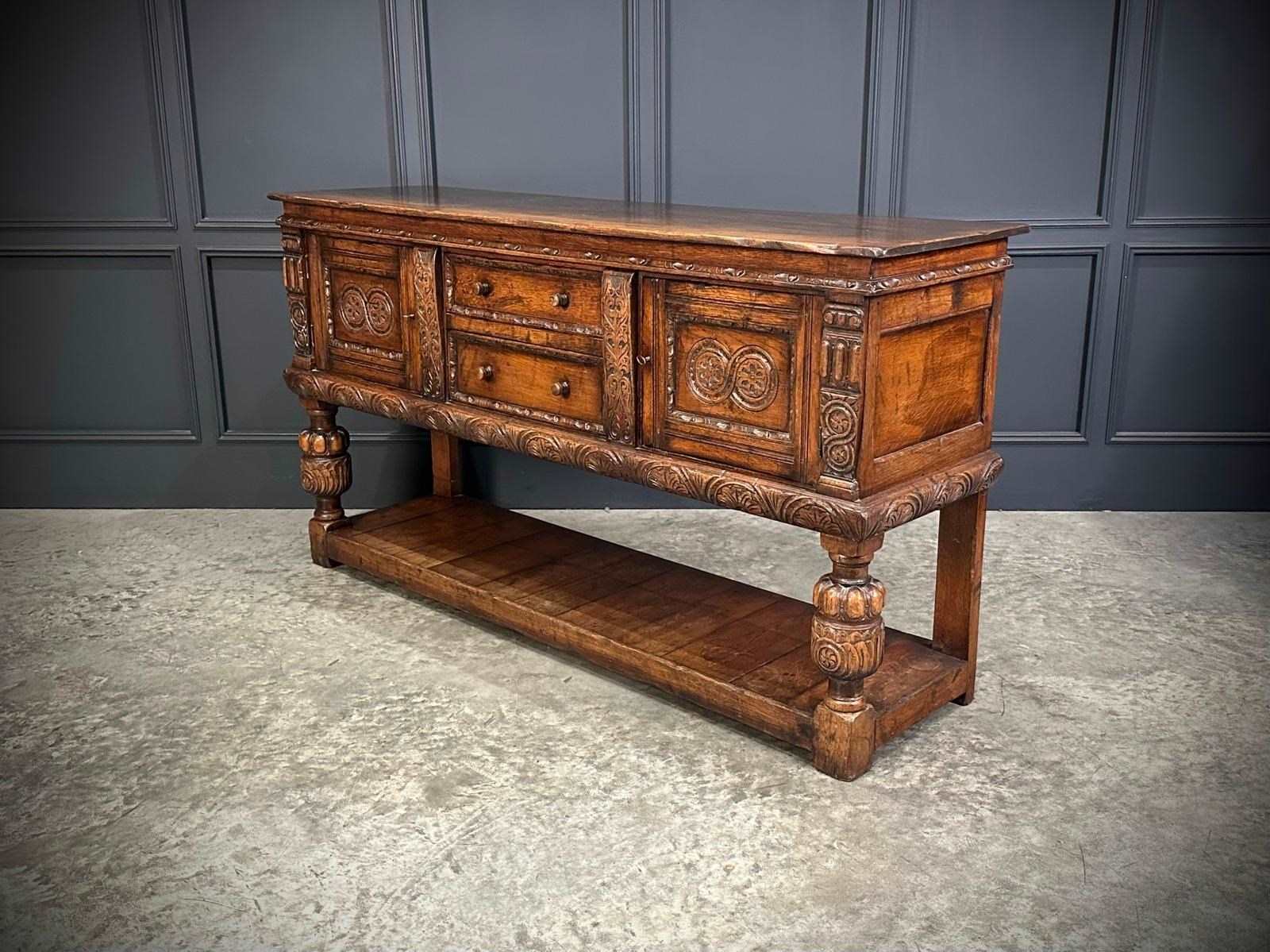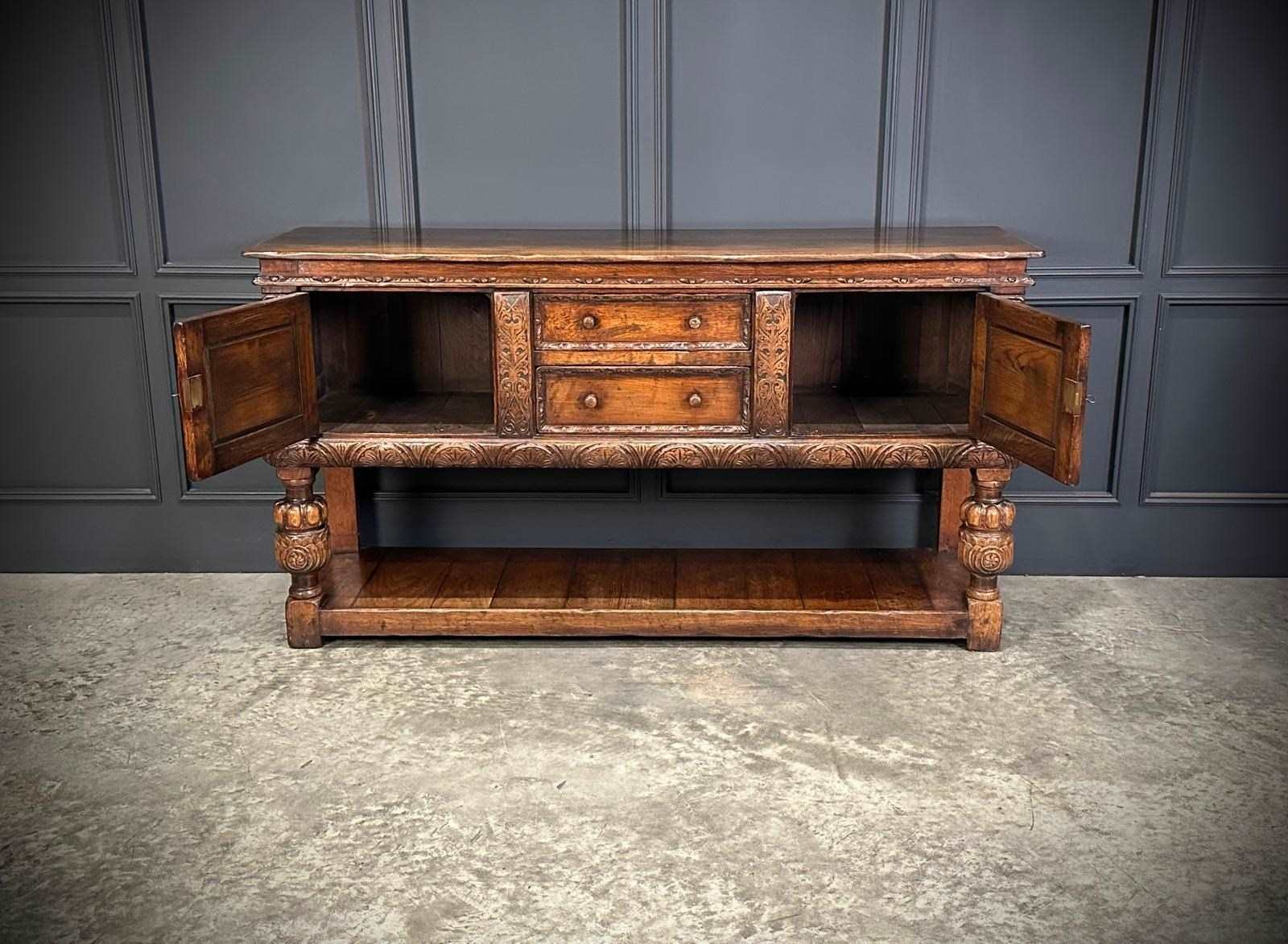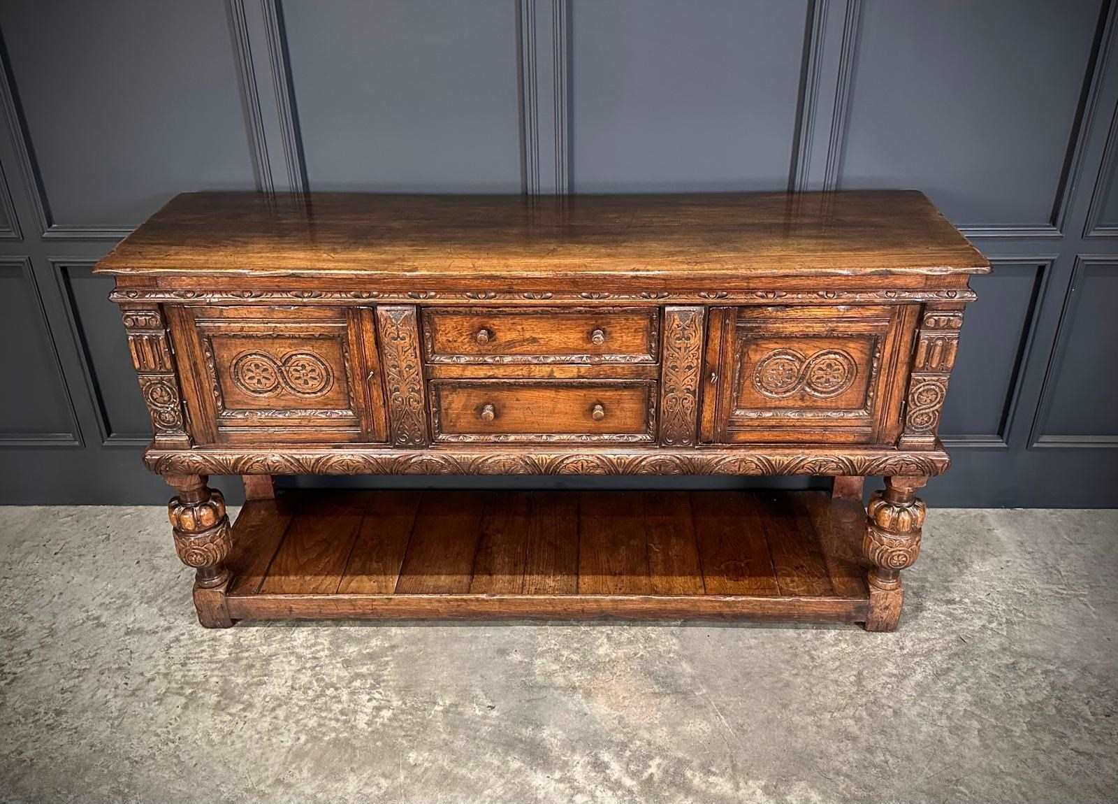 A handsome solid oak potboard dresser, featuring a well-proportioned top above two central drawers flanked by two panelled cupboards, all with carved detailing and supplied with two working keys.