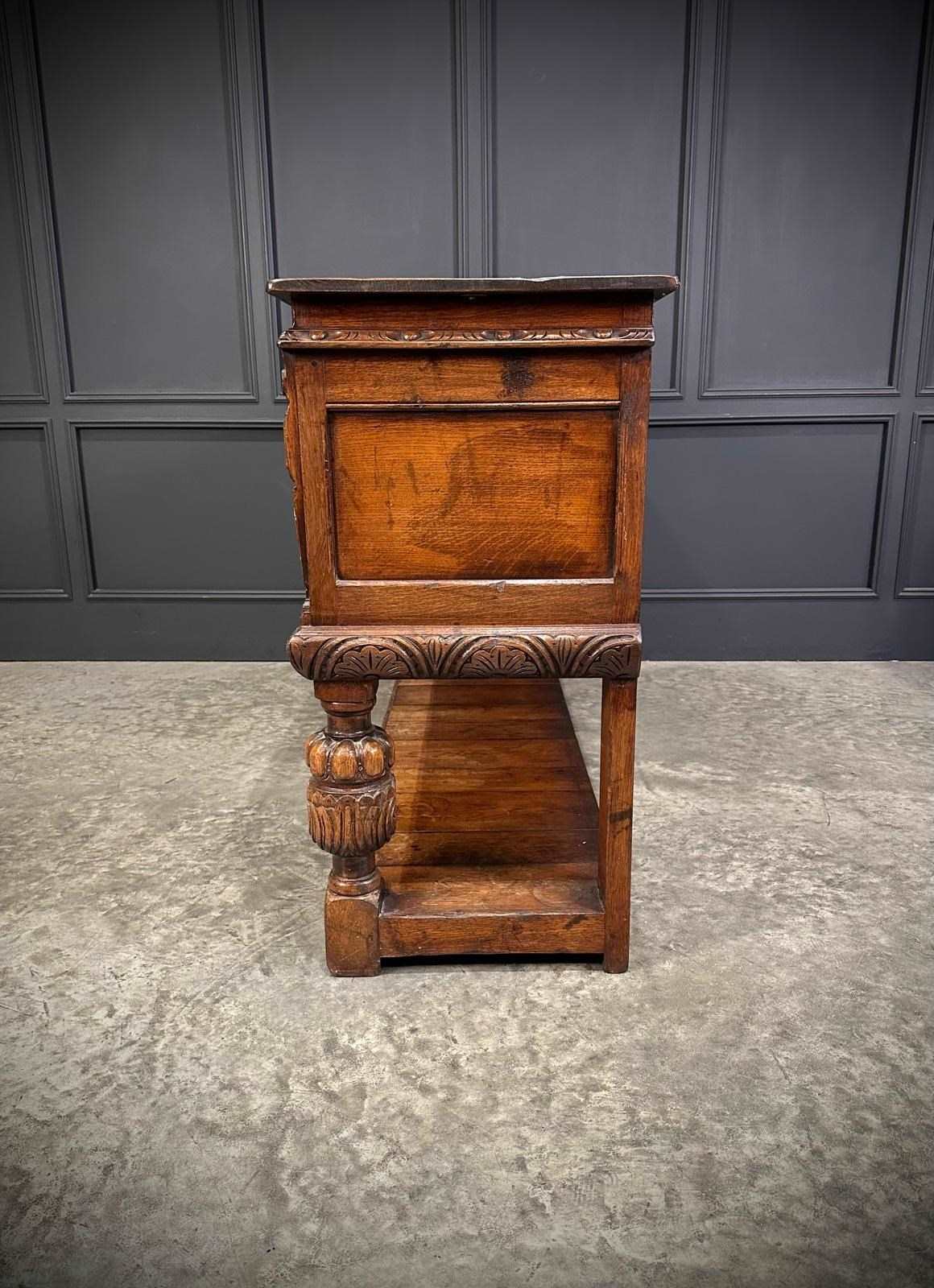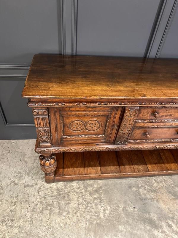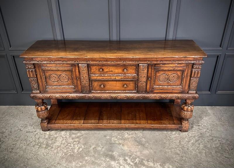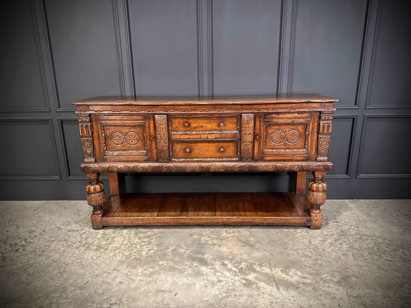 A handsome solid oak potboard dresser, featuring a well-proportioned top above two central drawers flanked by two panelled cupboards, all with carved detailing and supplied with two working keys.
