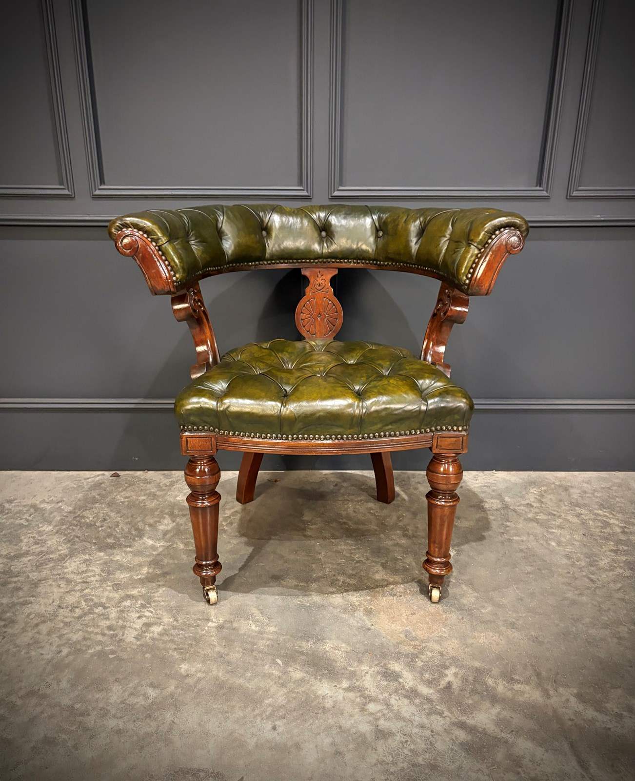 This attractive late Victorian mahogany desk chair has a beautifully shaped mahogany frame, featuring a sweeping horseshoe back supported by carved scroll brackets and standing on turned front legs with brass castors for smooth movement.