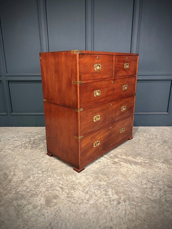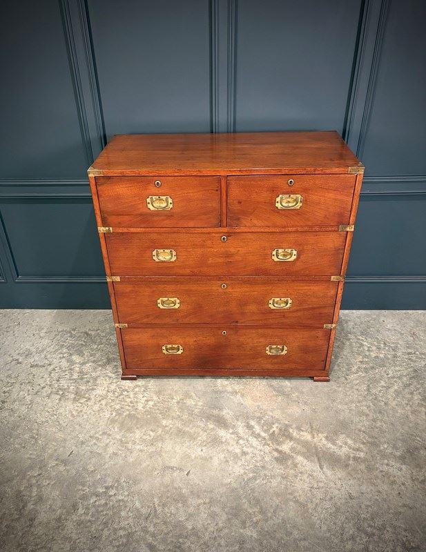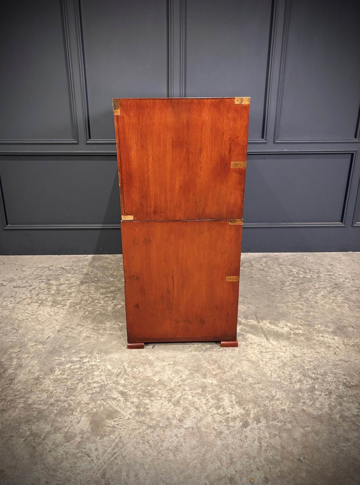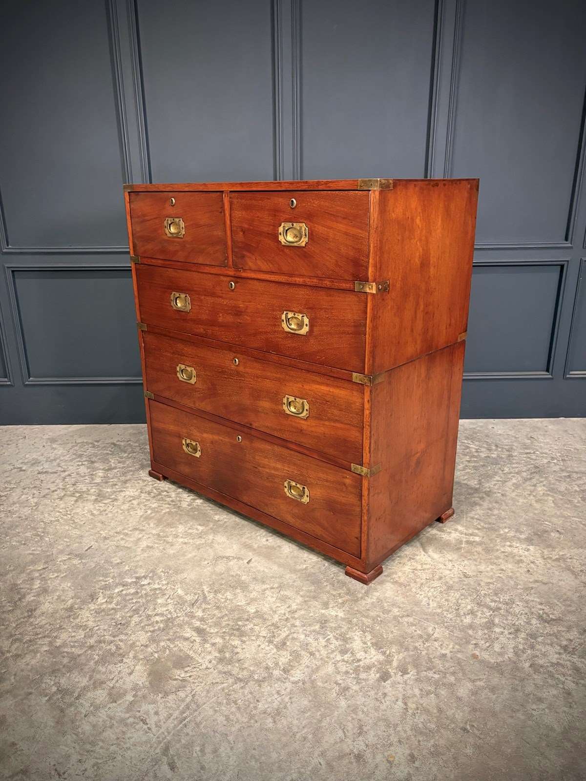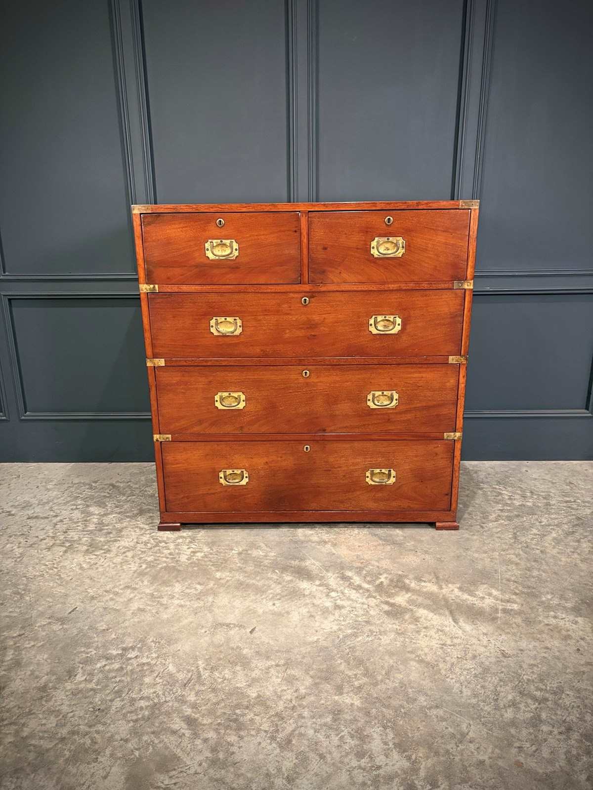 The chest comes in 2 pieces featuring classic brass bound corners and recessed campaign handles, along with a rich coloured mahogany.