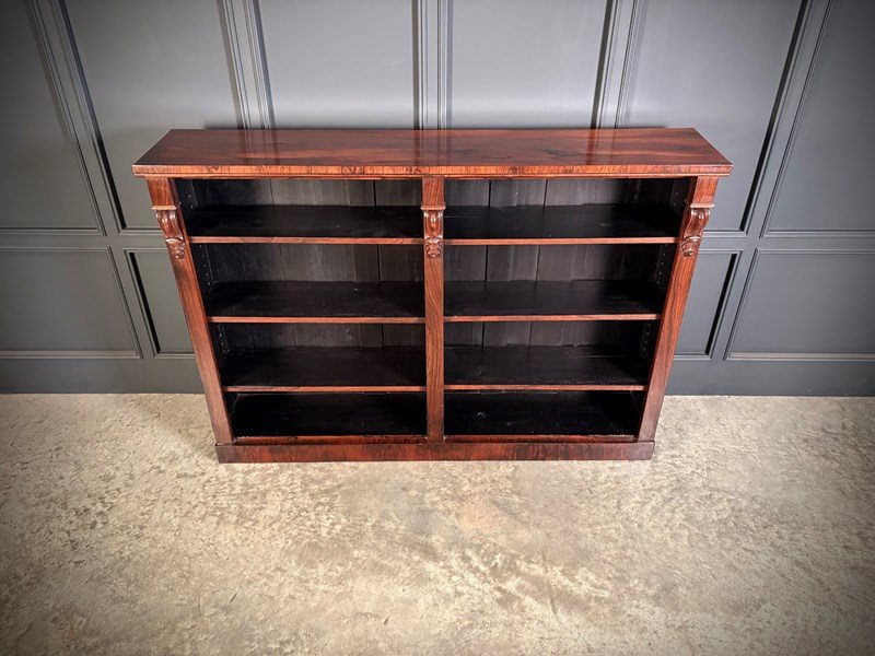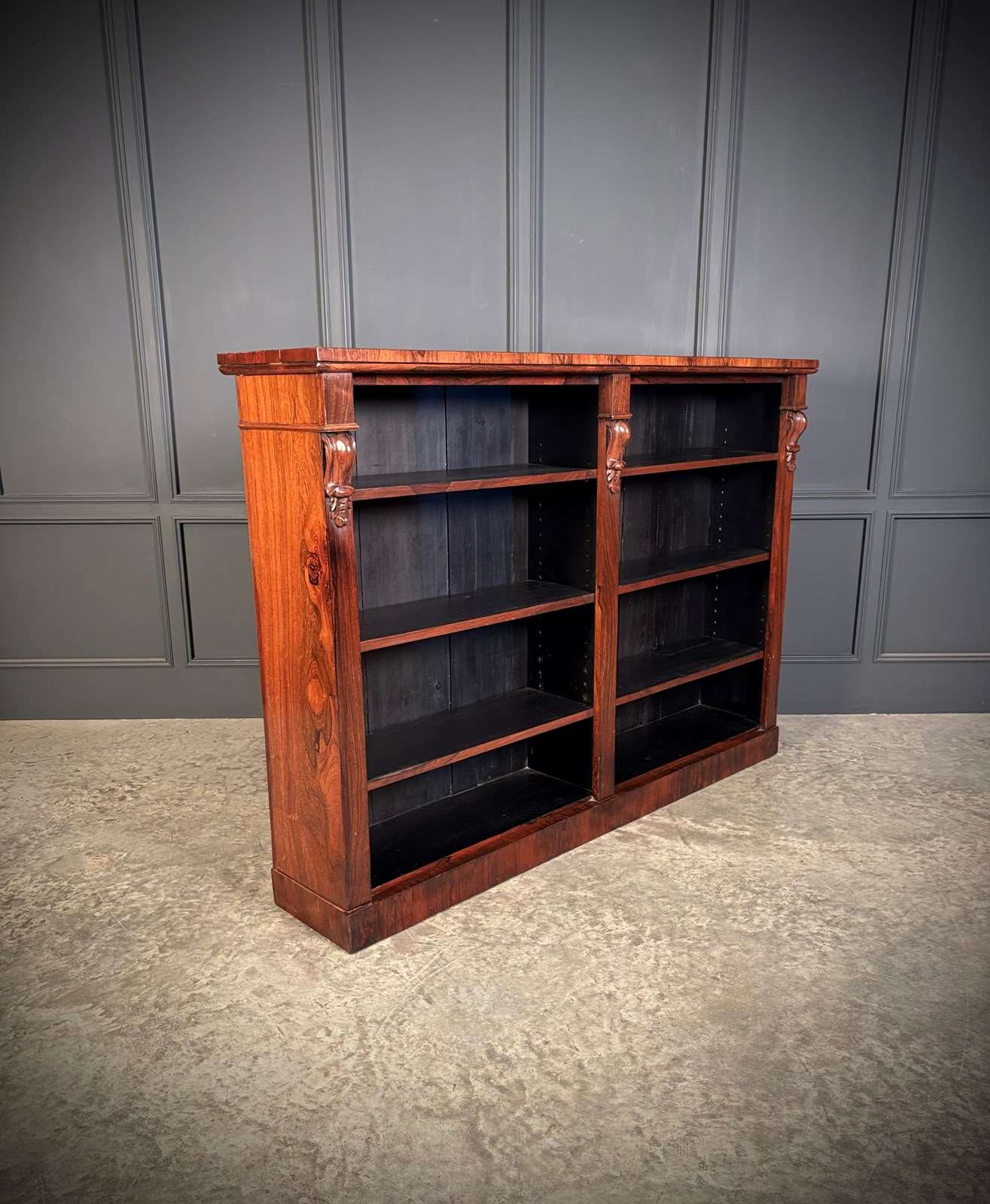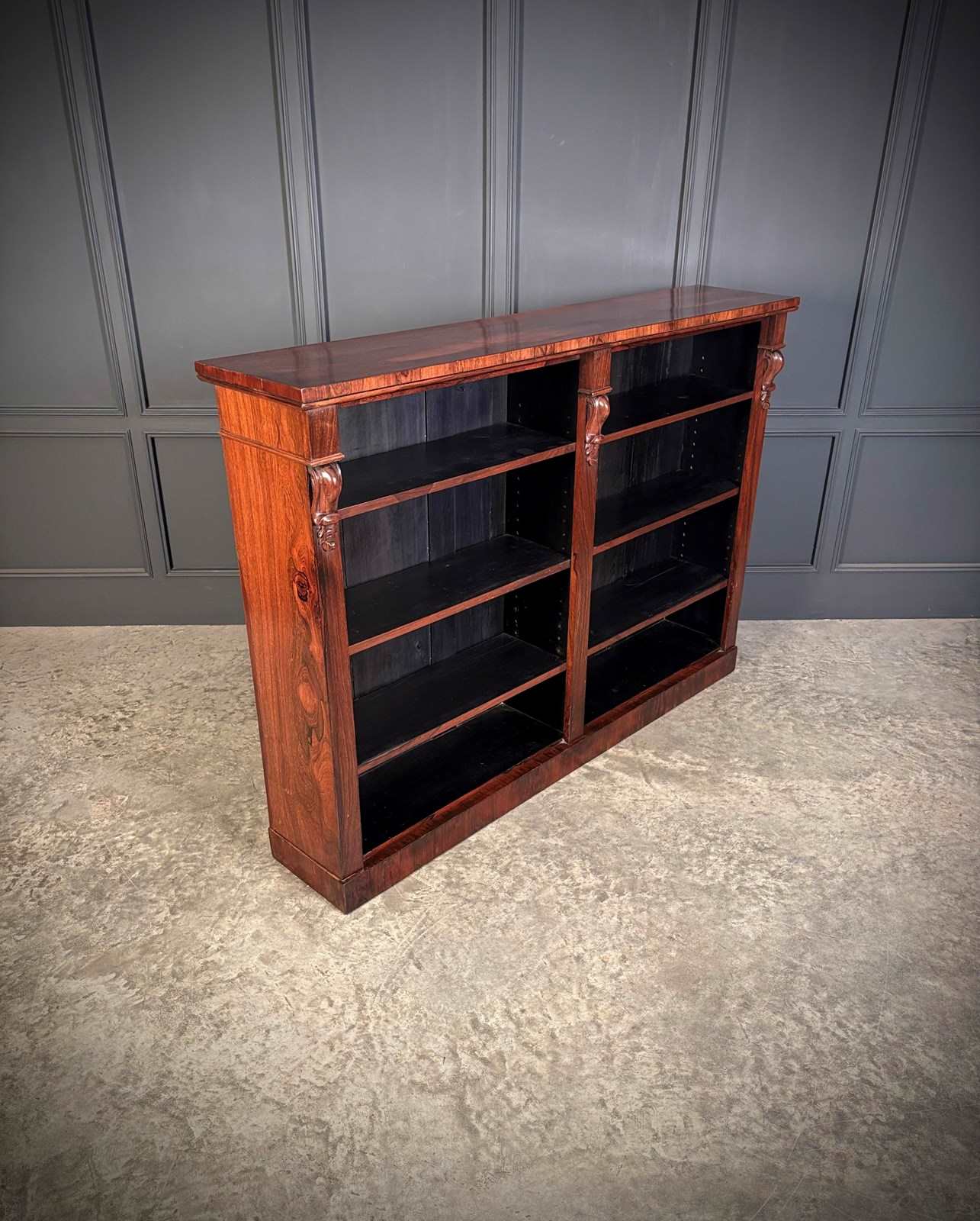 A beautifully proportioned Victorian open bookcase boasting richly figured rosewood, dating to around 1860.