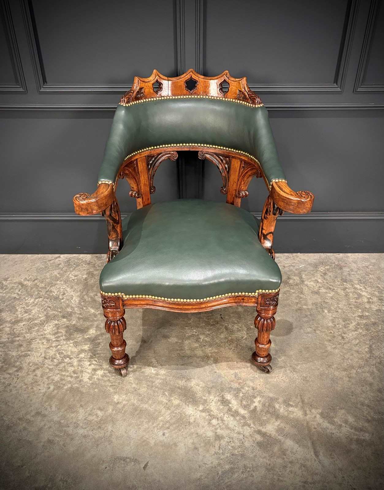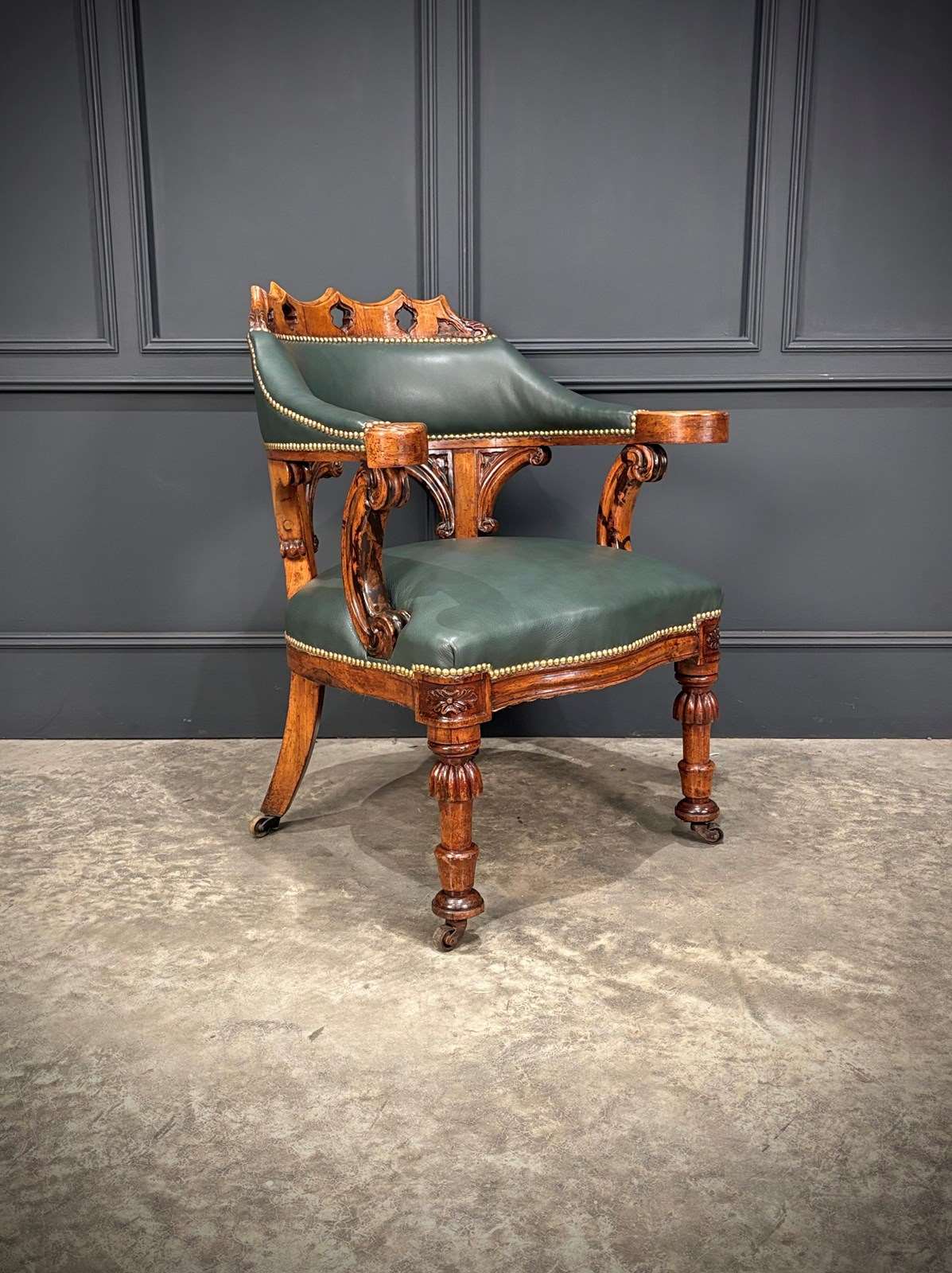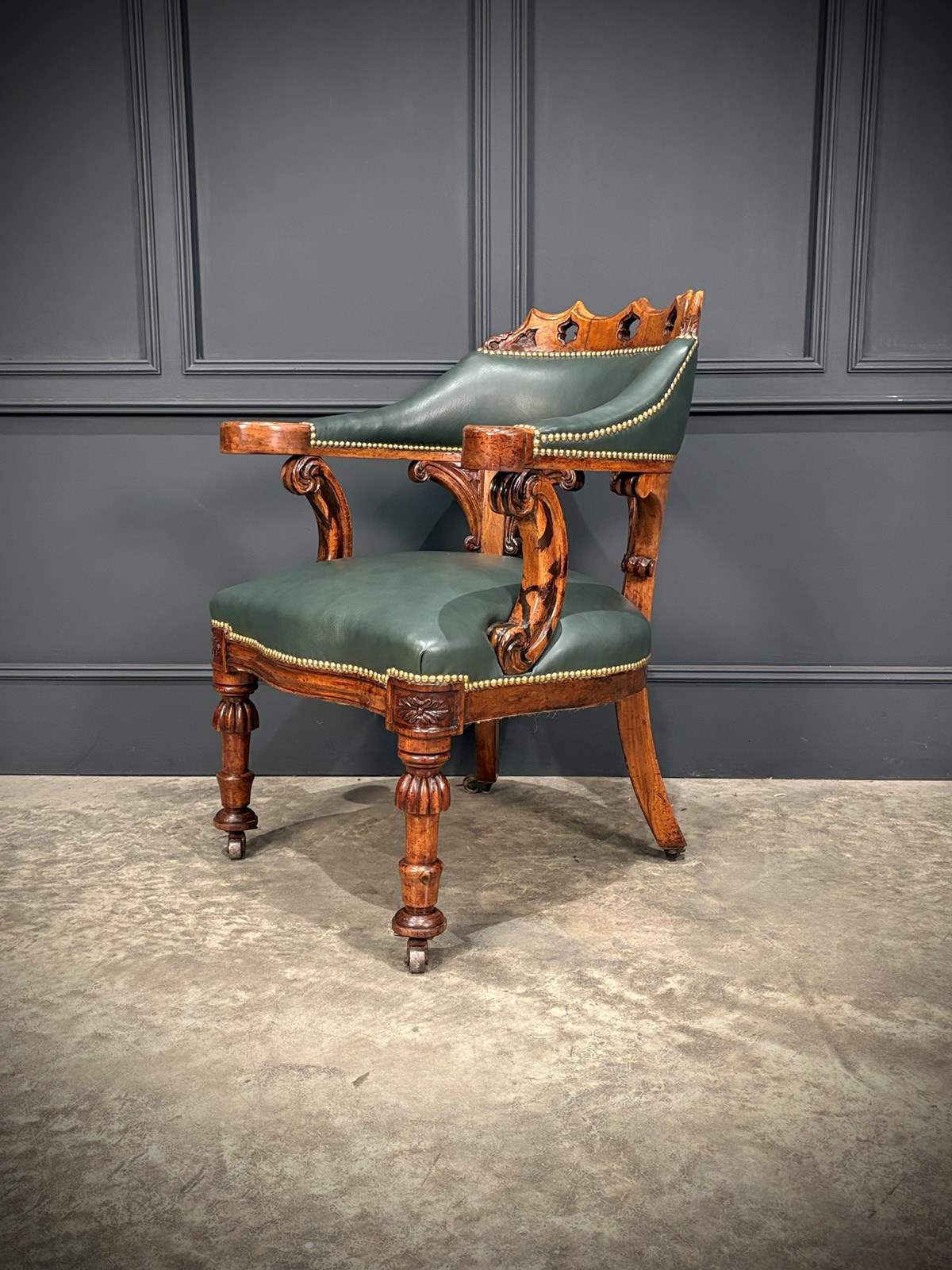 The chair features a beautifully pierced and carved walnut backrest above a deep green leather upholstered seat and back, finished with hand tacked brass studs.