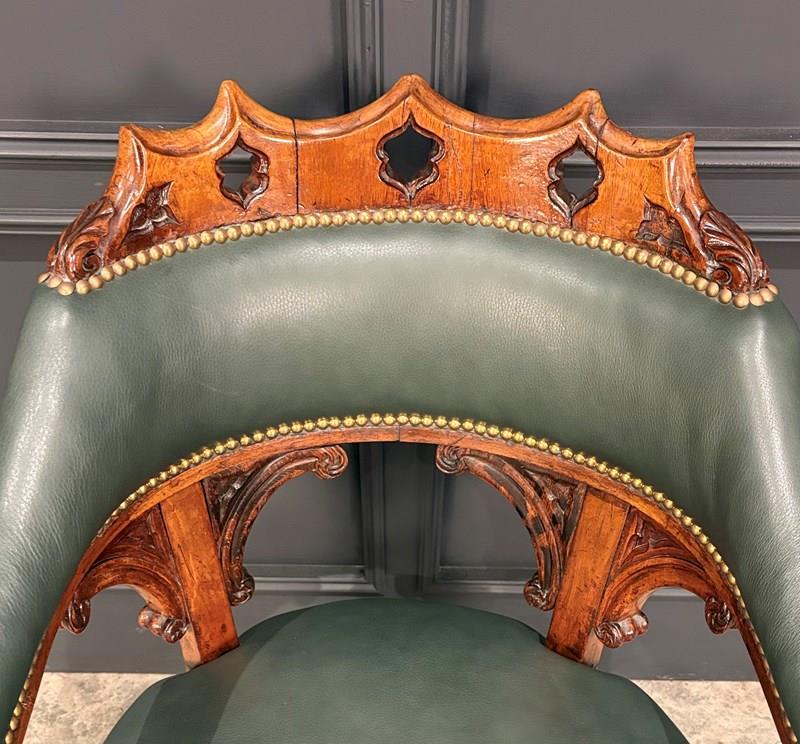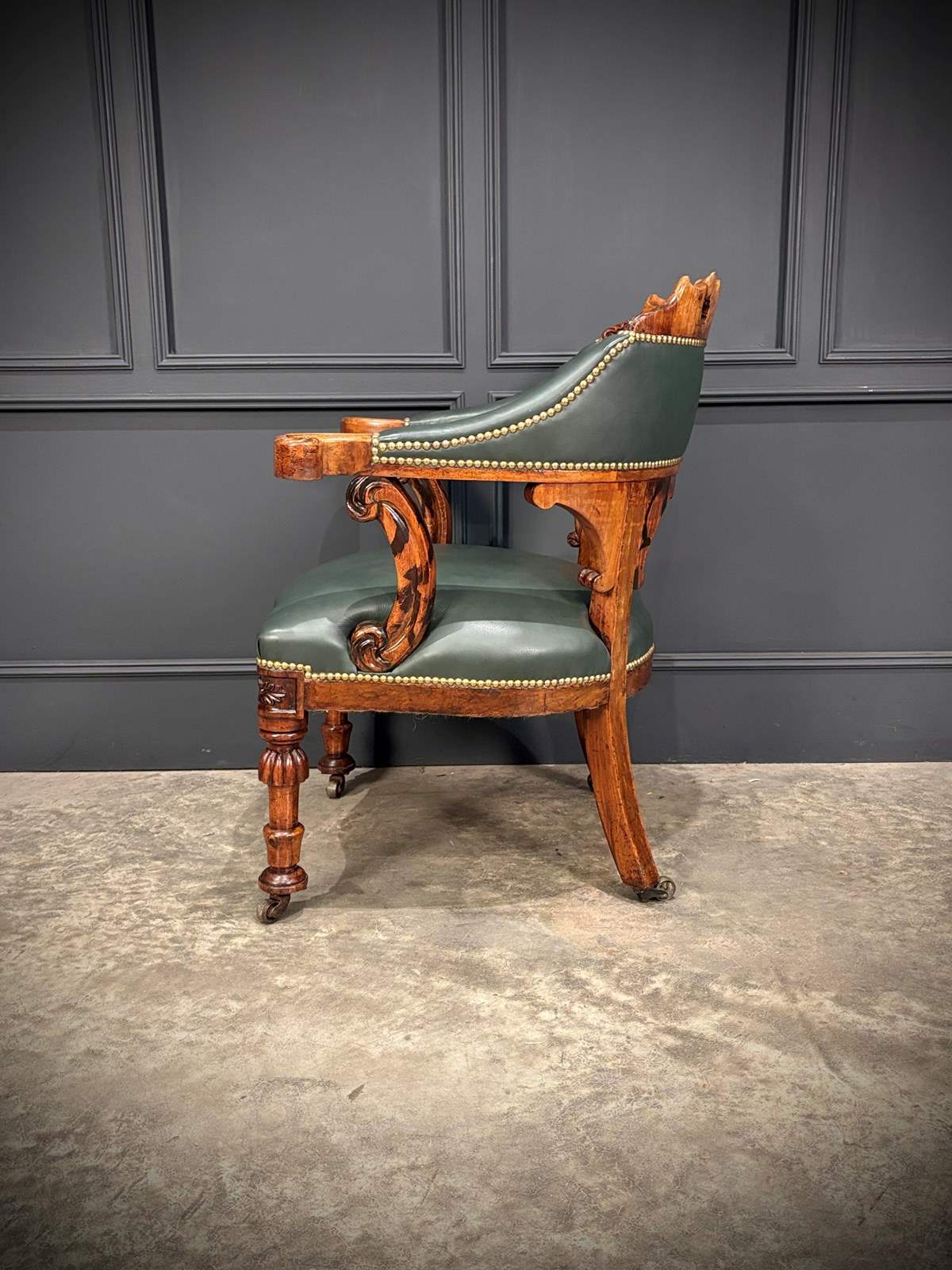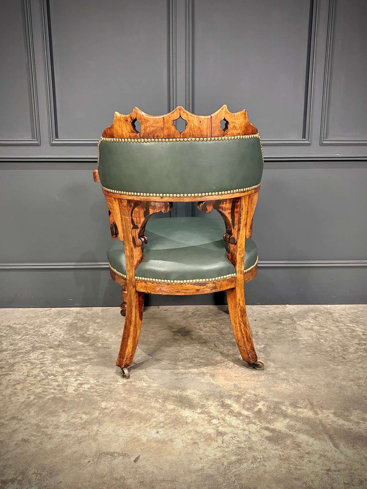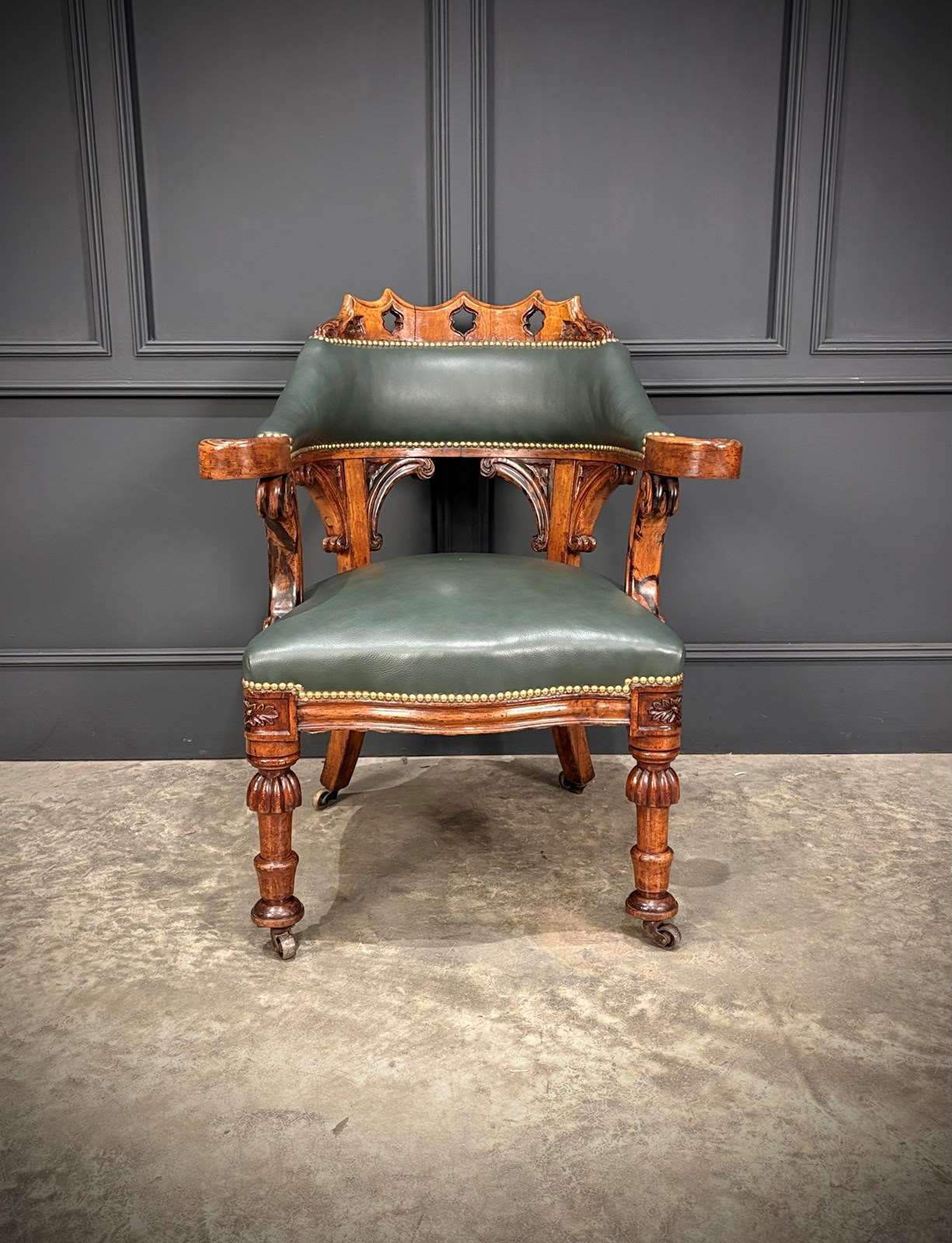 The chair features a beautifully pierced and carved walnut backrest above a deep green leather upholstered seat and back, finished with hand tacked brass studs.