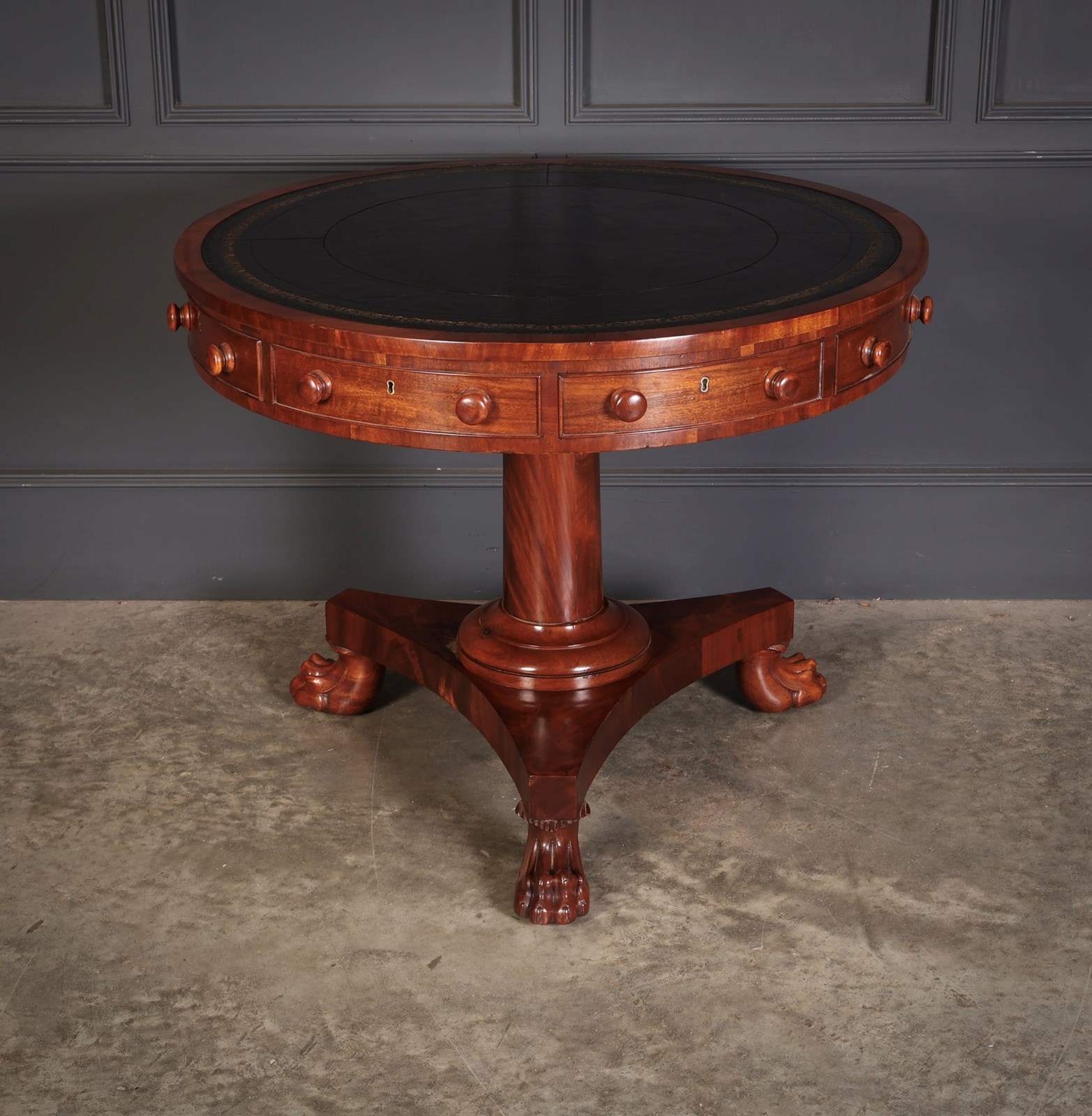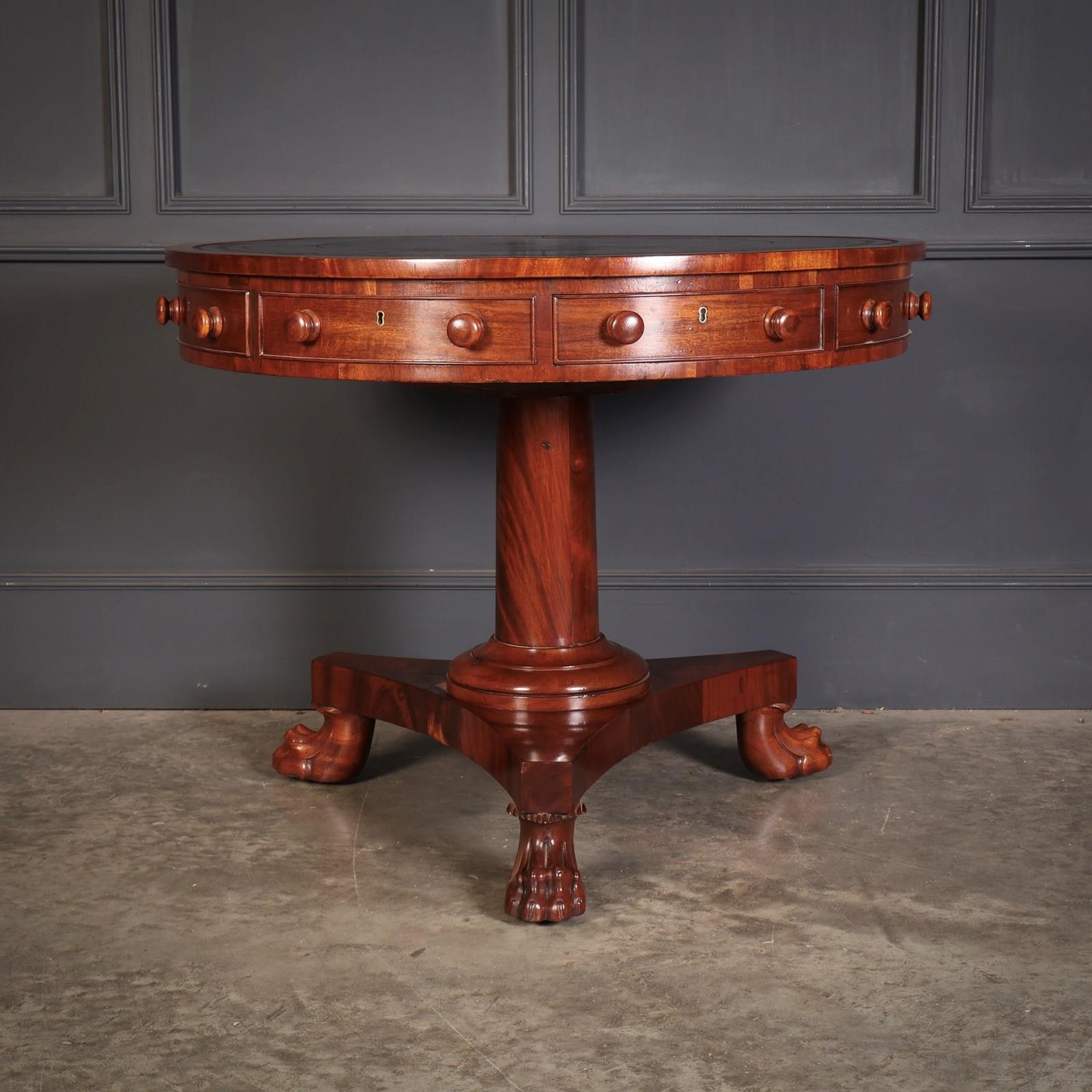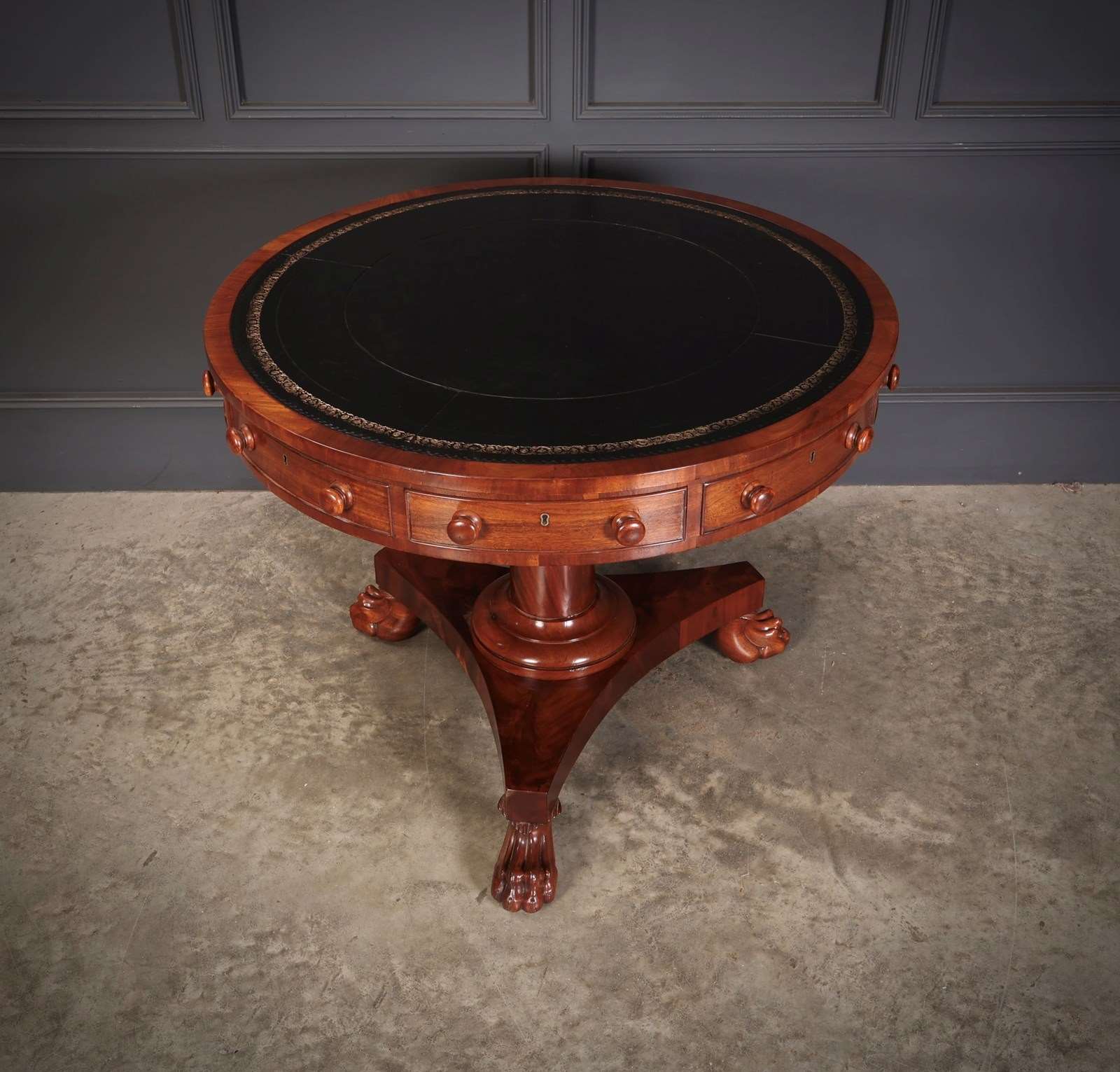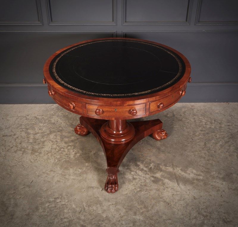 A handsome William IV period mahogany drum table, featuring a newly fitted tooled black leather inset top.