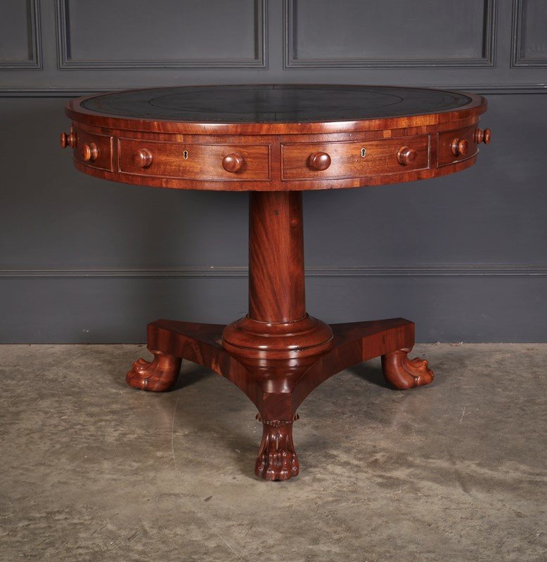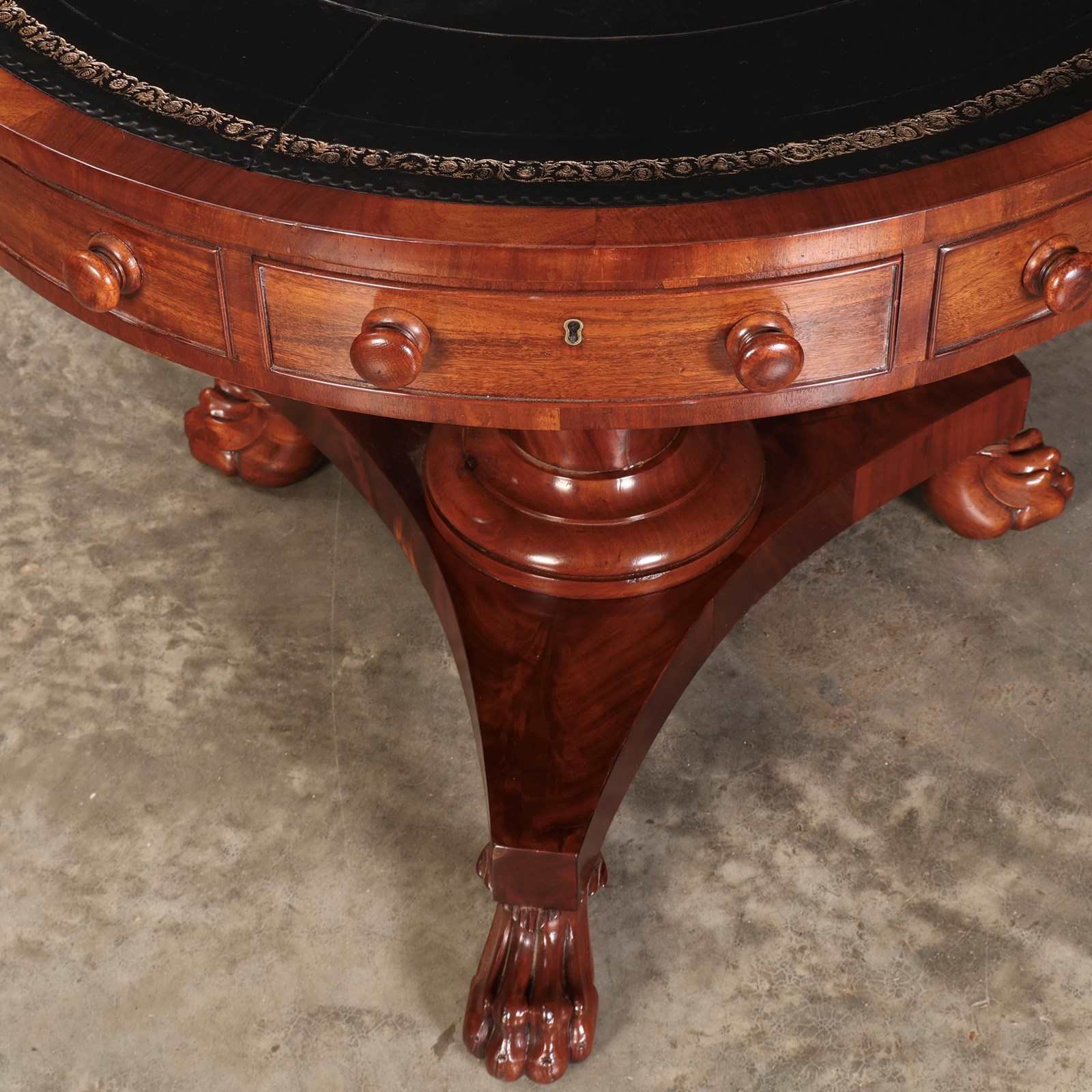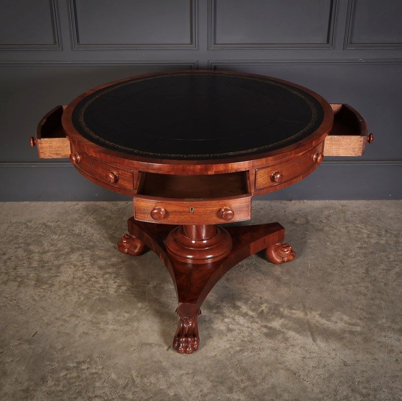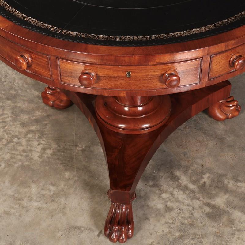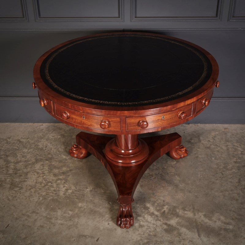 A handsome William IV period mahogany drum table, featuring a newly fitted tooled black leather inset top.