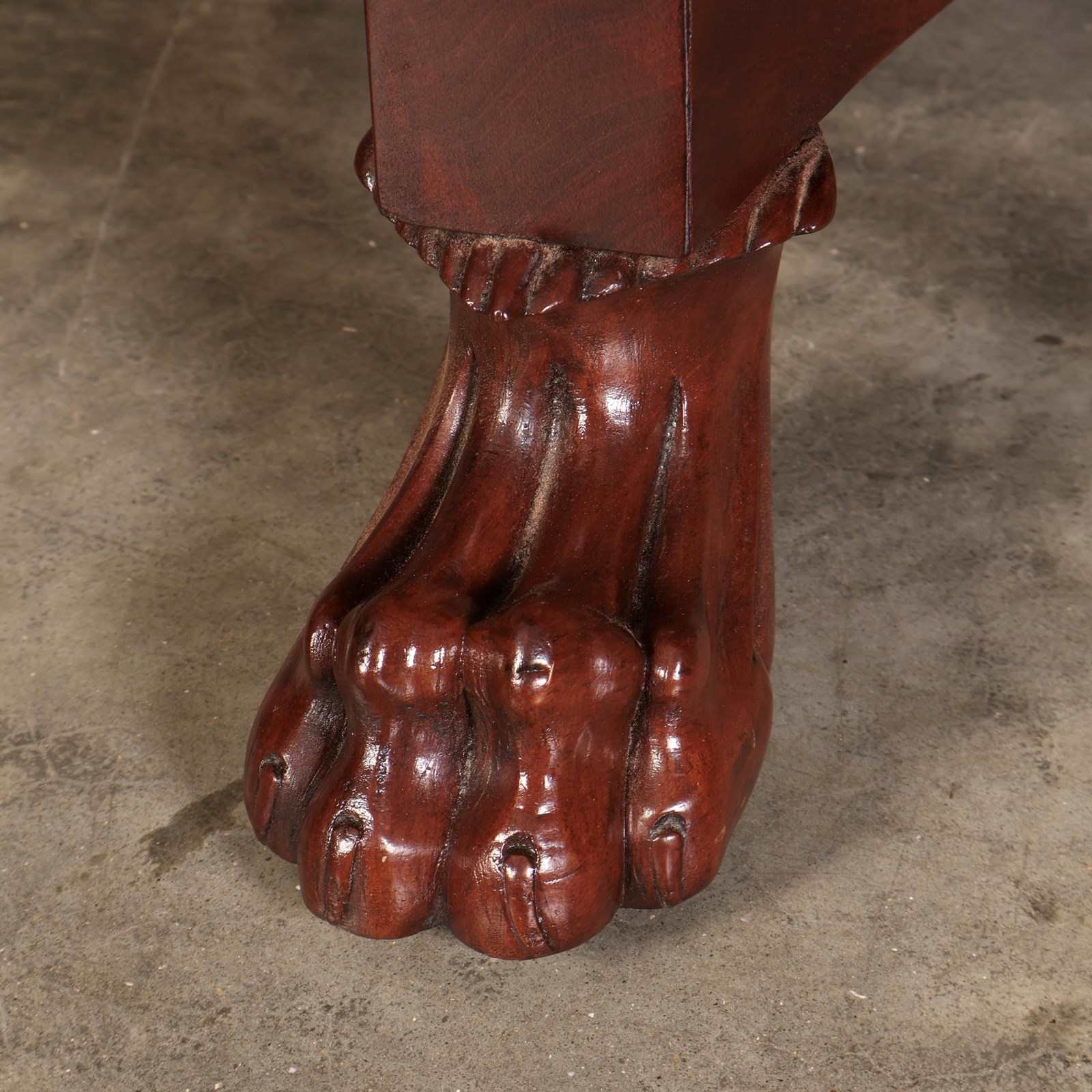 The table is raised on a bold central column with a tri-form base, terminating in finely carved paw feet.