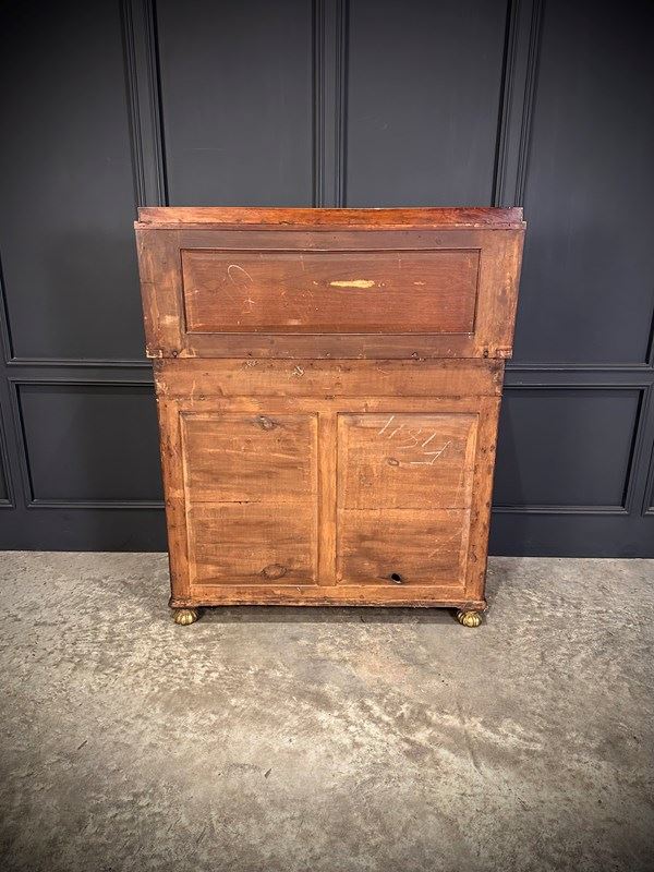 The superstructure is fitted with a mirror upstand, framed by turned supports with attractive gilt detailing. This sits above 2 drawers to the frieze, above a pair of well-figured panelled cupboard doors, enclosing a practical interior fitted with a single shelf.