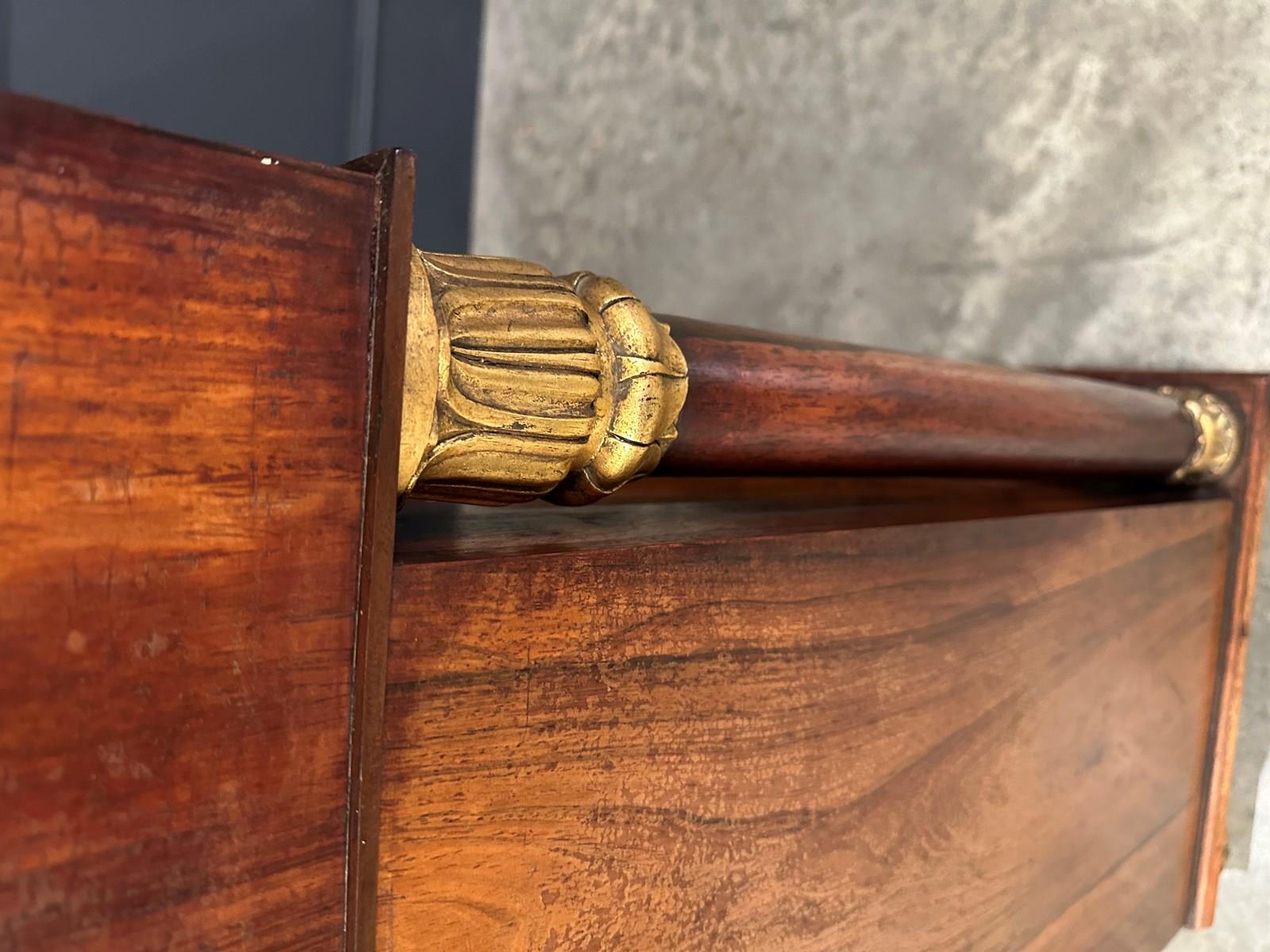 The cabinet is further enhanced by bold turned front columns with ornate gilt capitals and bases, standing on carved bun feet.