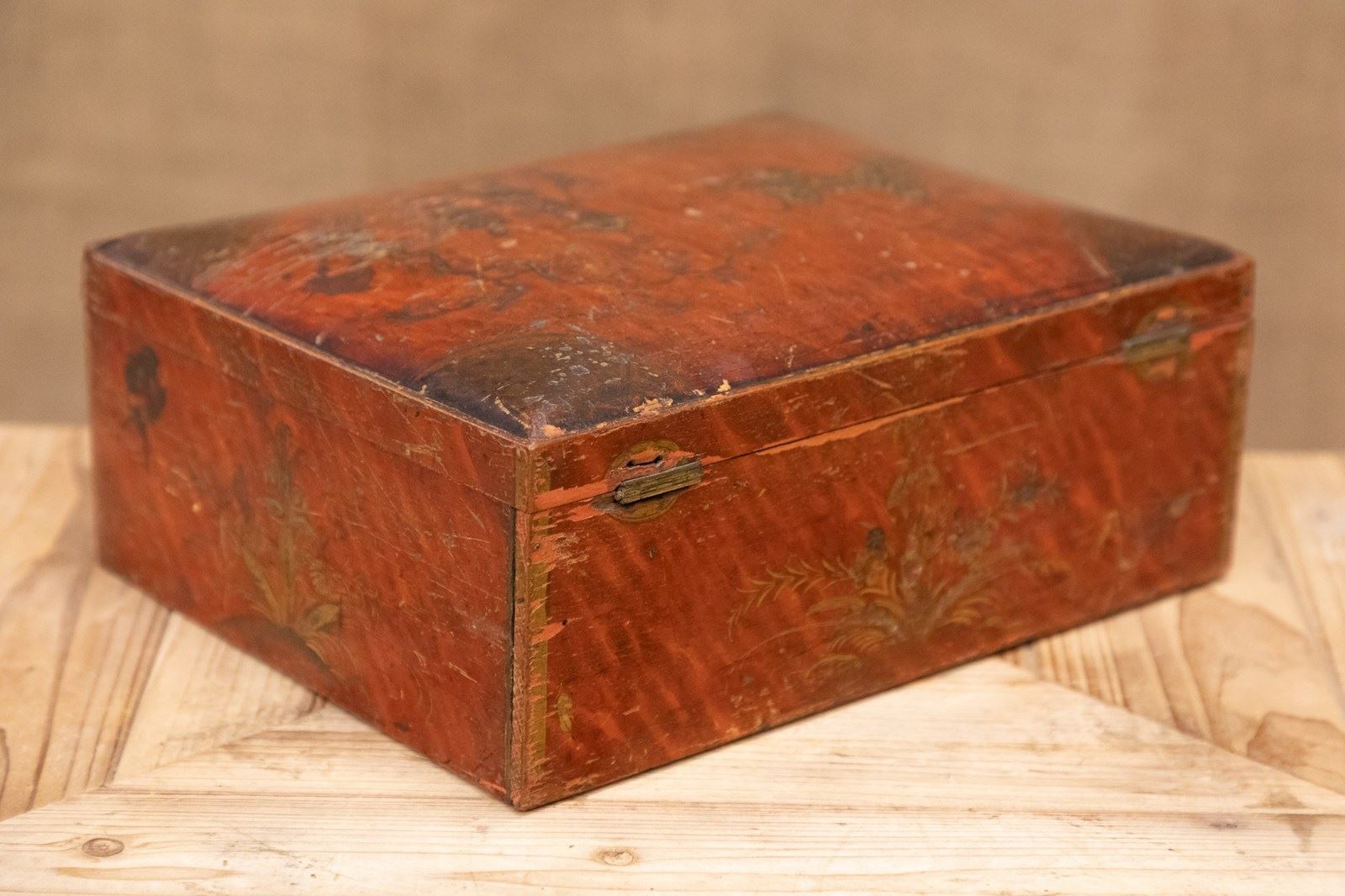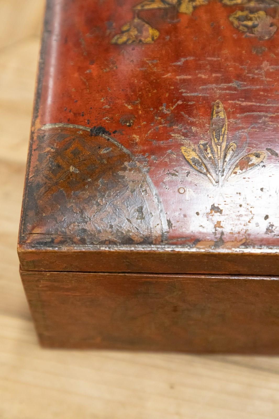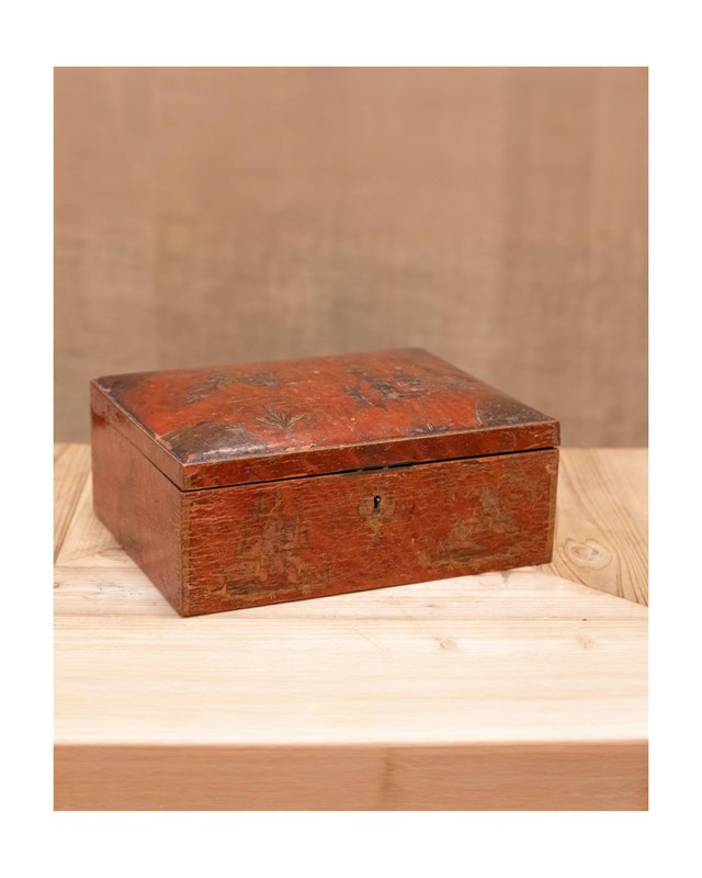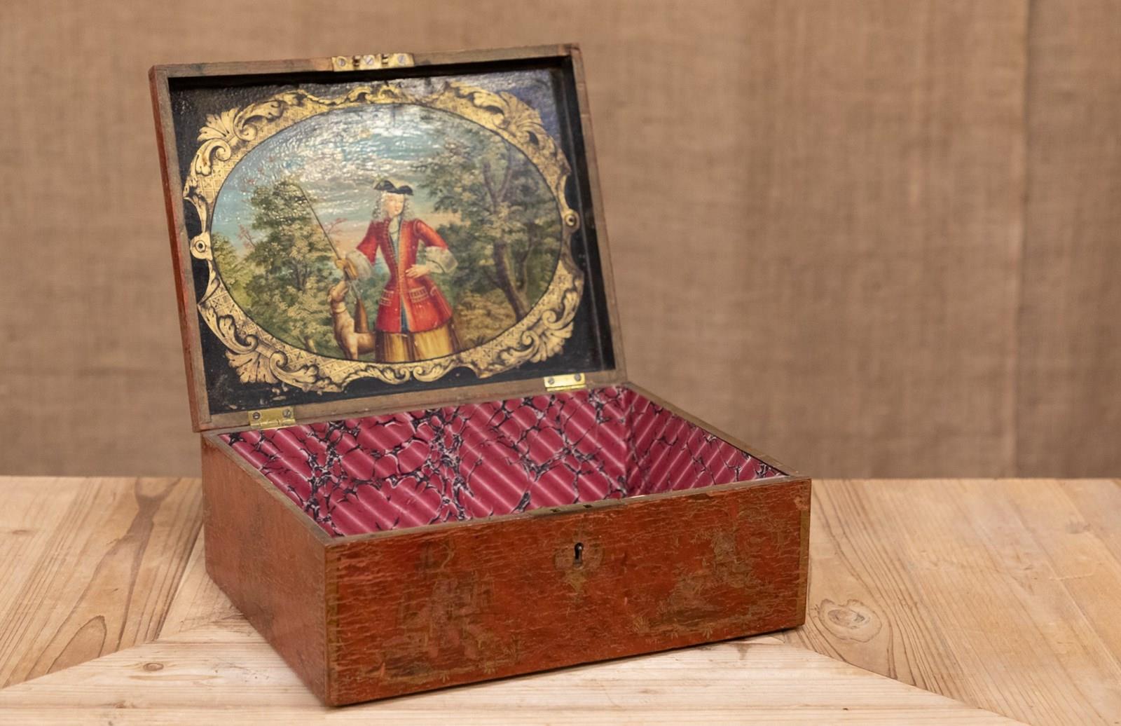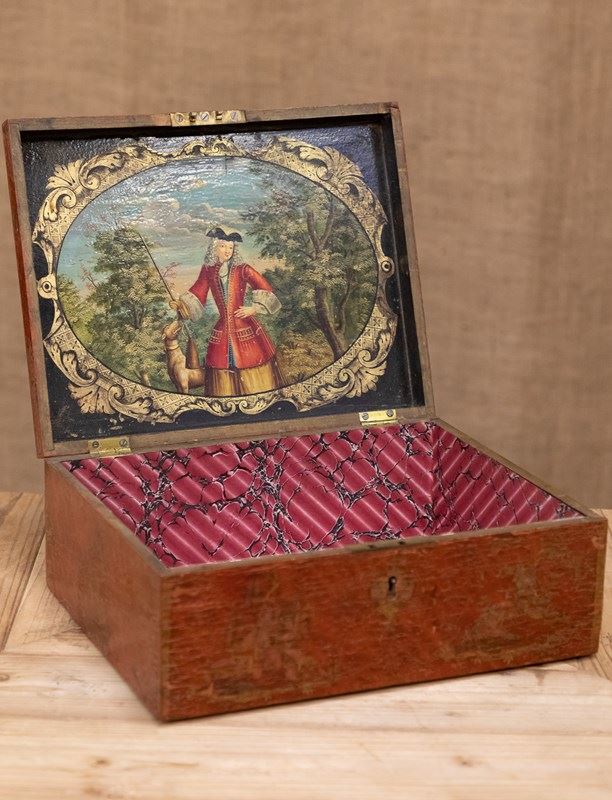 A beautiful 18th century red lacquered deed or document box with chinoiserie decoration. The lid opens to reveal the inside painted with a huntsman in a woodland scene. The interior of the box ice lined with marbled paper. With a lovely colour and patina the box has a wonderful country house look.