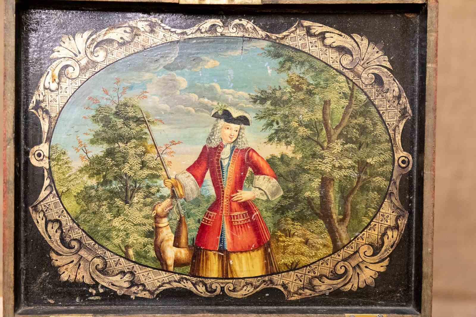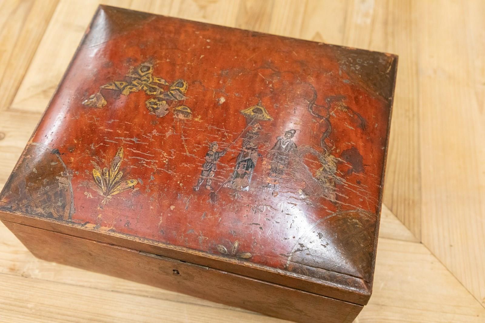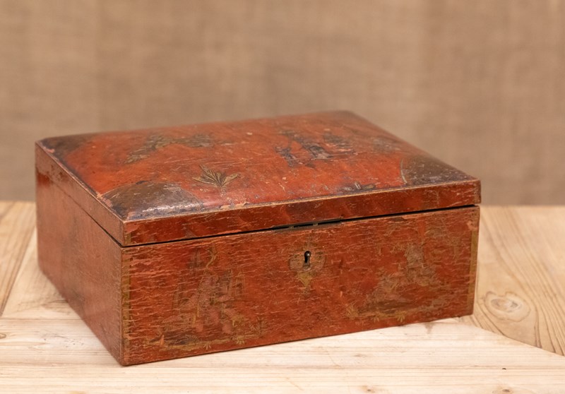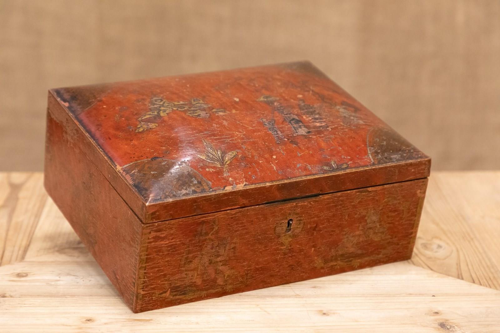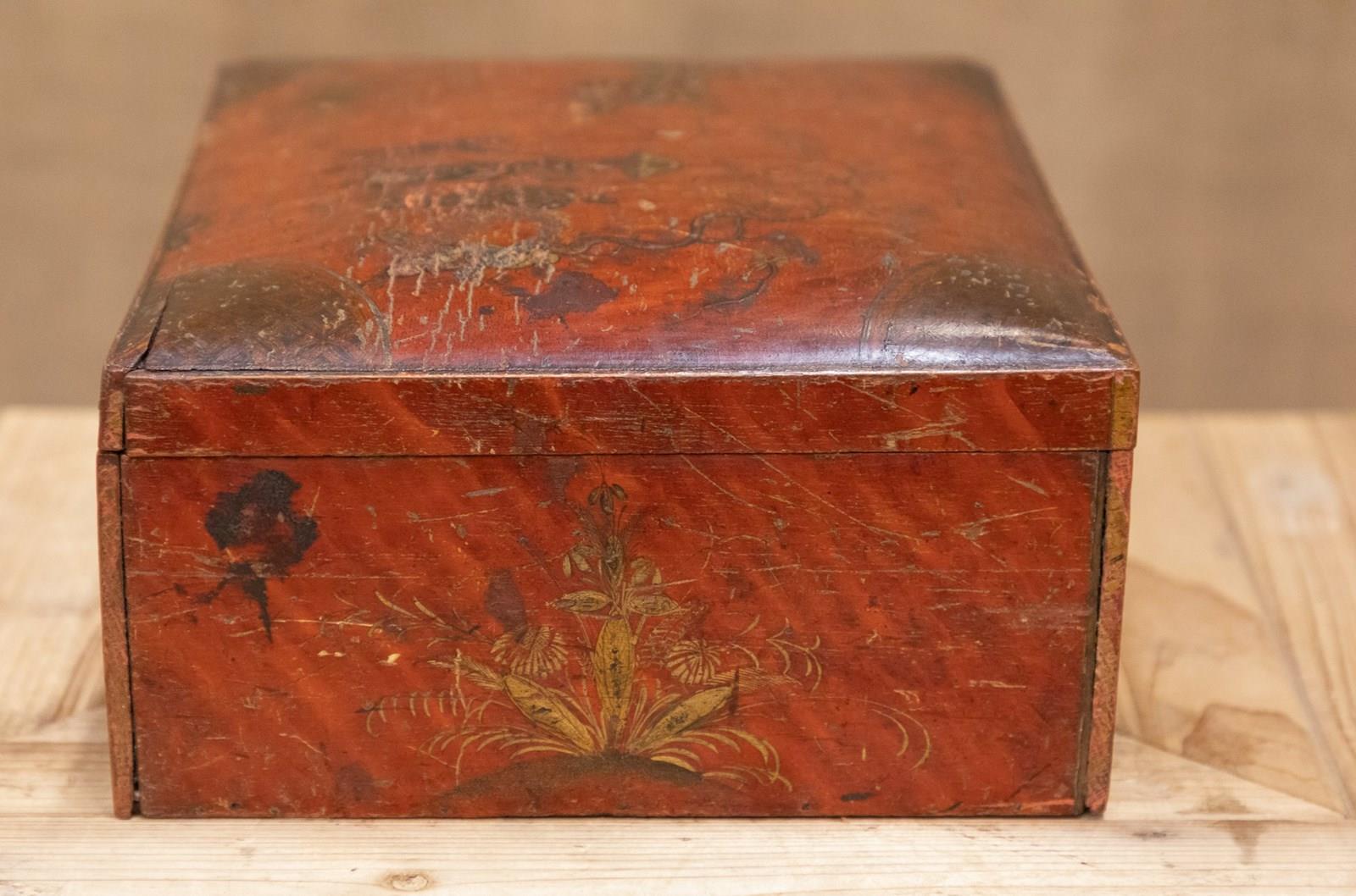A beautiful 18th century red lacquered deed or document box with chinoiserie decoration. The lid opens to reveal the inside painted with a huntsman in a woodland scene. The interior of the box ice lined with marbled paper. With a lovely colour and patina the box has a wonderful country house look.