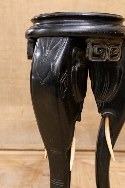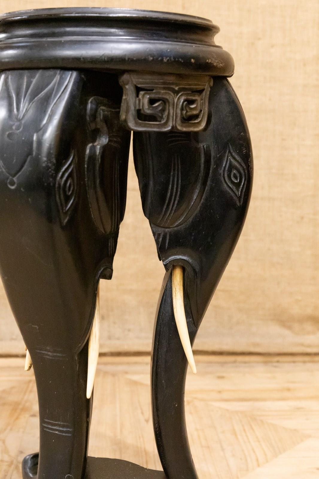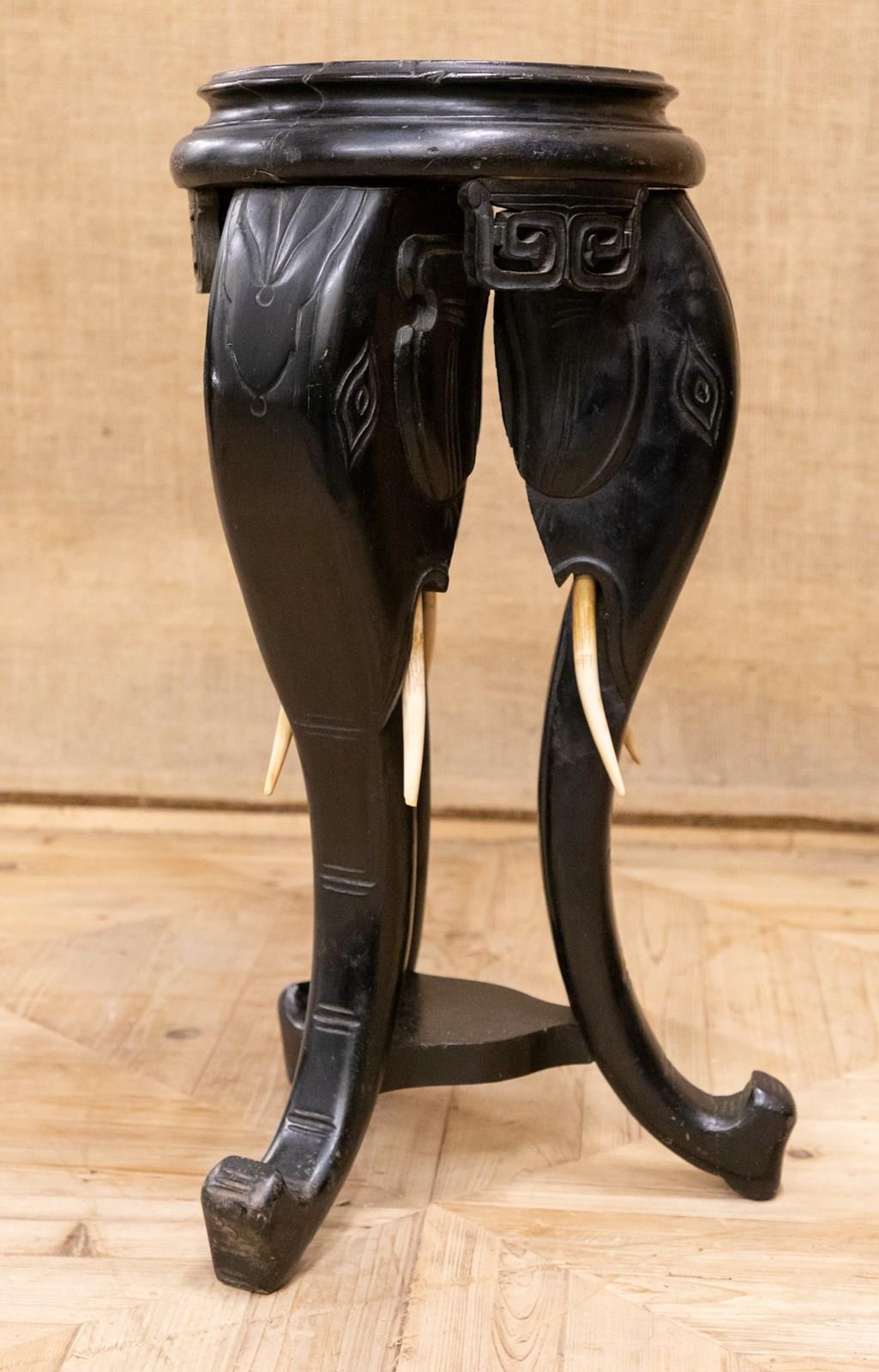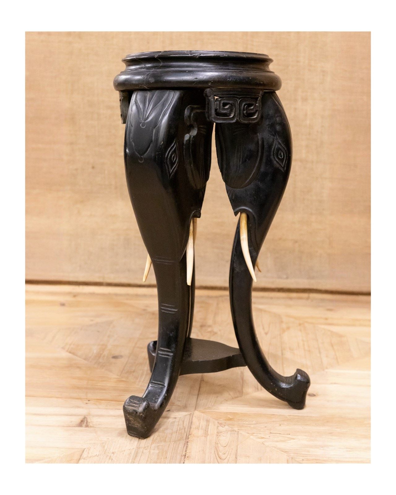 A stunning 19th century ebonised pedestal formed of three carved elephants heads resting on their trunks very much in the style of Gabriel Viardot. With the original ebonised finish and retain gin al the original carved and painted wooden tusks.