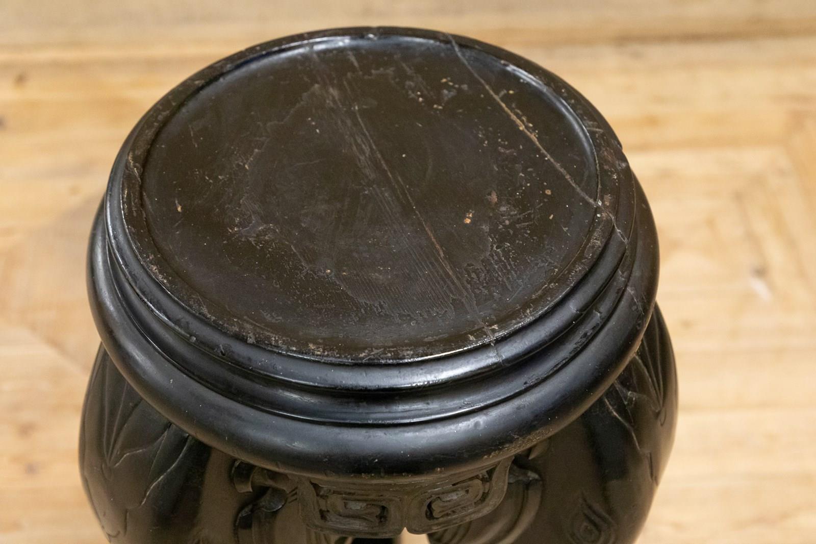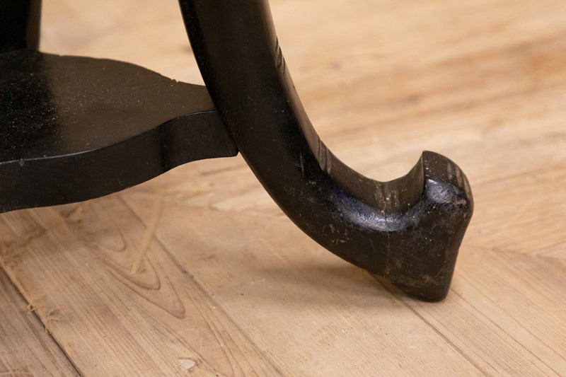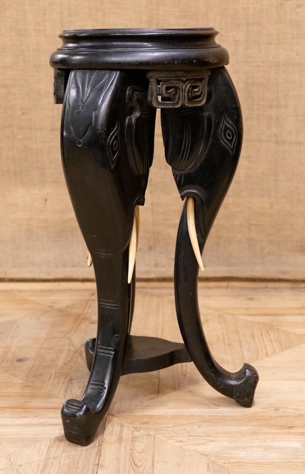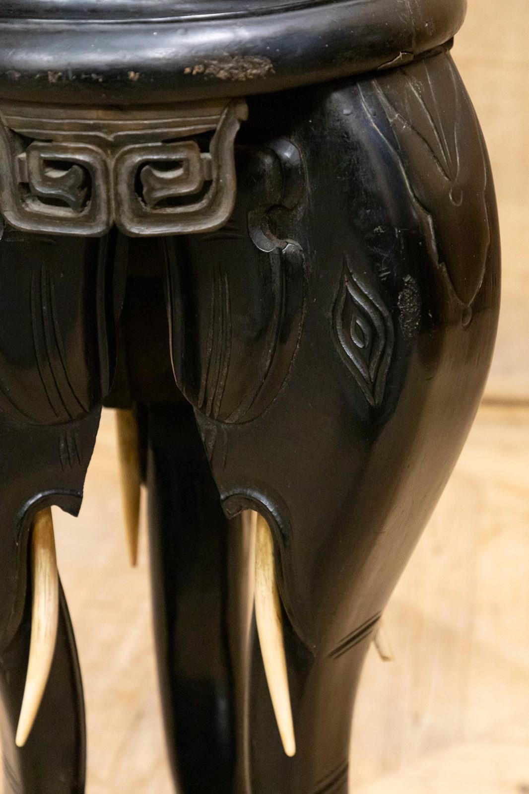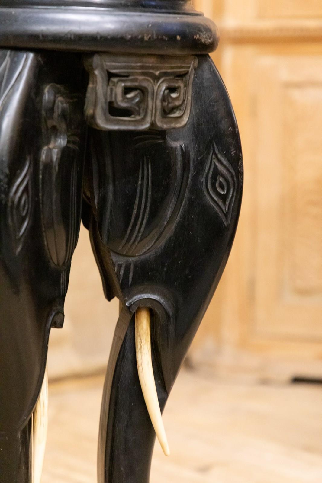 A stunning 19th century ebonised pedestal formed of three carved elephants heads resting on their trunks very much in the style of Gabriel Viardot. With the original ebonised finish and retain gin al the original carved and painted wooden tusks.