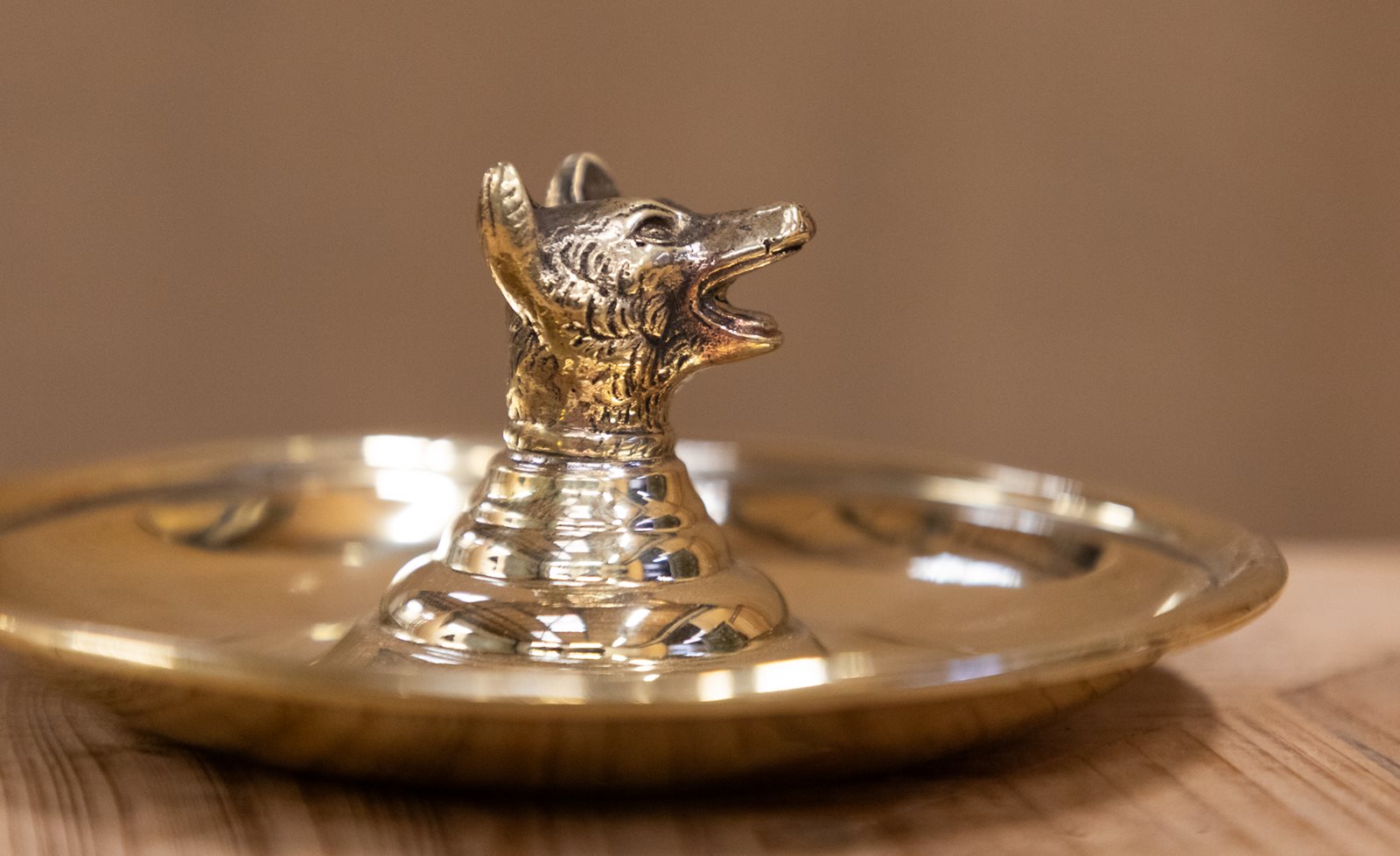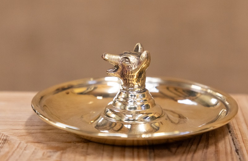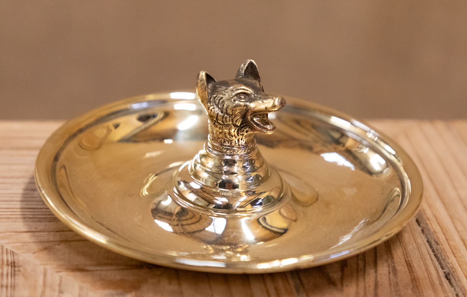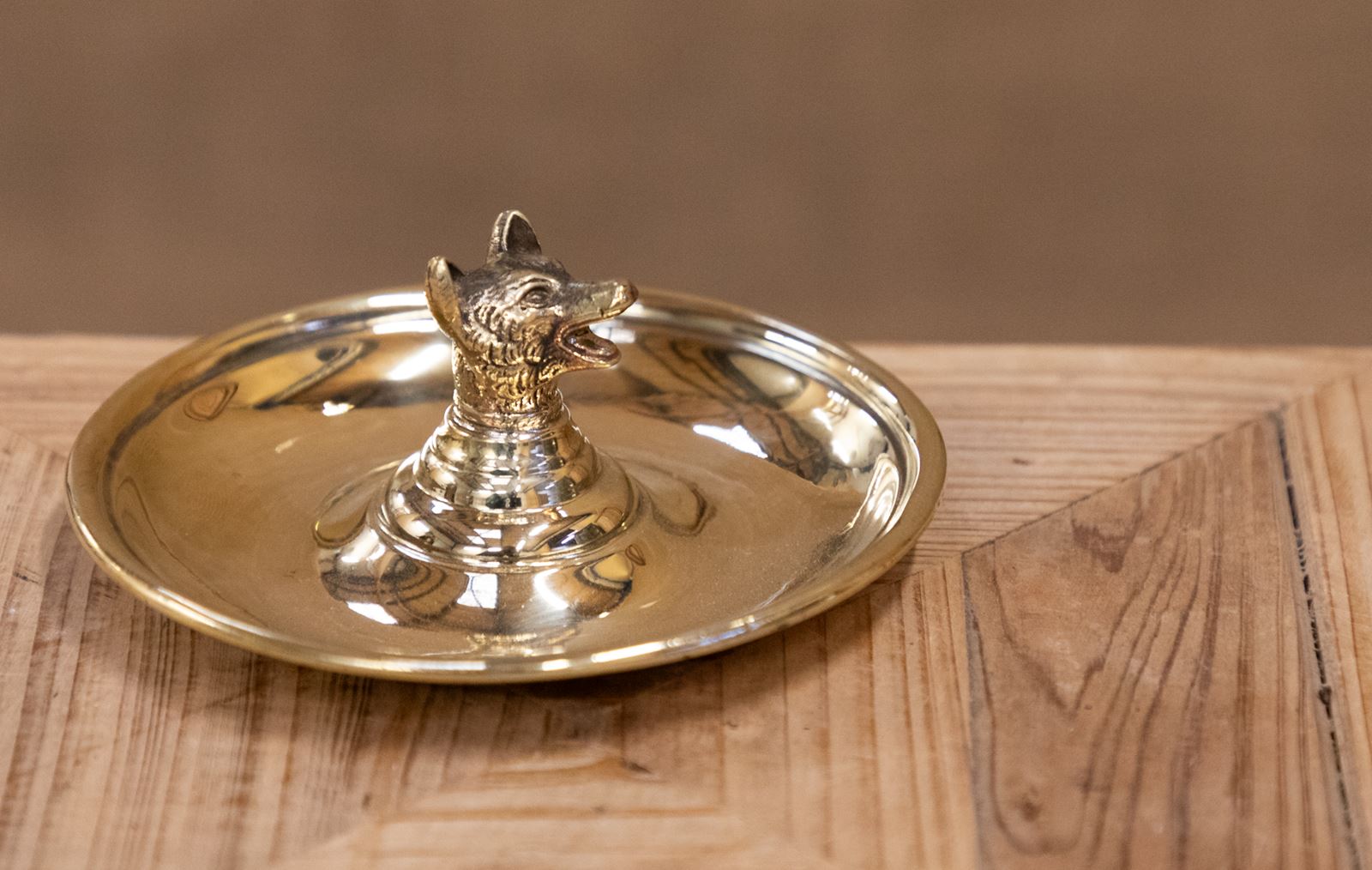 A lovely polished brass ring tray or jewellery dish with a cast fox head finial.