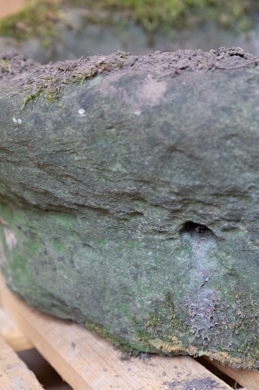 A fabulous circular York Stone trough, cut on an angle to aid with animal feeding the trough would make a lovely planter or water feature. Nicely weathered, moss covered with a great colour and patina.