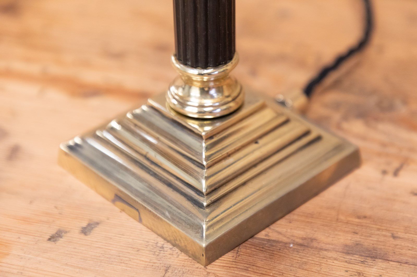 A stunning quality small corinthian column table lamp with reeded ebony column. Raised on a square stepped base with cast brass capital, fully restored, rewired and PAT tested.