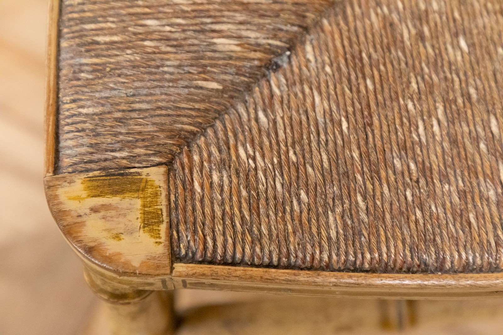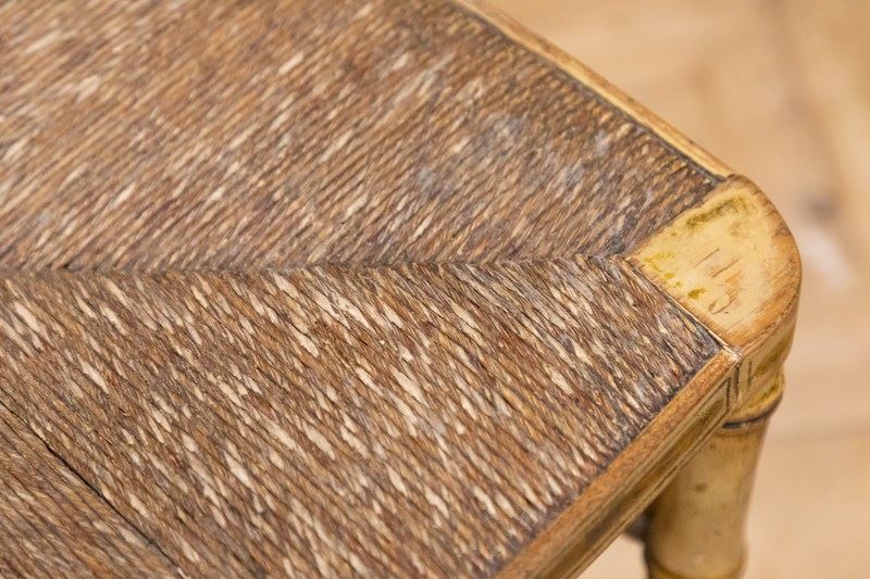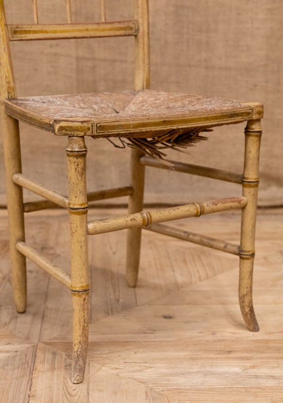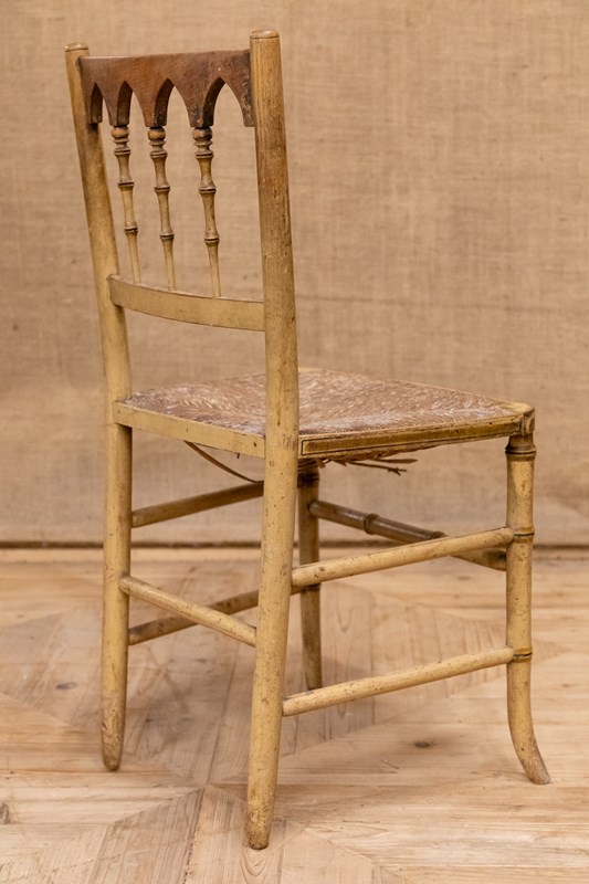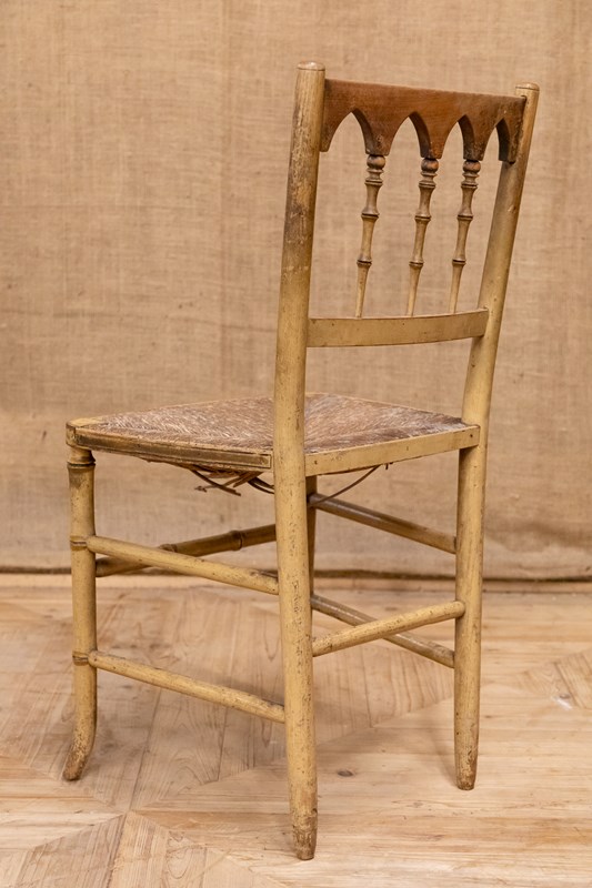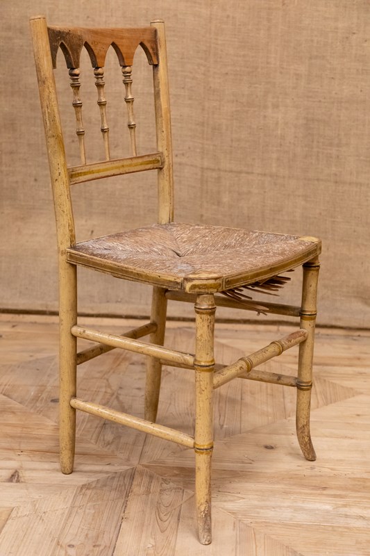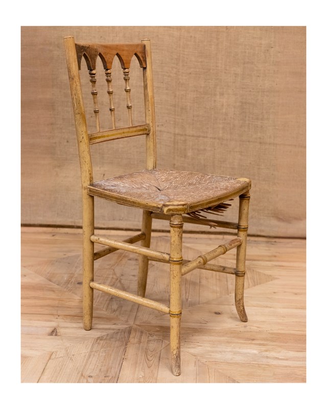 A beautiful early 19th century side chair in the original paint. An unusual design with the back comprising of gothic arches and the legs and frame in simulated bamboo, most probably an amalgamation of the two fashionable styles in the early 19th century. Retaining the original paint and decoration together with the original rush seat. With a lovely country house colour and patina.