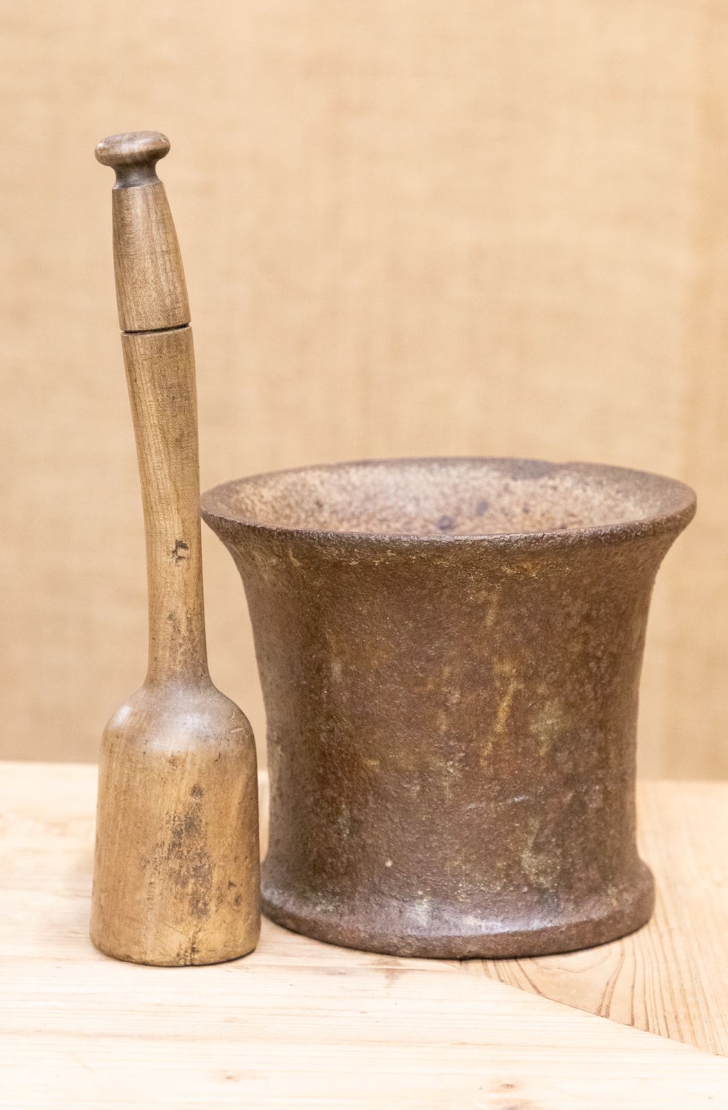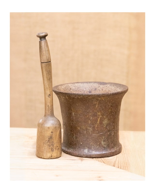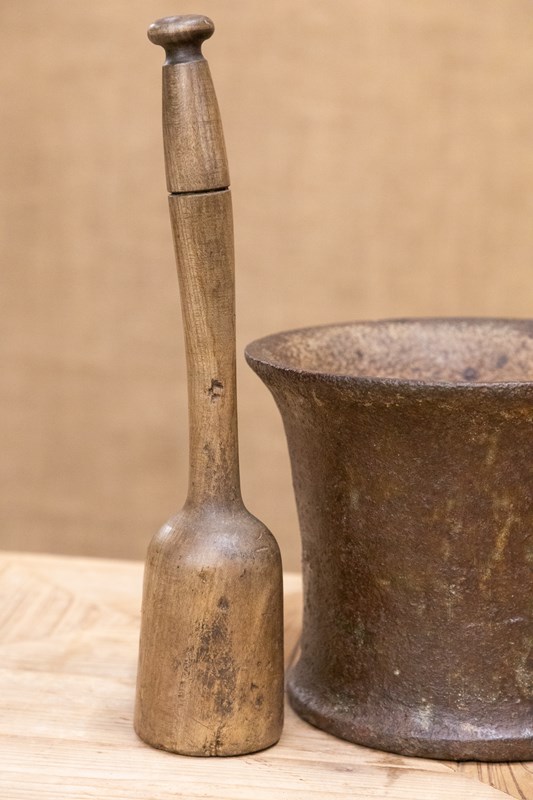 A stunning 18th century cast iron apothecary mortar with associated sycamore pestle. Of fluted she with a wonderful colour and patina.