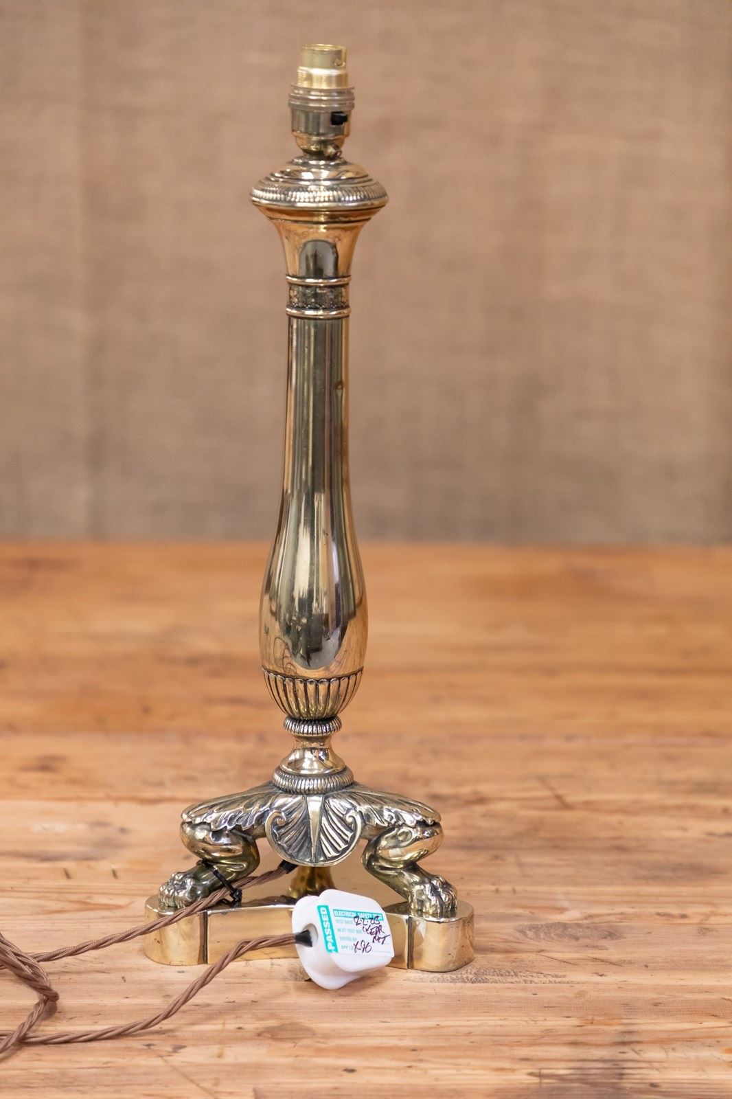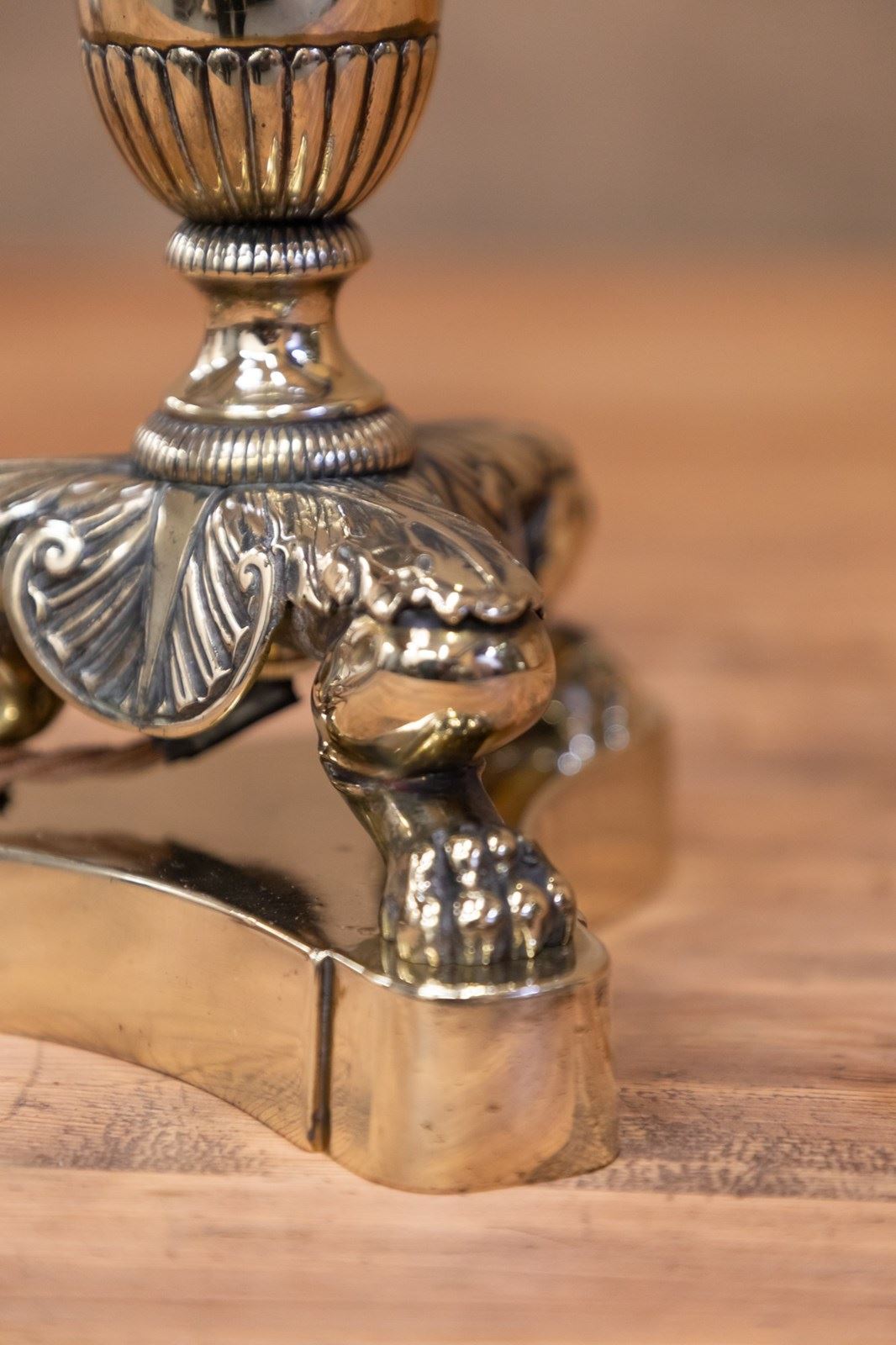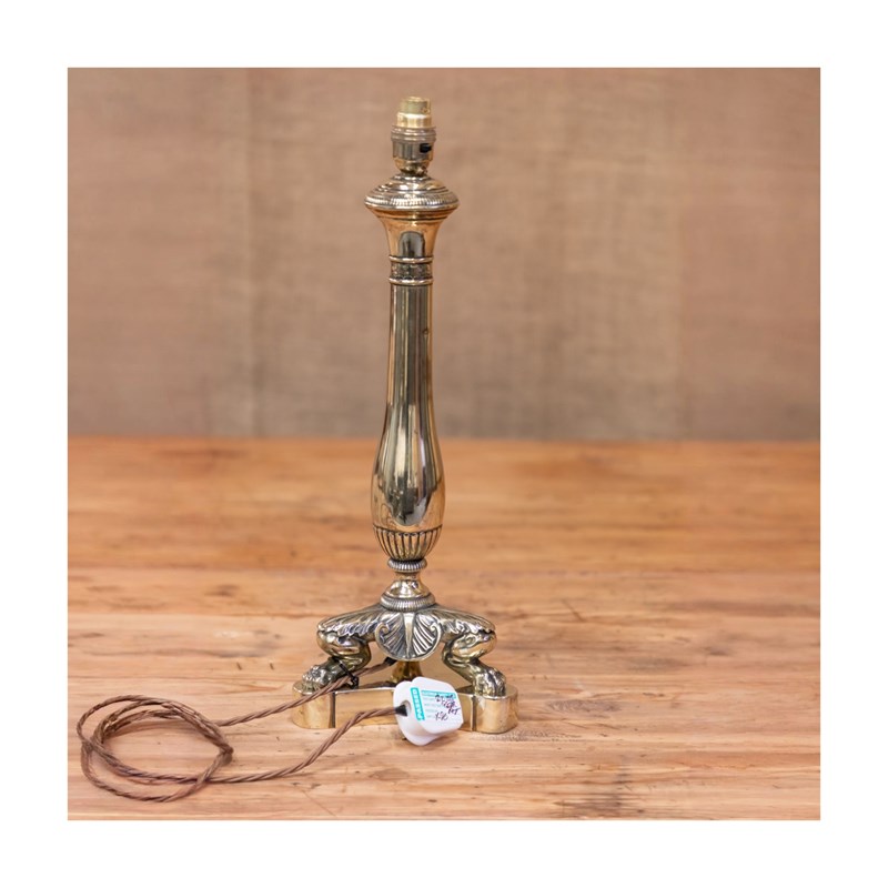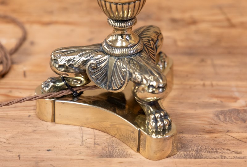 A stunning English Country House table lamp. Originally an oil lamp and later converted to electricity. The brass central column is raised on a wonderful cast base with lions paw feet and acanthus leaves. Fully rewired and PAT tested.