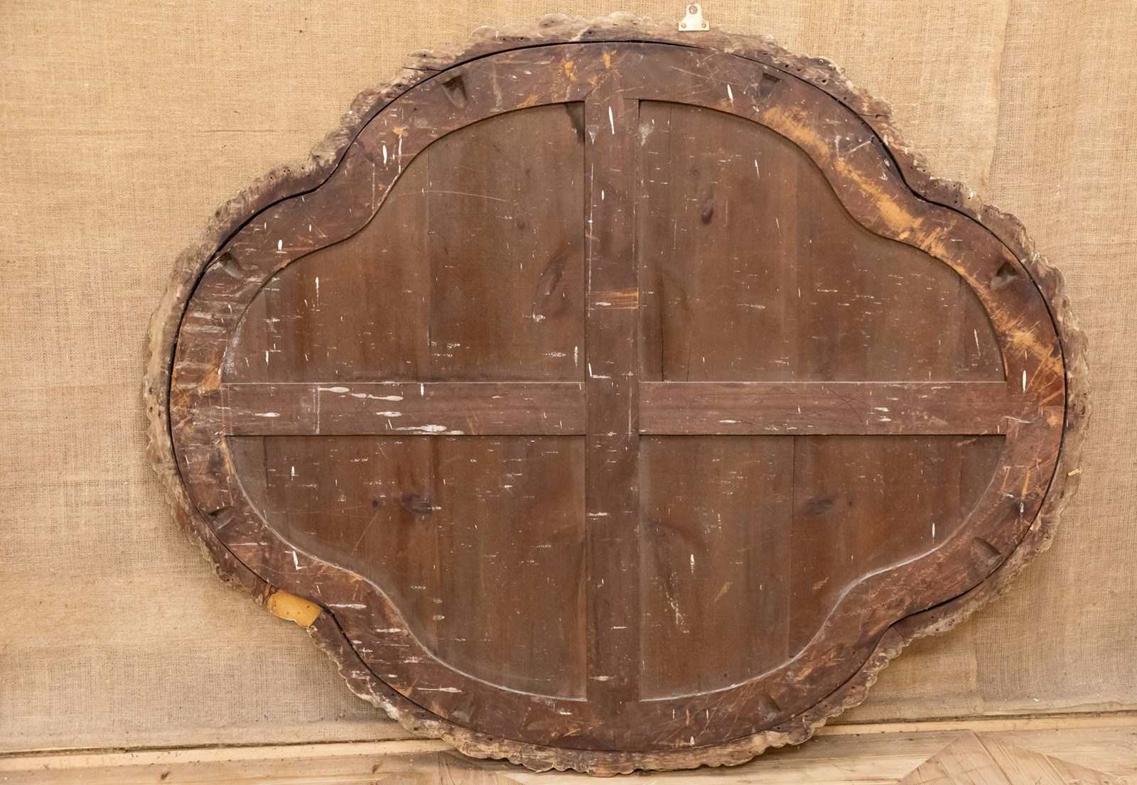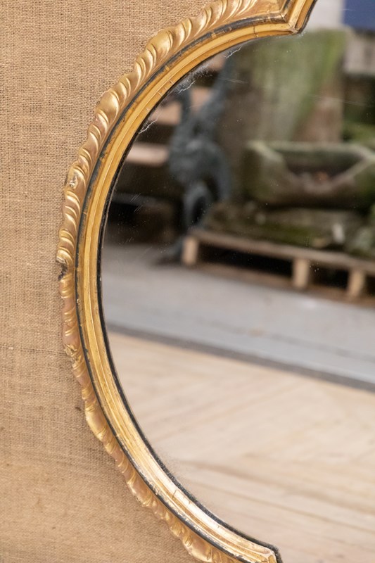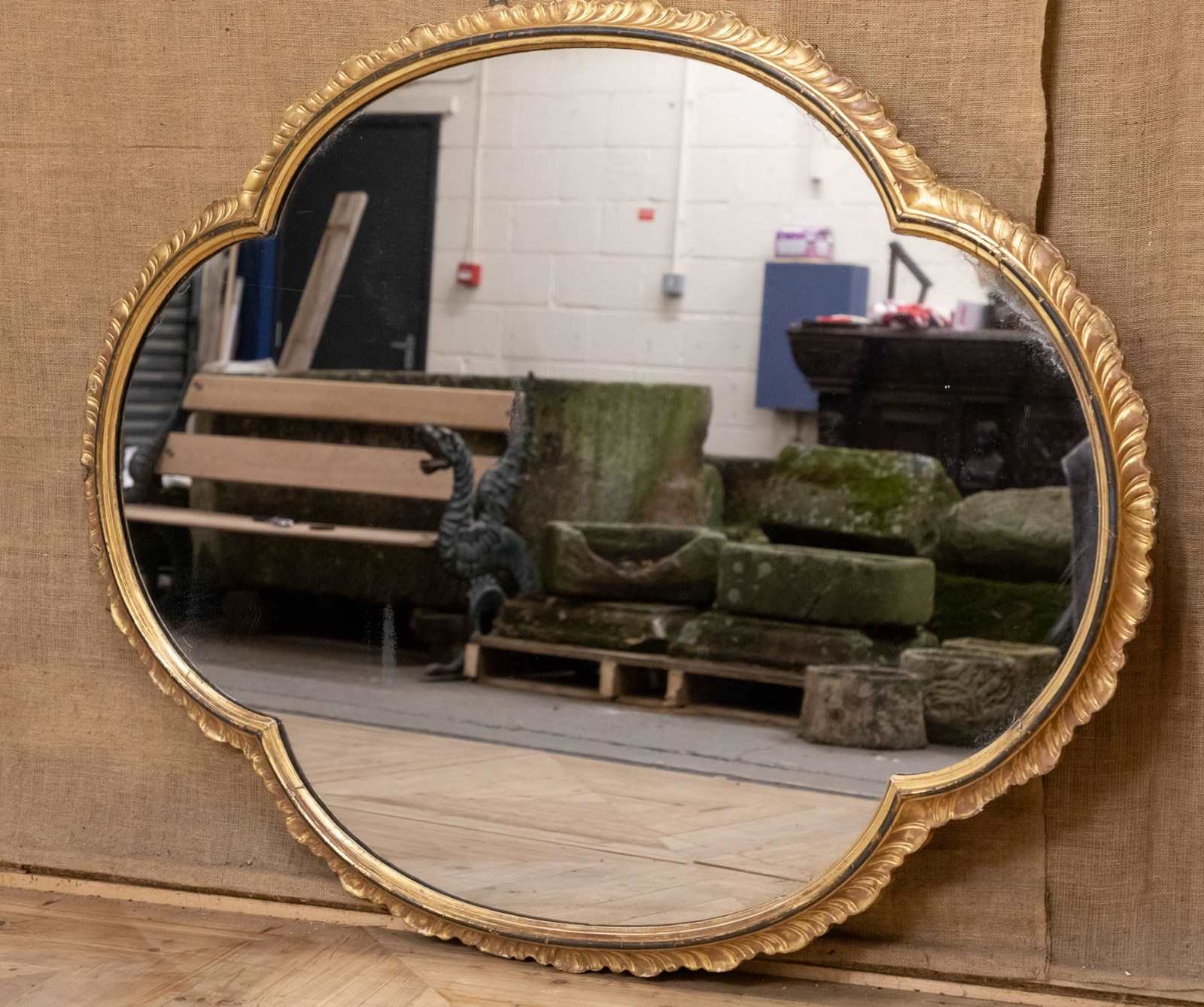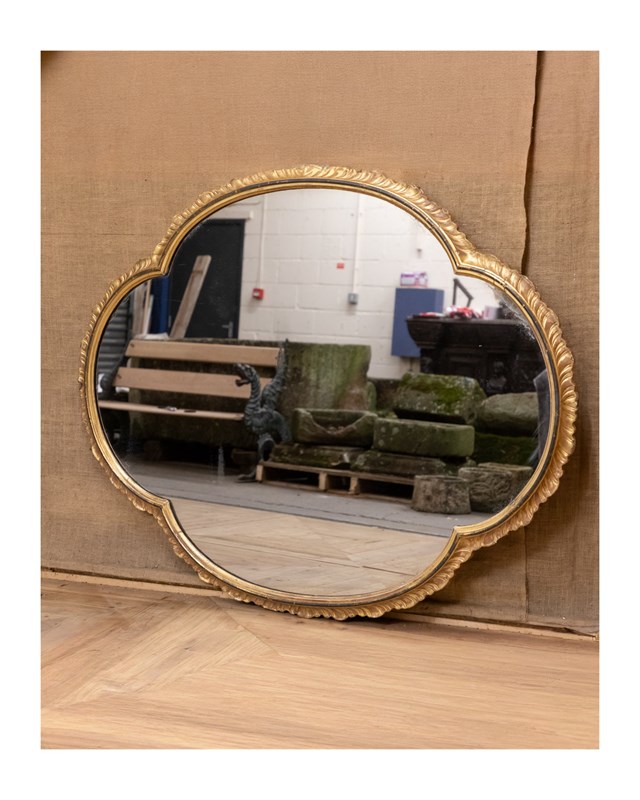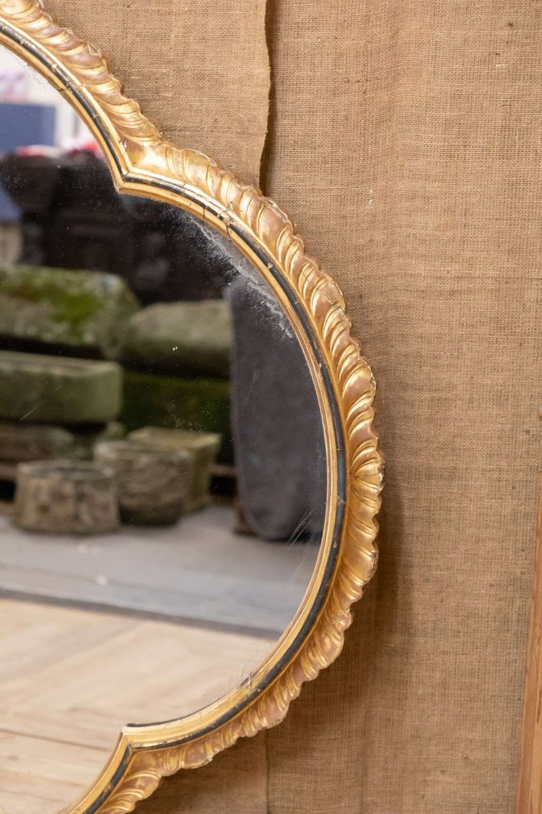 A superb late 18th or early 19th century English country house giltwood mirror in the Gothic revival taste. The mirror is of quatrefoil shape and retains the original mirror plate that has minor foxing to areas and also the original panelled backboards. Retaining all the original gilding the frame has a wonderful colour and patina, carved with a simple rococo scrollwork repeating pattern. In untouched as found country house condition. Can be hung either portrait or landscape.