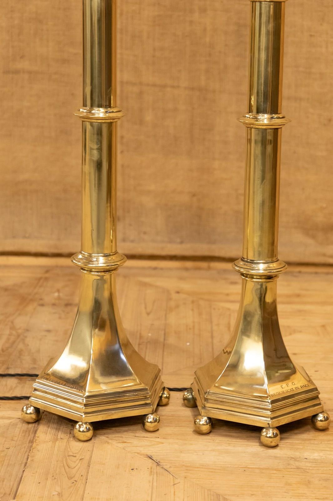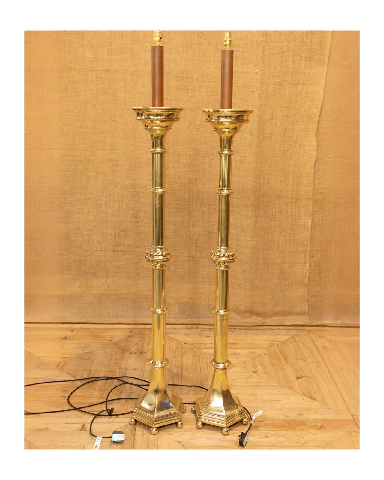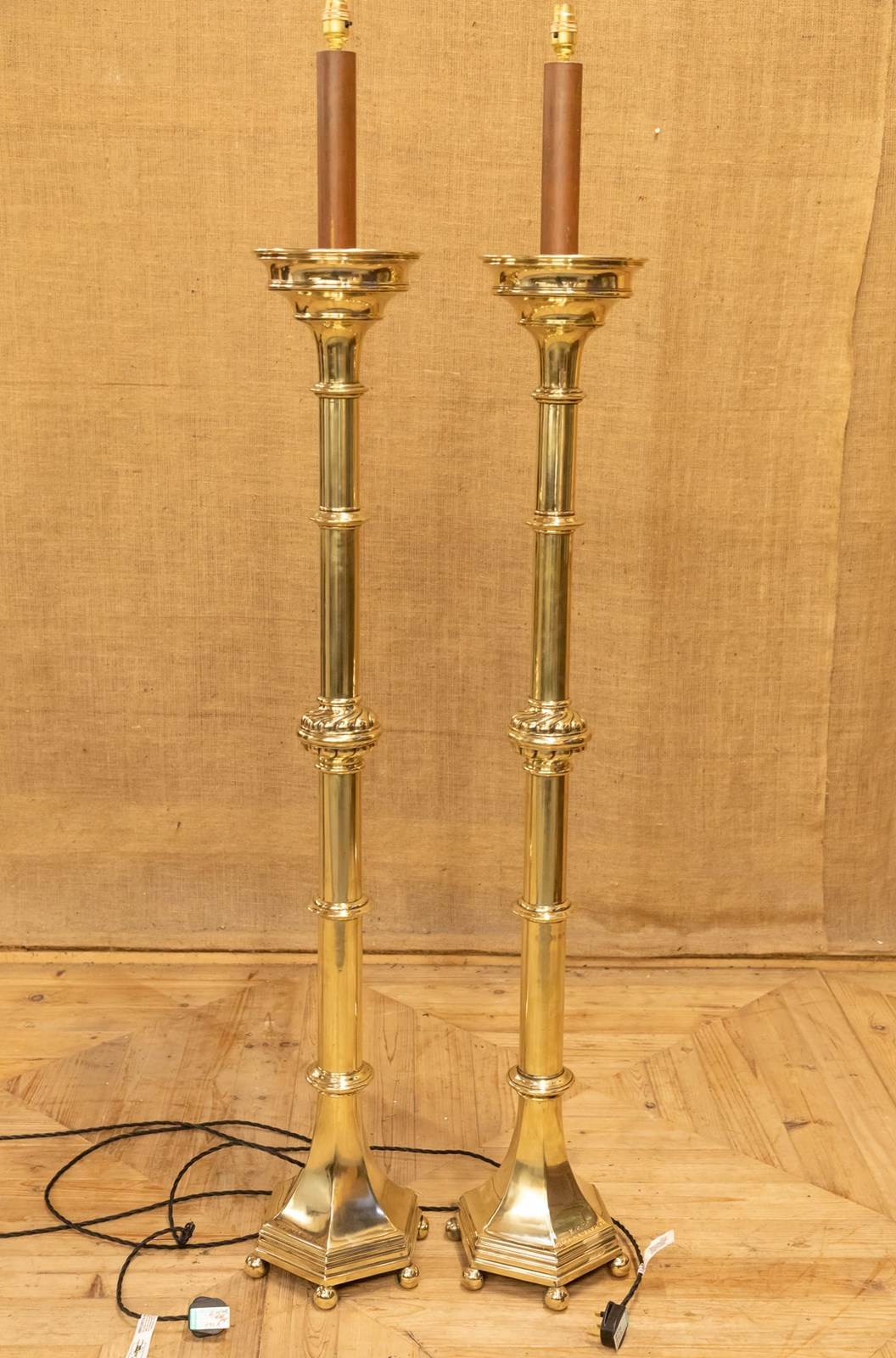 A stunning pair of polished brass floor standing picket candlesticks converted to standard lamps. Of gothic revival taste the central column mounted on a hexagonal tapered base that is raised on bun feet. The column has plain collars with lobed details. Fully rewired and PAT tested.