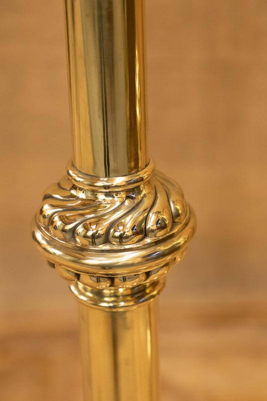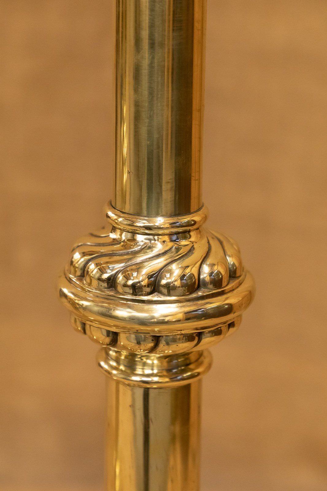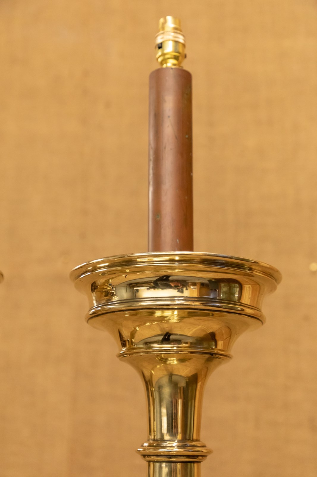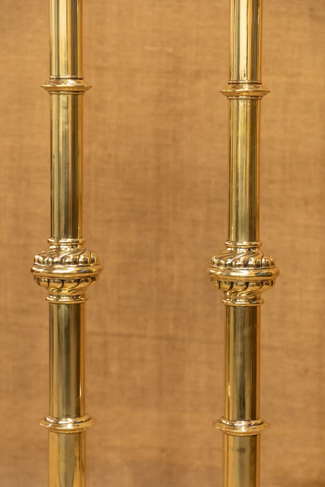 A stunning pair of polished brass floor standing picket candlesticks converted to standard lamps. Of gothic revival taste the central column mounted on a hexagonal tapered base that is raised on bun feet. The column has plain collars with lobed details. Fully rewired and PAT tested.