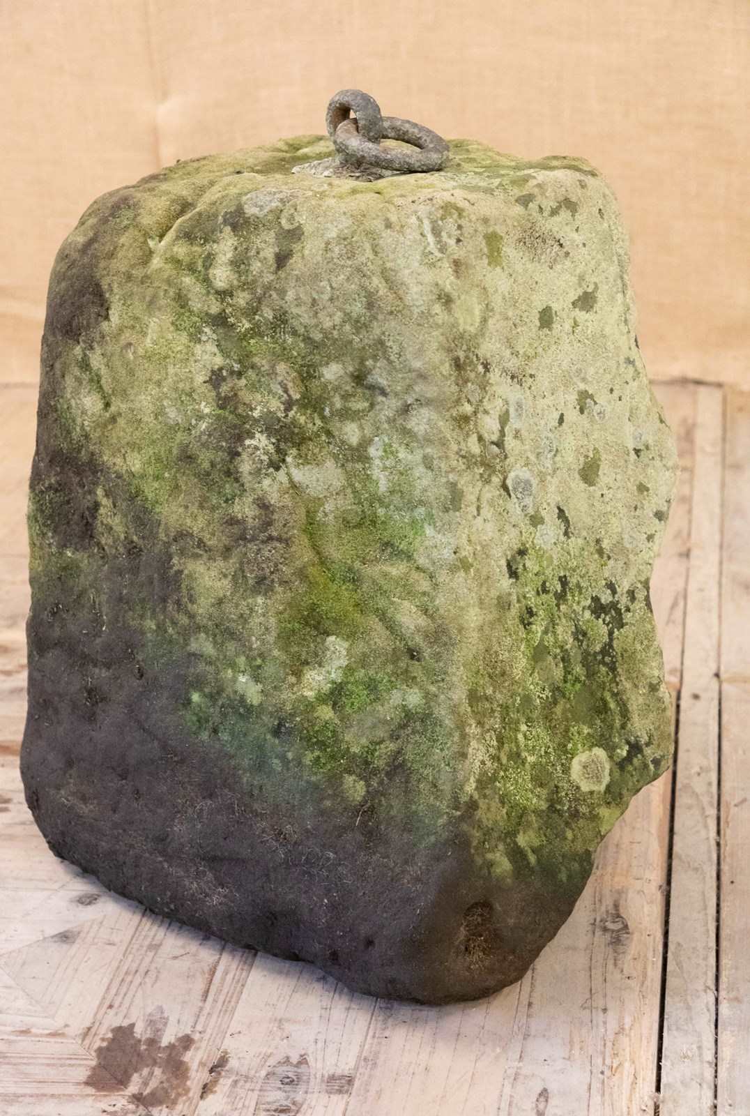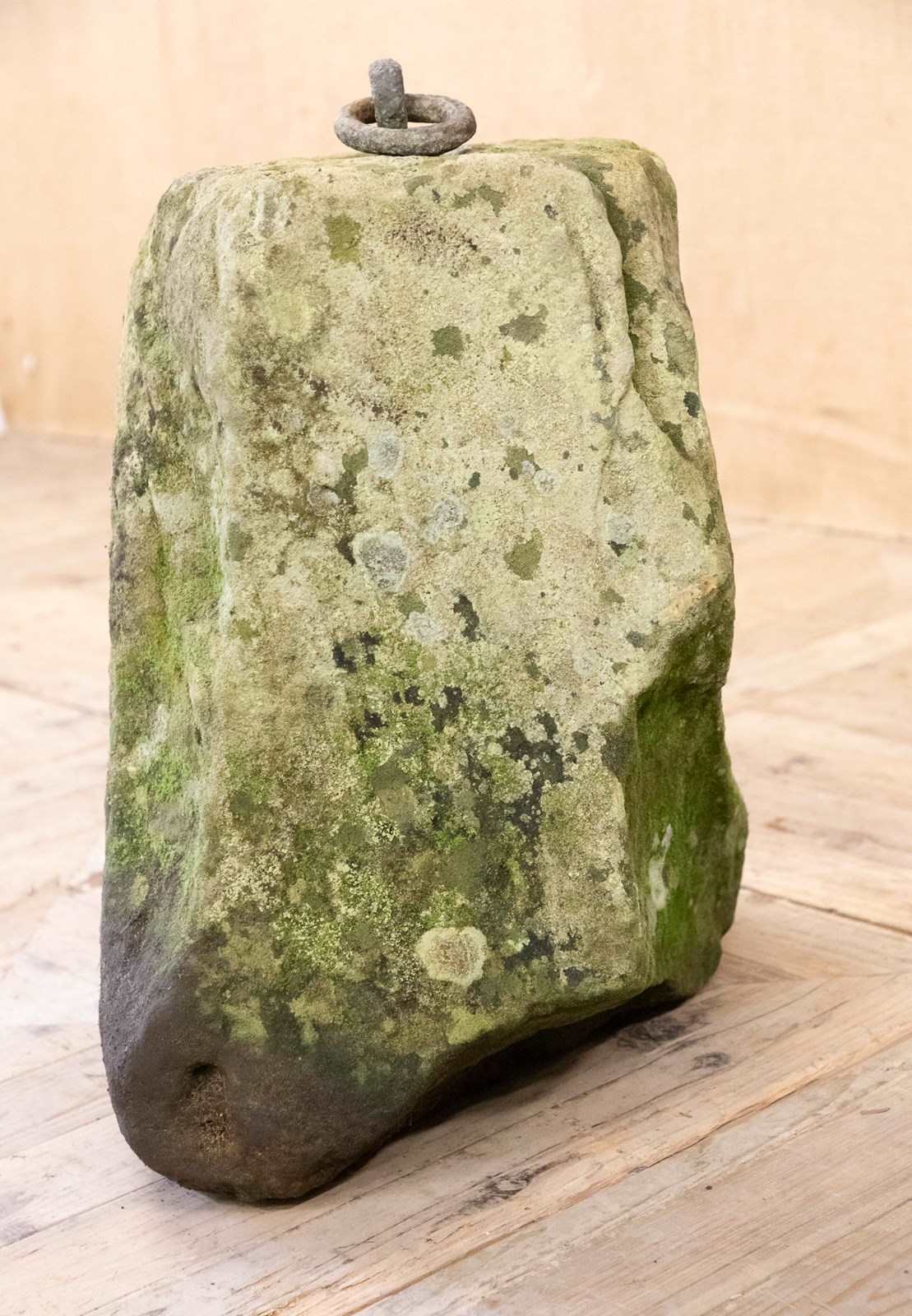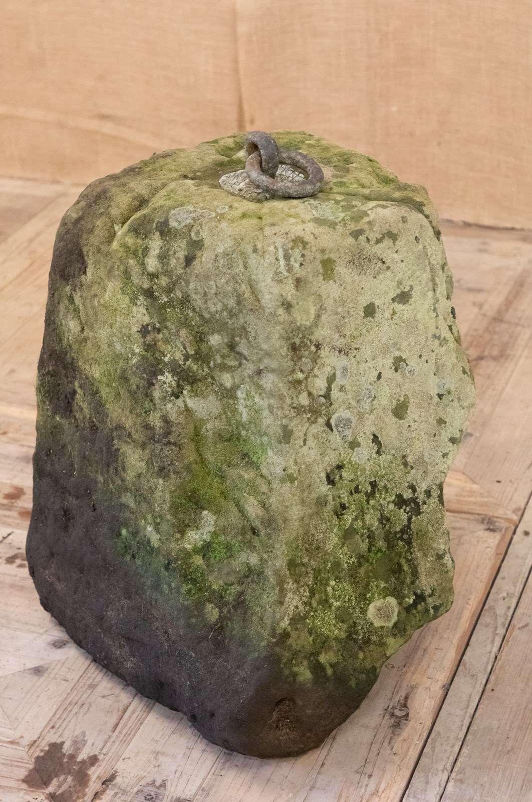 A fantastic large scale sculptural York Stone tethering stone. The large rectangular piece of York stone has had a large iron loop lead mounted into the top of it for use tethering animals. With a fabulous colour and patina.