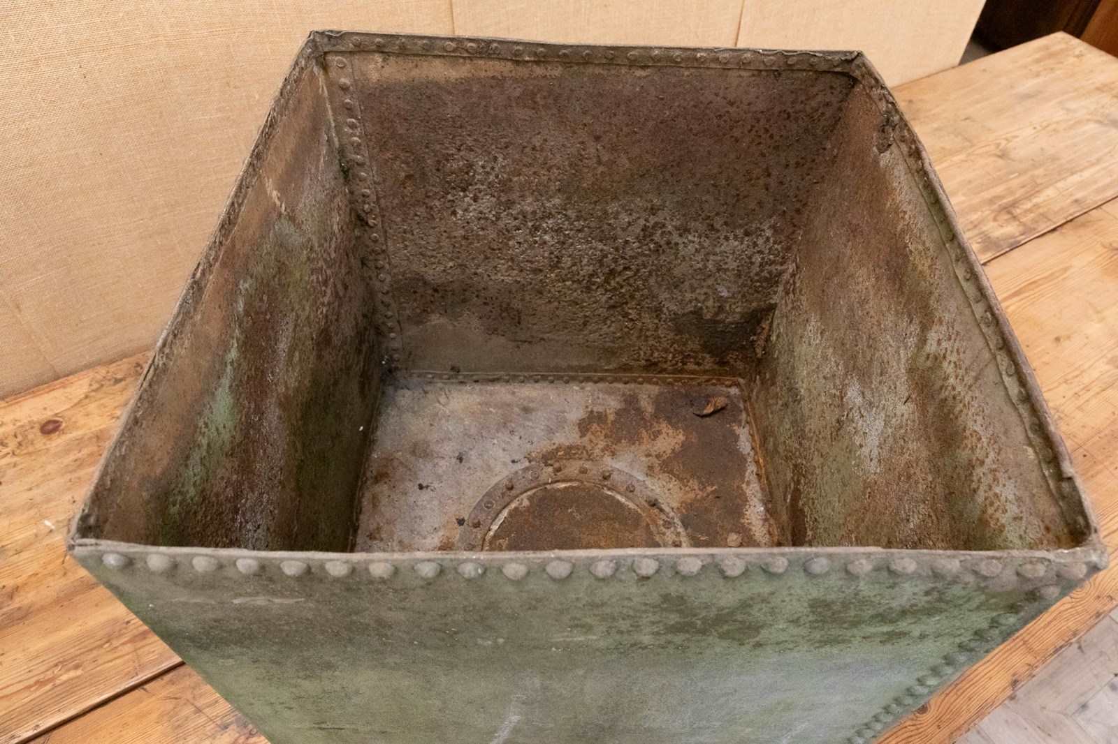 A fantastic zinc galvanised cube water tank. More recently used as a garden planter. Of traditional construction with wonderful riveted details. Fabulous surface, colour and patina.
