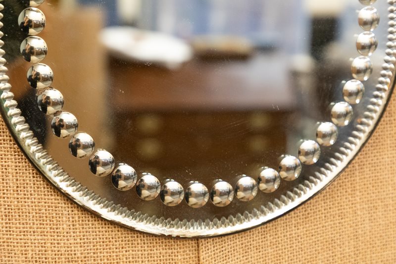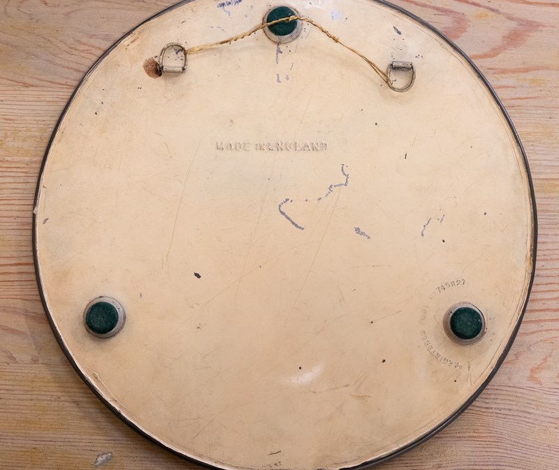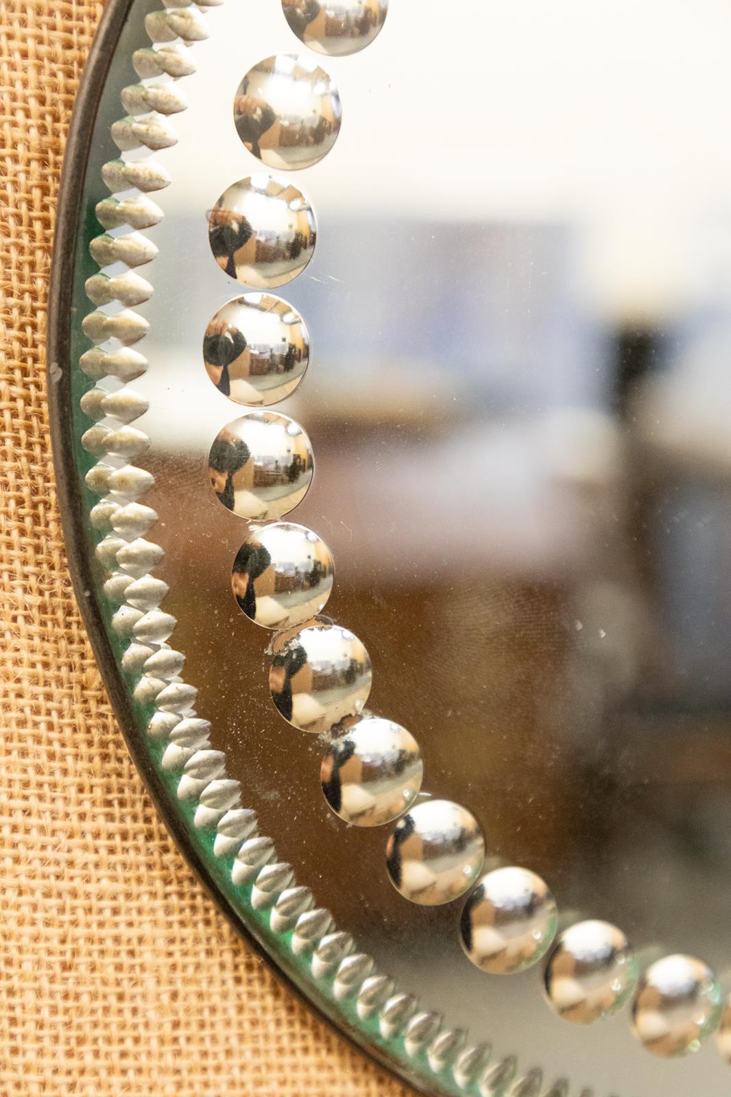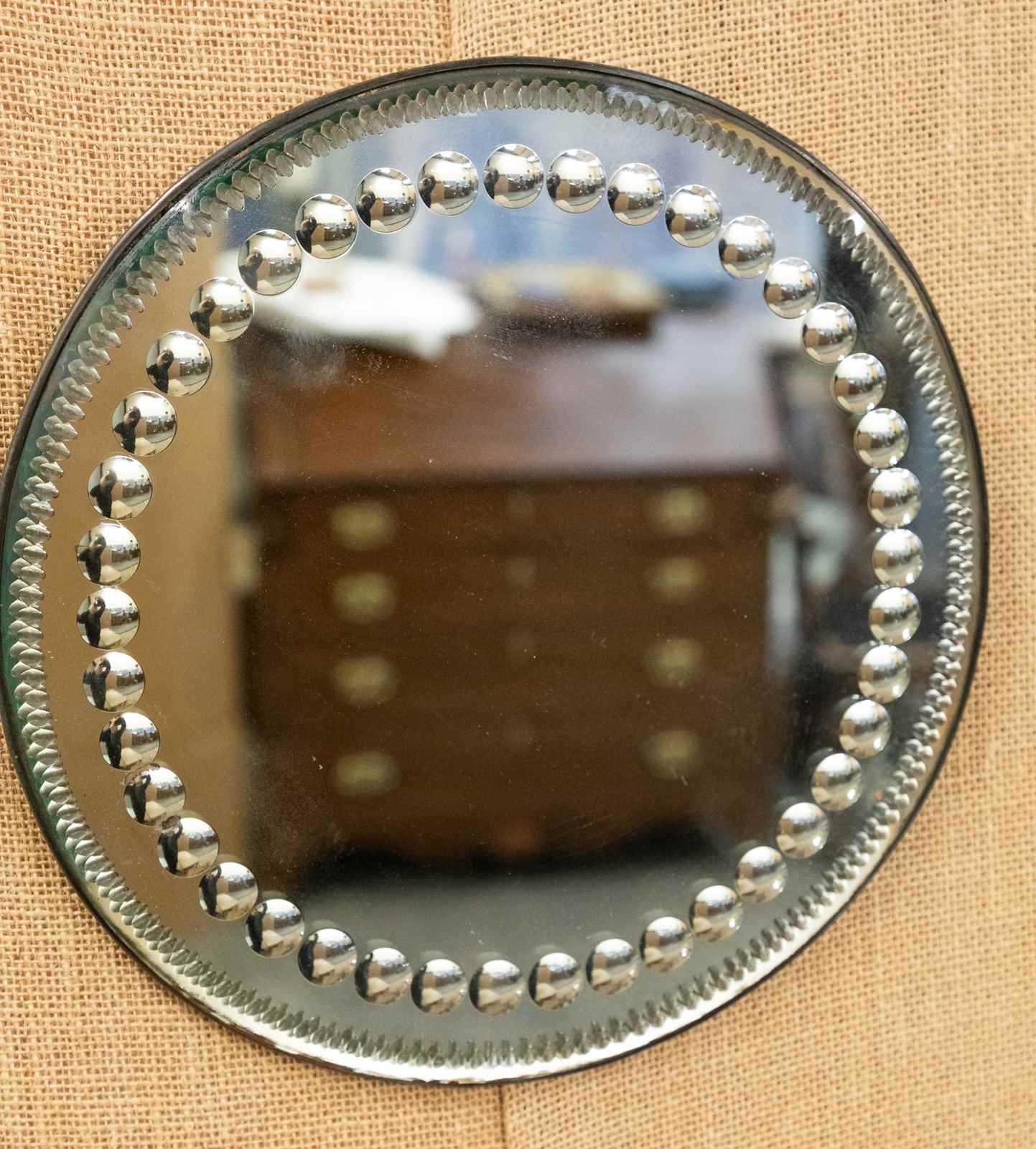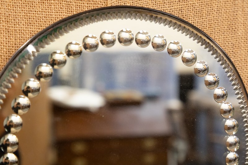 A wonderful early 20th century circular sorcerer's mirror with bevelled edge and nickel frame. The back is tin lined with Made In England impressed into the back. Raised on four pressed feet the mirror can be wall mounted or alternatively used as a table centrepiece.