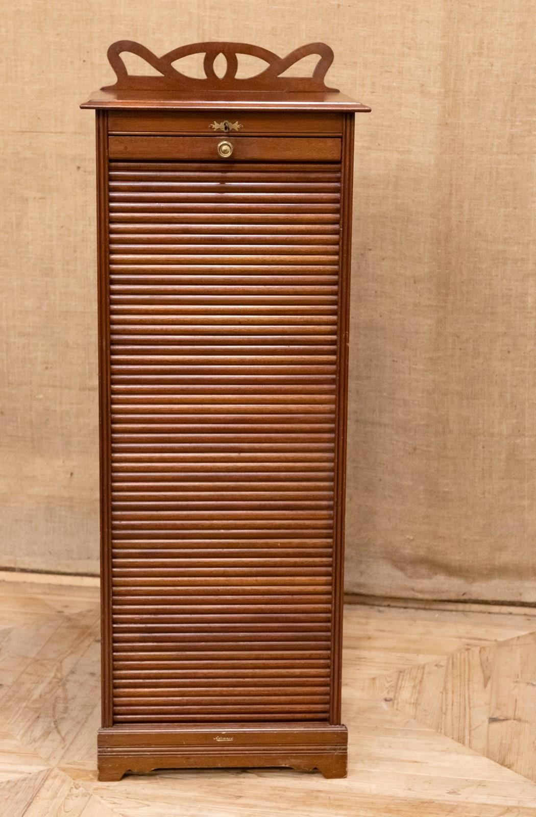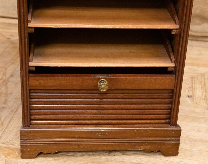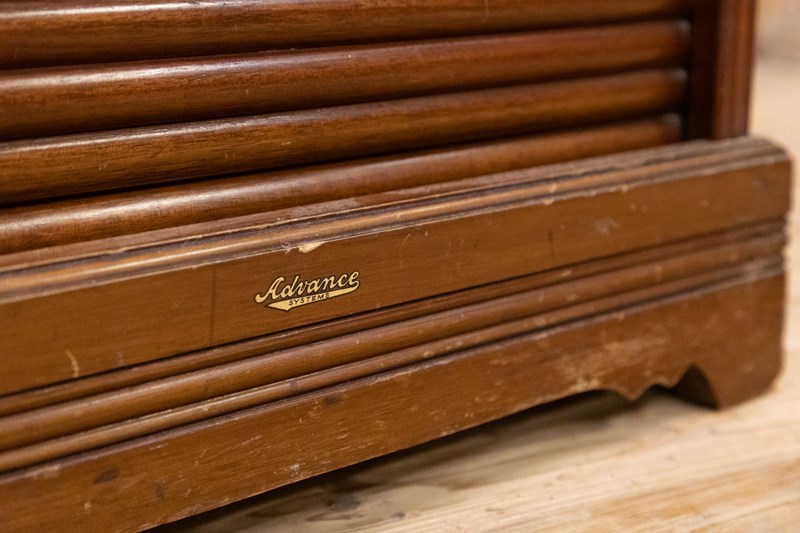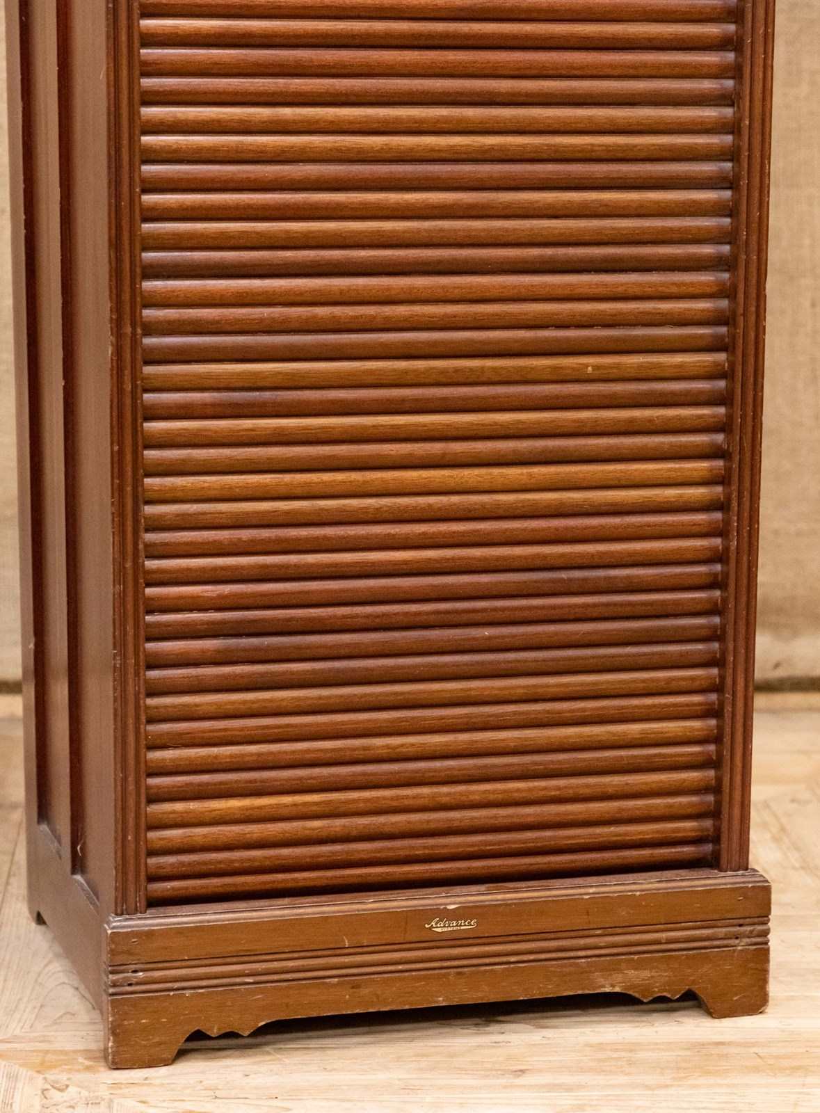 A fabulous early 20th century mahogany tambour fronted office or filing cabinet. The tambour or roller door opens to reveal a shelved interior with tray drawers. Complete with the original key and retiring the painted makers mark to the base, Advance Systems.