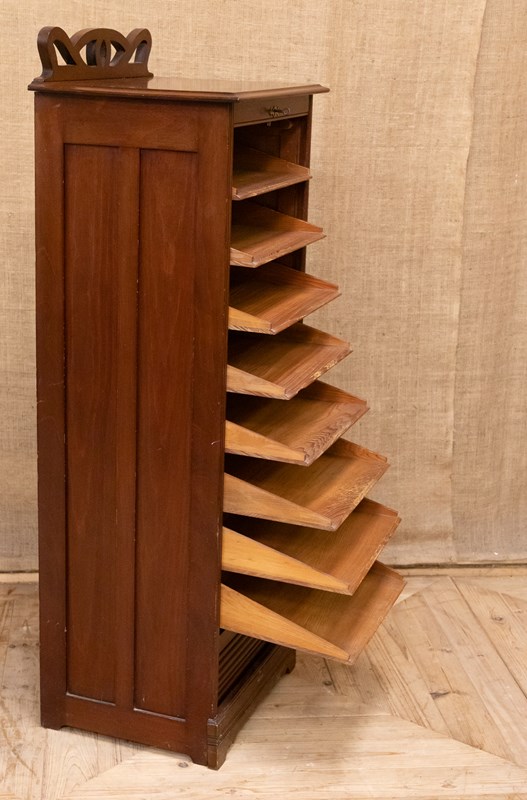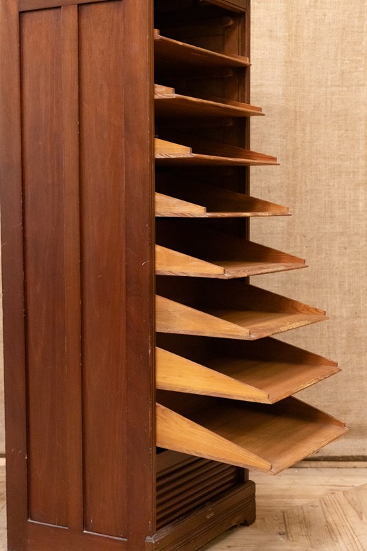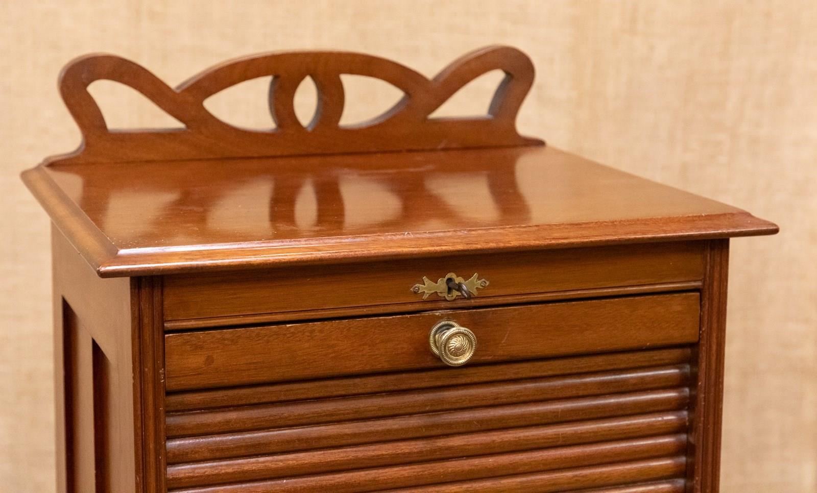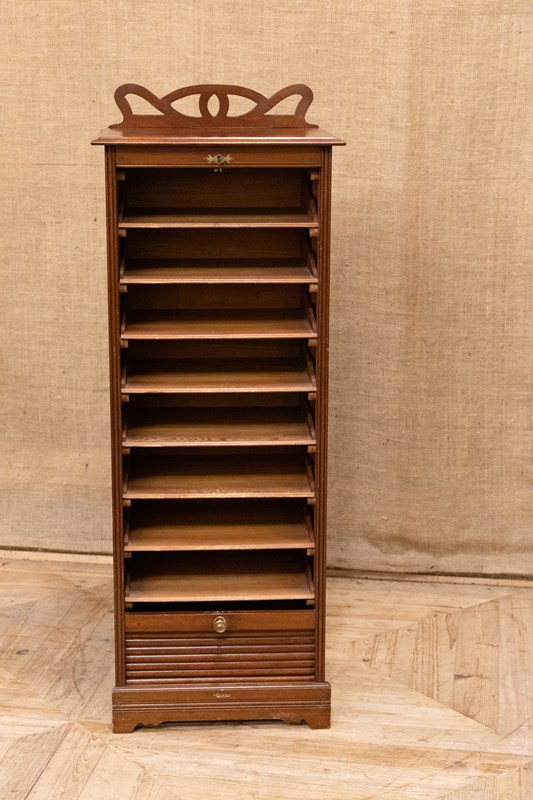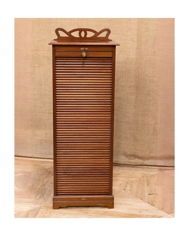 A fabulous early 20th century mahogany tambour fronted office or filing cabinet. The tambour or roller door opens to reveal a shelved interior with tray drawers. Complete with the original key and retiring the painted makers mark to the base, Advance Systems.