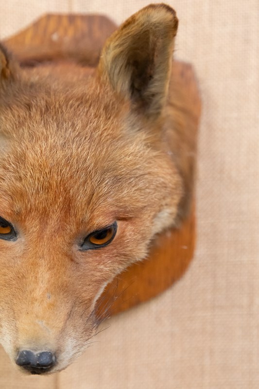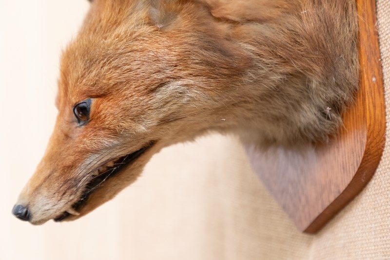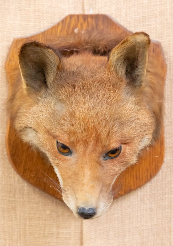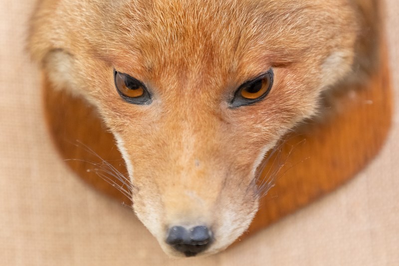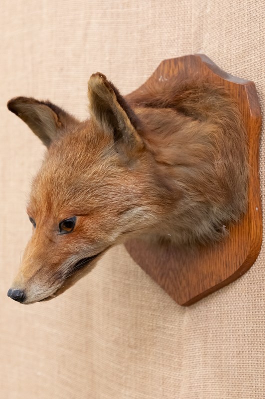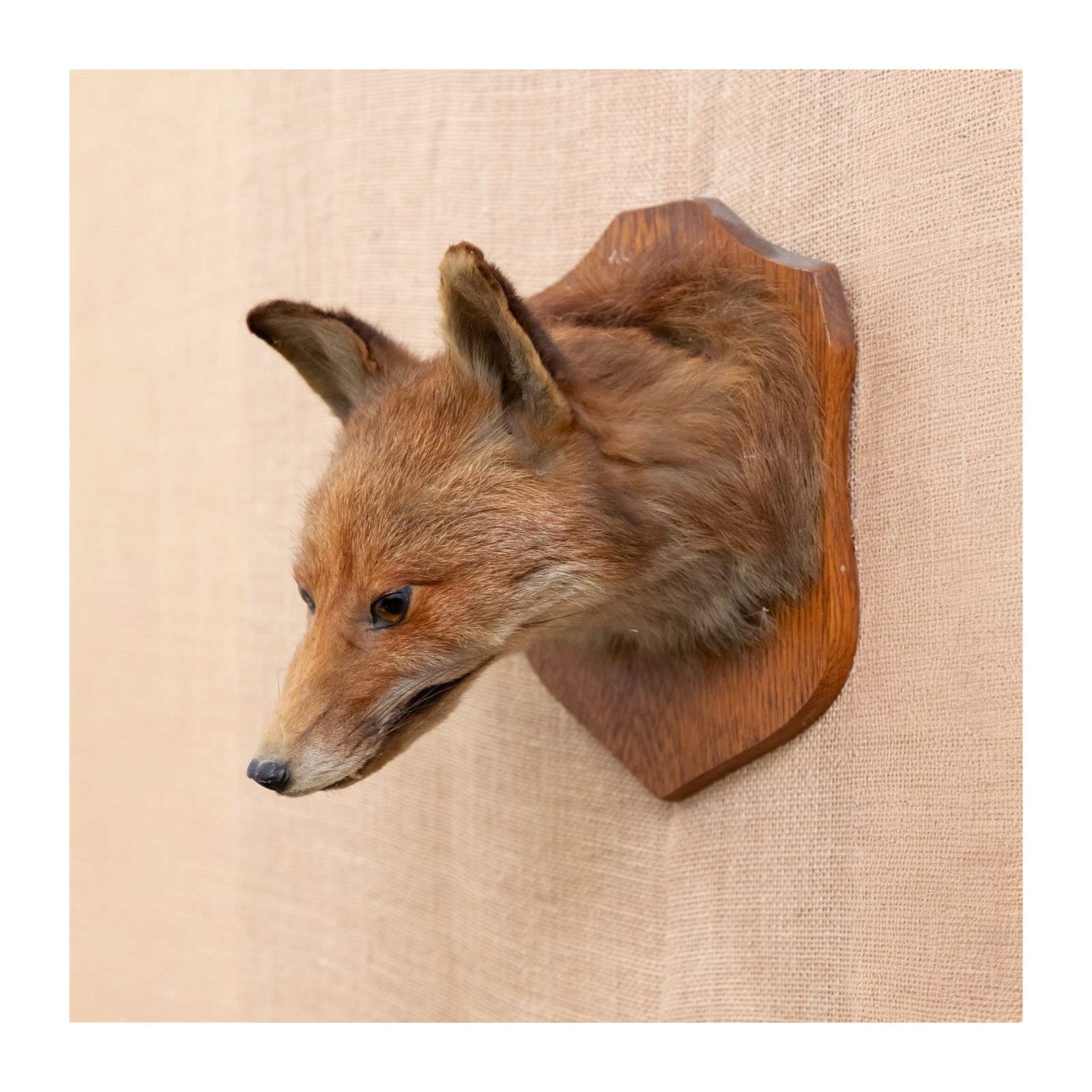 A fantastic late 19th century taxidermy fox mask on a golden oak shield mount. Mounted by F E Potter of Leicestershire.