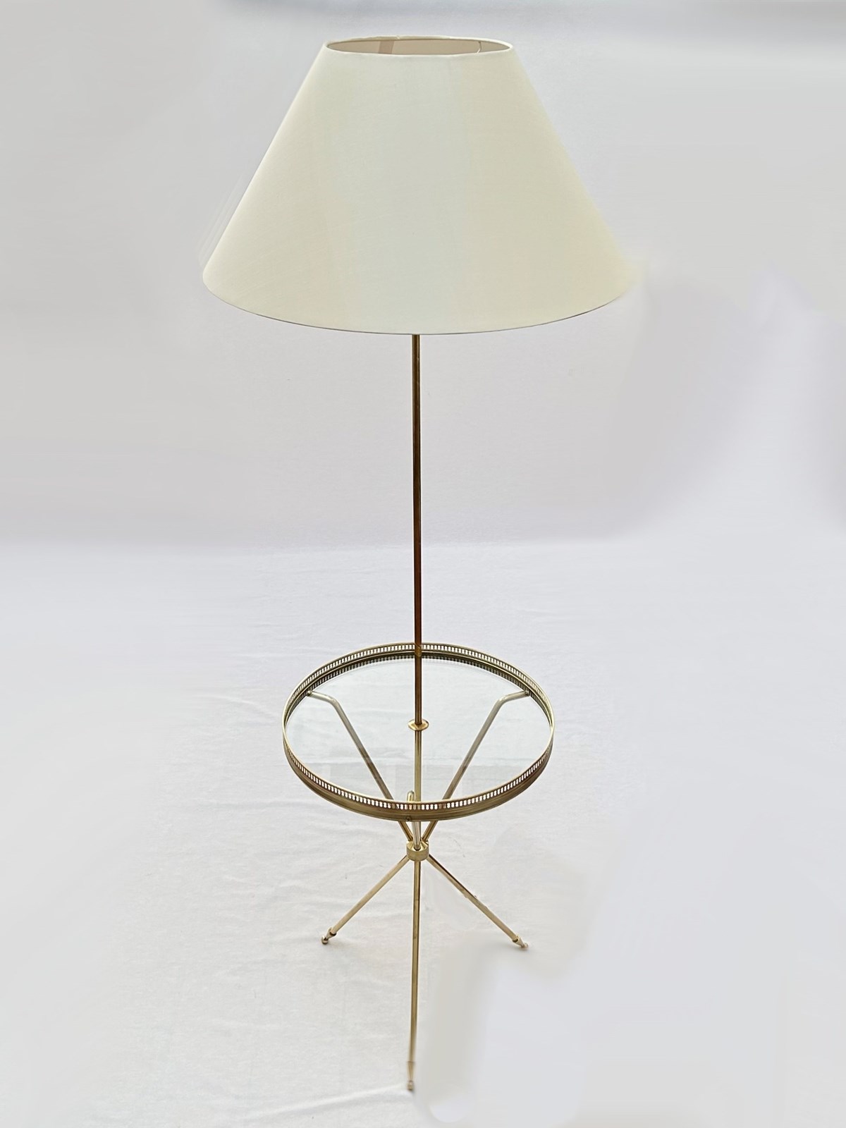 A brass standard lamp with attached glass tripod table in the style of Maison Bagues
