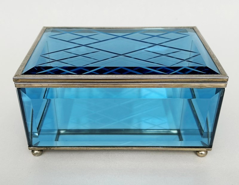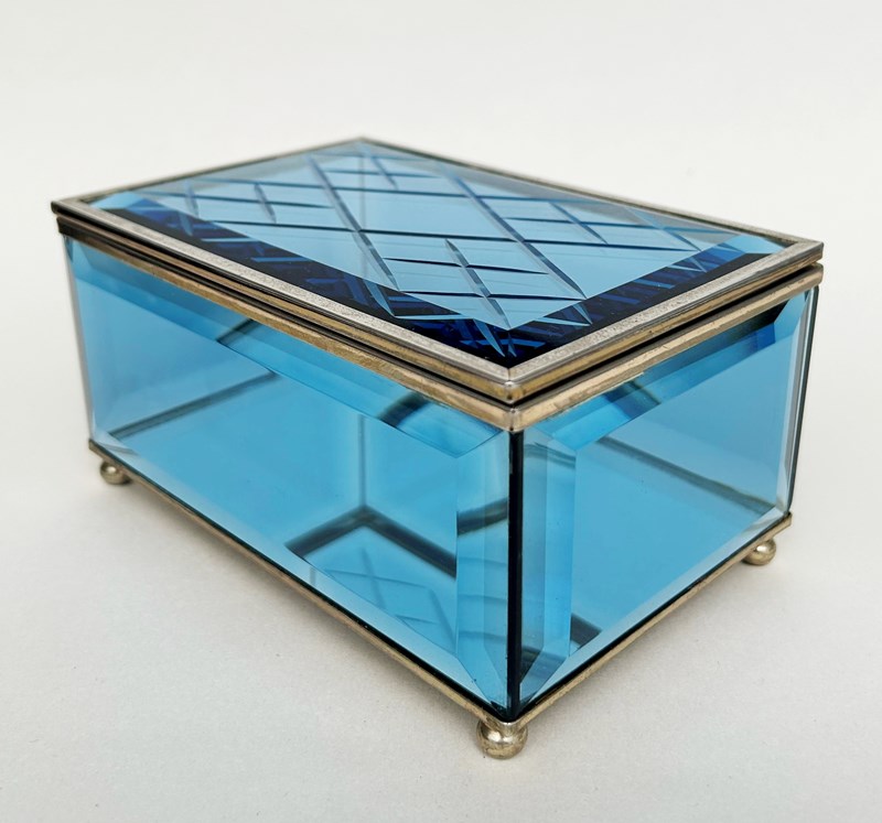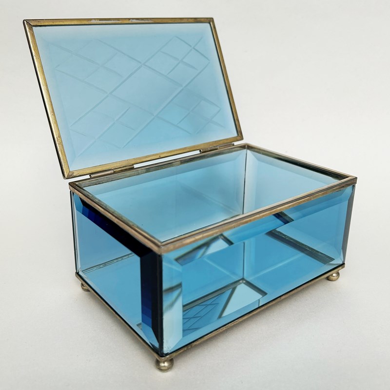 A blue etched glass, mirror and brass box