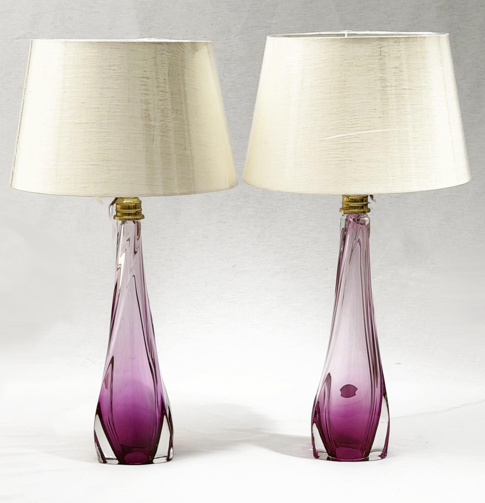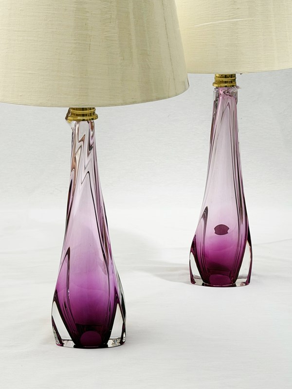 A pair of shaded pink crystal lamps by Val Saint Lambert