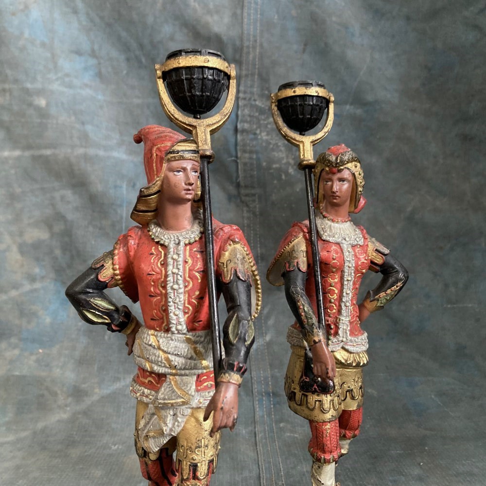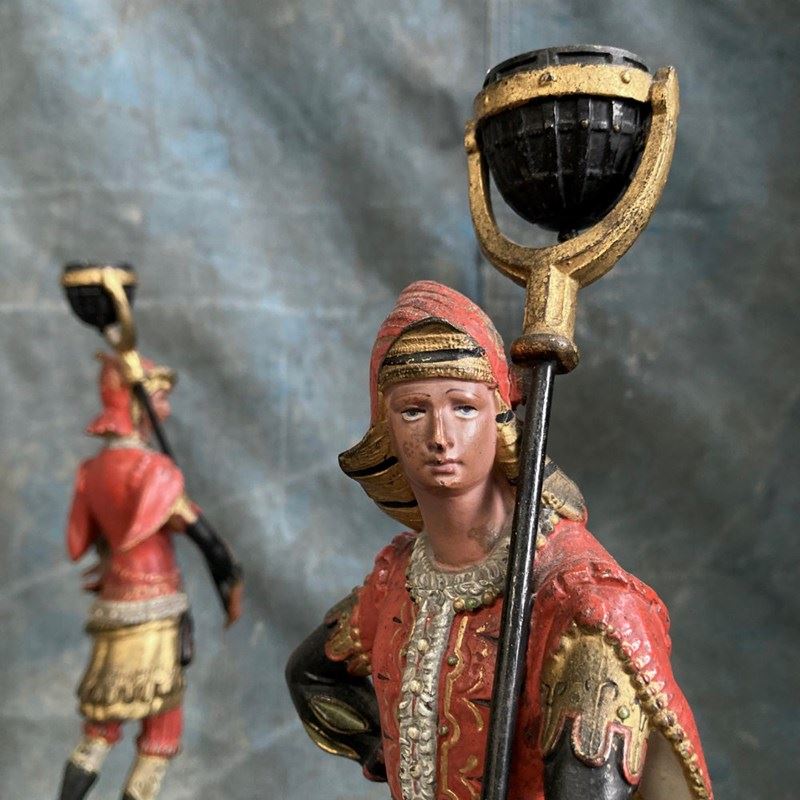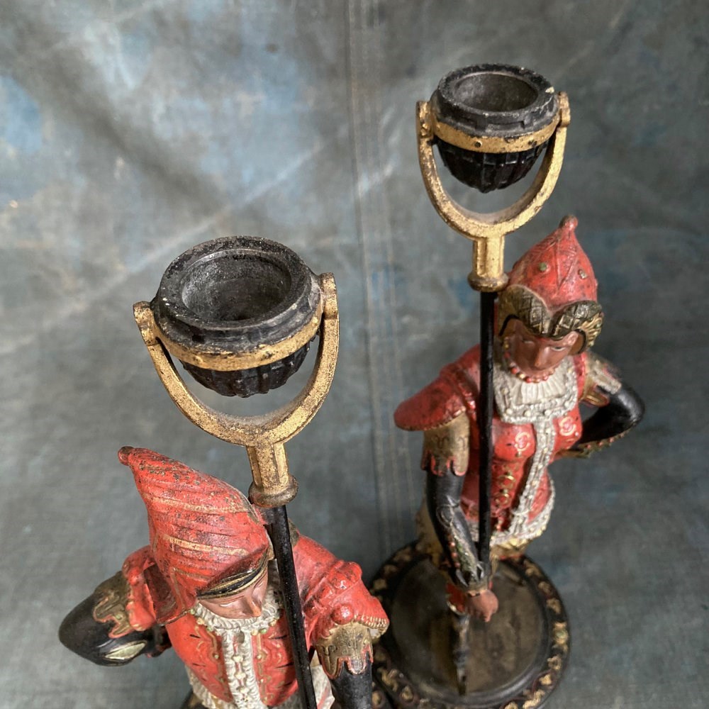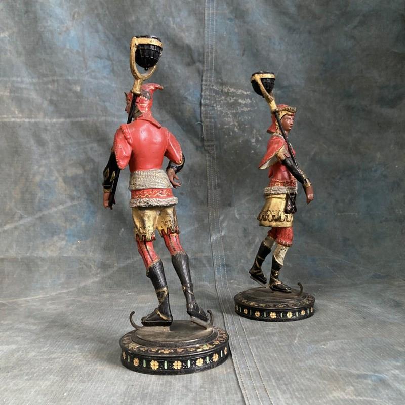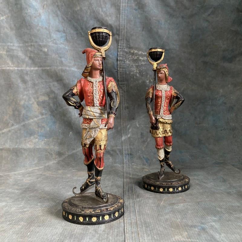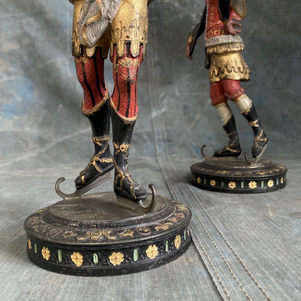 An unusual pair of cold-painted spelter candlesticks in the form of a man and woman dressed in exotic costume/livery and wearing ice skates. They have each been modelled so that they appear to be carrying torchieres or braziers on long staffs. It is in these that candles could be placed.